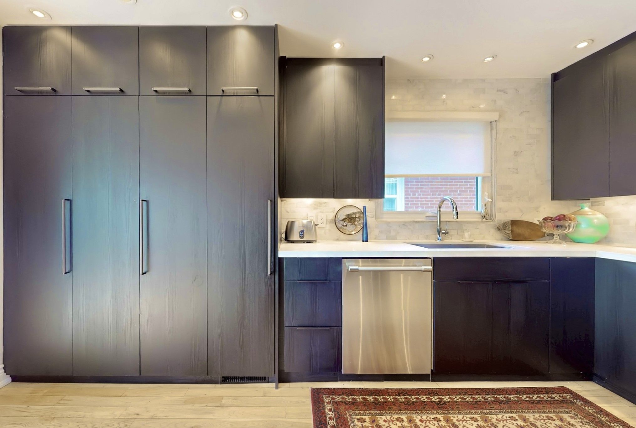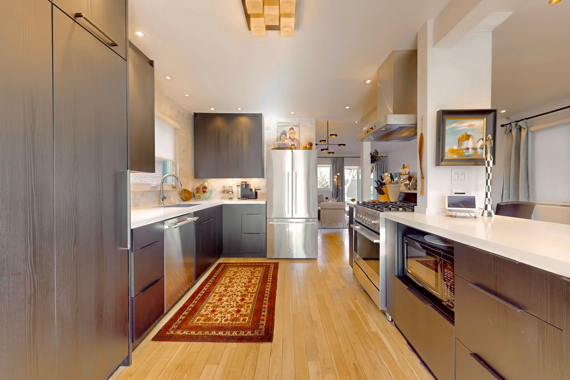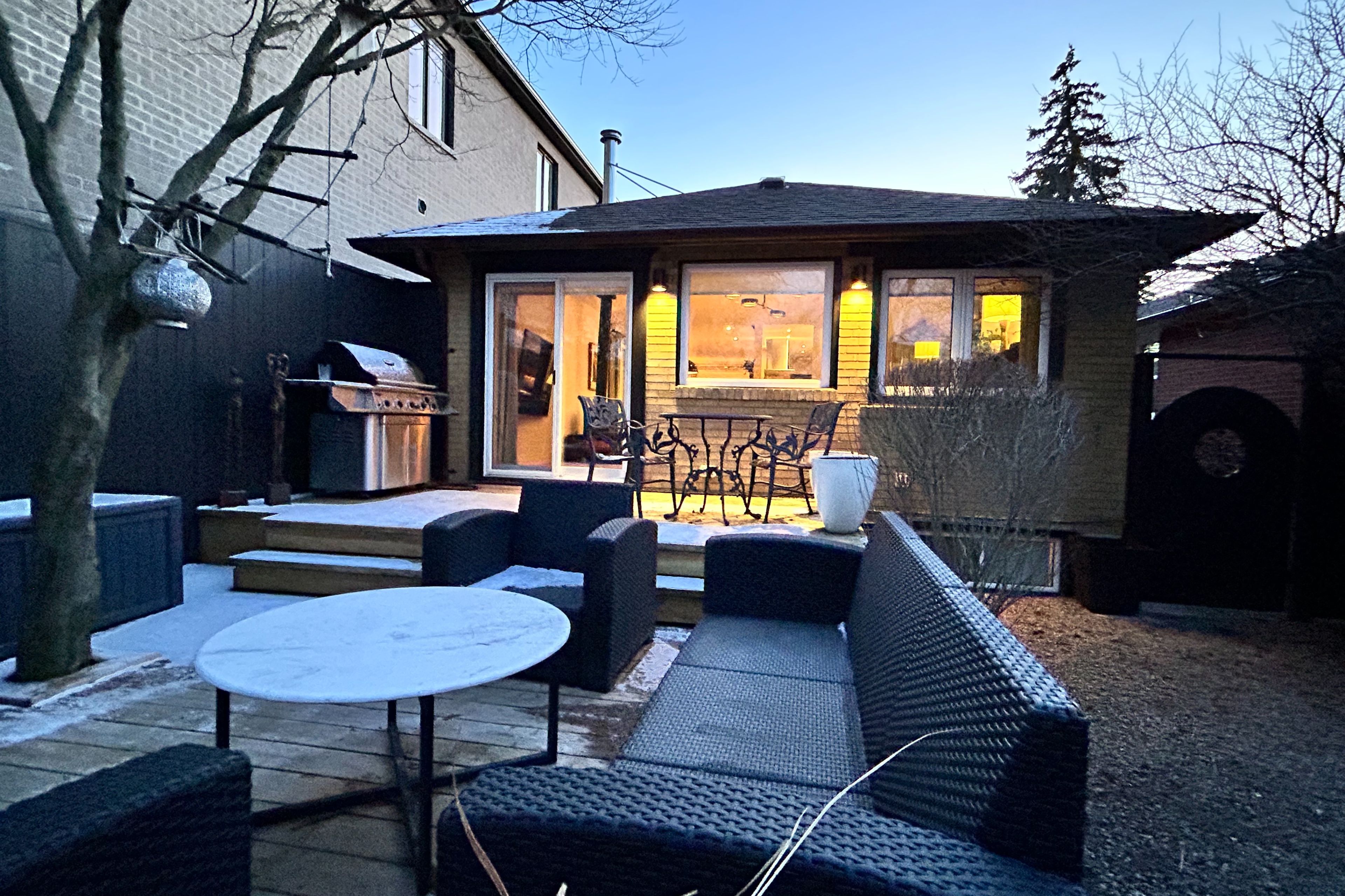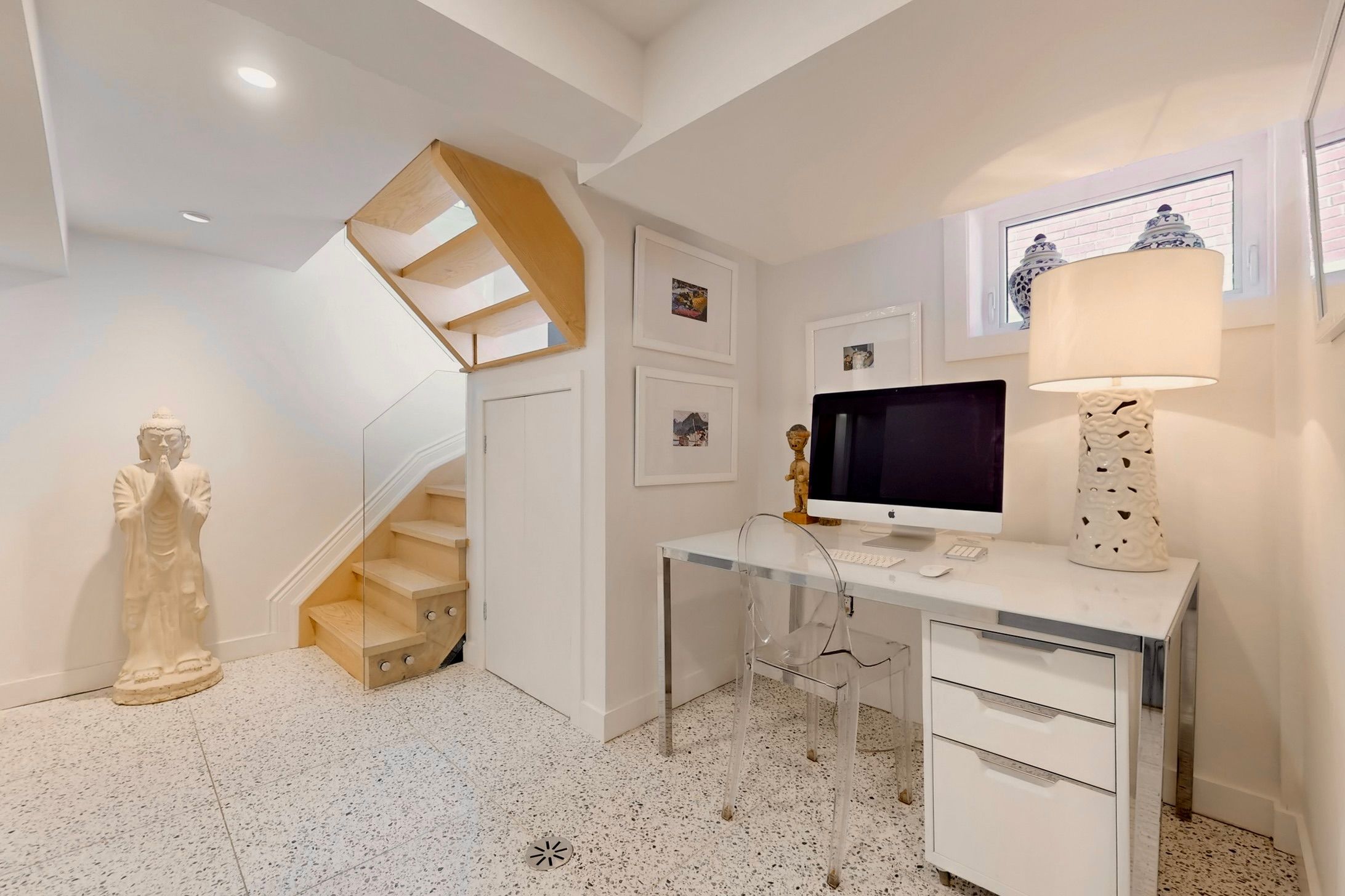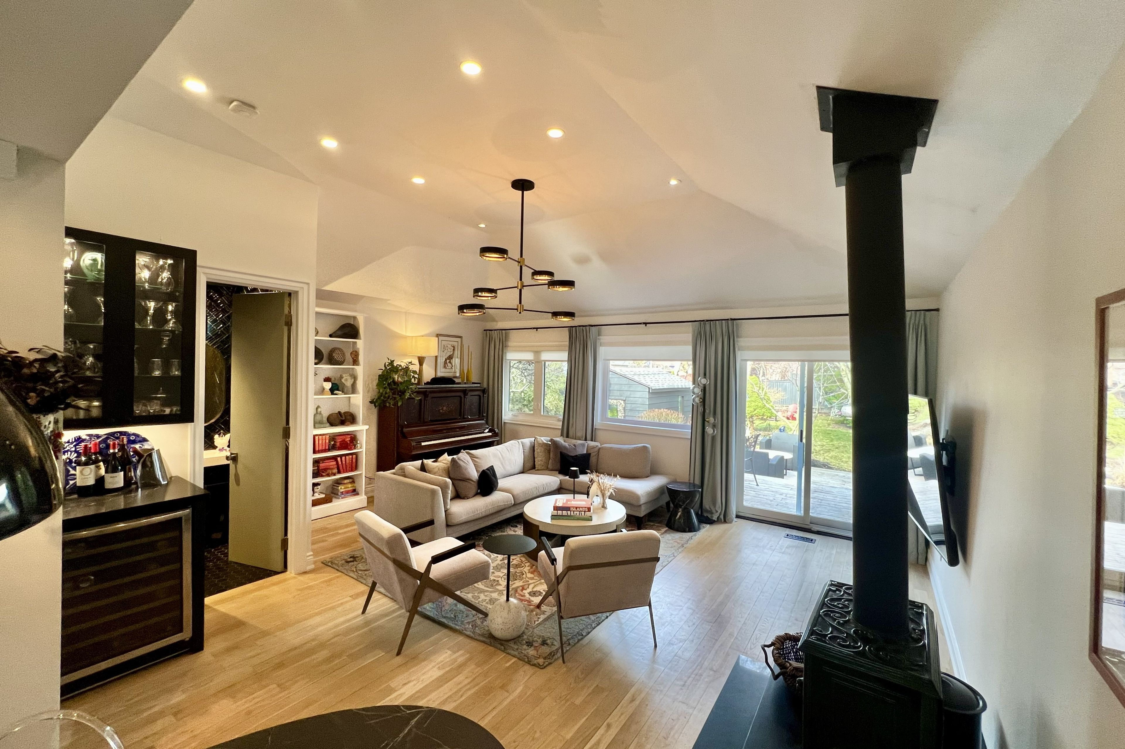 A rare opportunity to own a beautifully designed 2 bedroom bungalow currated for easy living and effortless entertaining. This bright, open concept home offers seamless flow between living, dining, and kitchen spaces, ideal for both everyday living and hosting. The main living area features a warm wood burning fireplace, built in bar, statement 2 piece bathroom and dedicated piano space, with large windows that fill the home with natural light, highlighted by a handcrafted leaded glass window that brings a bespoke architectural detail to the space. Both bedrooms include private ensuites with heated floors. The principal suite offers two closets, including a walk in. A separate office space adds flexibility for work or lifestyle needs. Thoughtfully designed for comfort and flow, the home maximizes every square foot. Outside, enjoy a mature private backyard, a charming cherry tree in the front yard, and a private driveway. Move in ready with quality features throughout, this well loved home combines warmth, function, and a truly special setting.