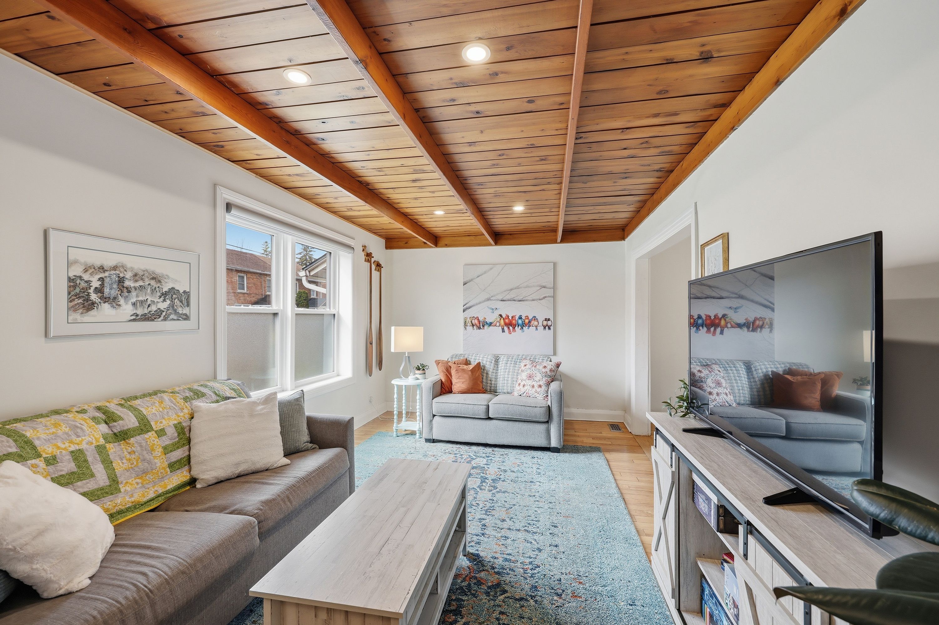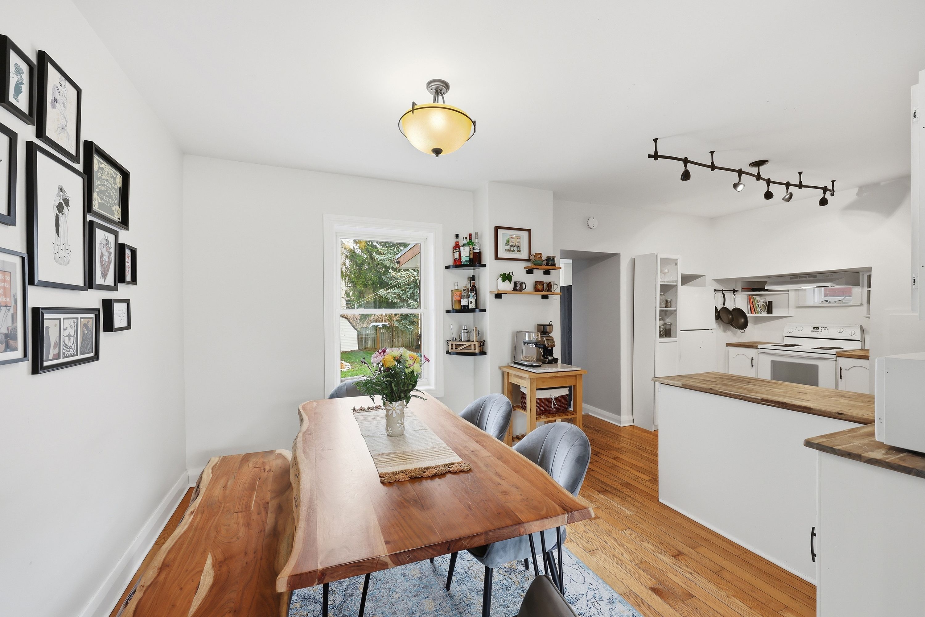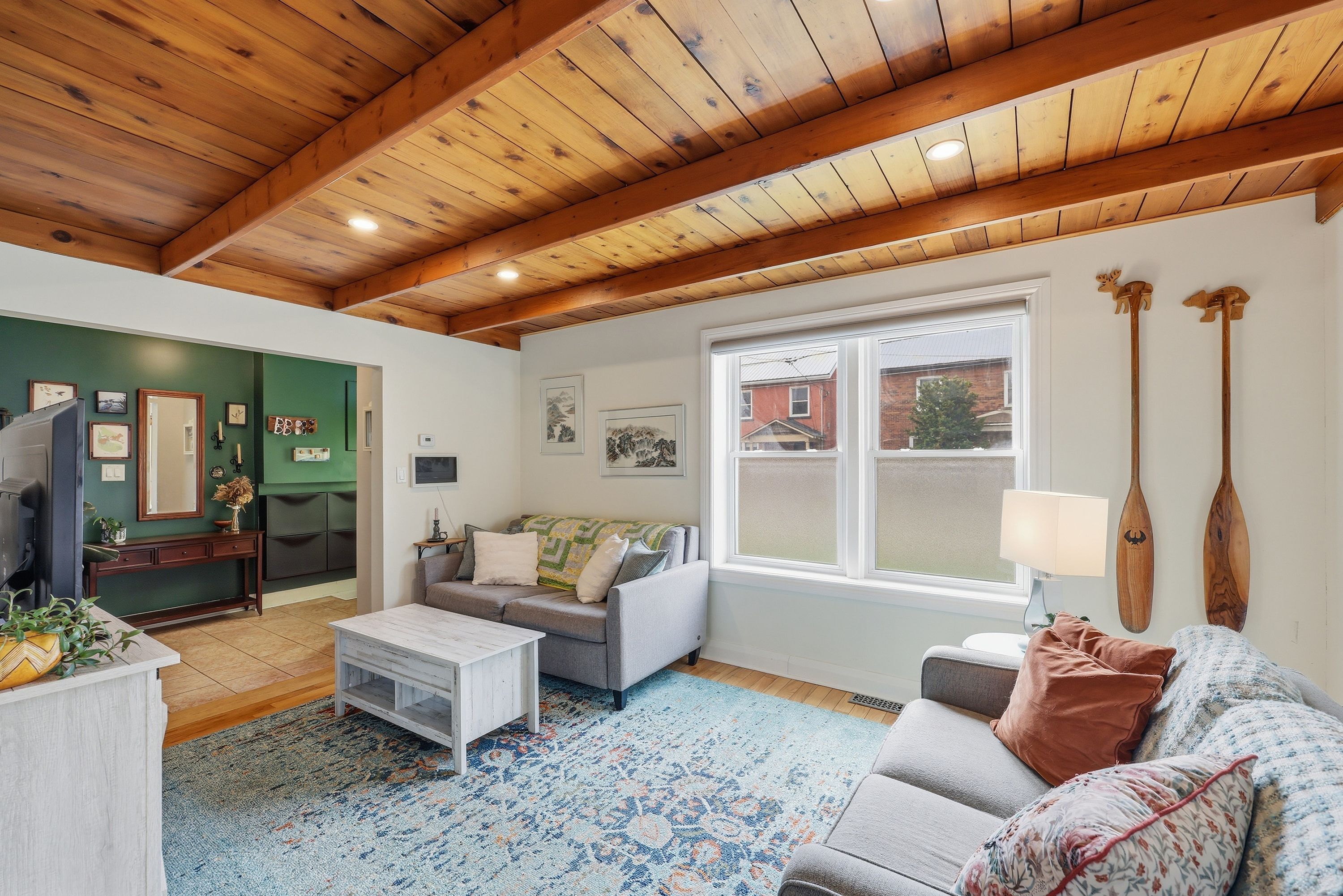 Full of character and thoughtfully updated, this all-brick semi-detached century home blends storybook charm with modern comfort. Step inside to bright, inviting spaces featuring oak hardwood floors and a functional layout that flows effortlessly throughout. The heart of the home is the open kitchen and dining area, leading into a warm and welcoming living room highlighted by a stunning wood ceiling that adds both character and depth. Upstairs, you'll find three well-sized bedrooms and an updated bathroom, offering flexible space for families, guests, or a home office. At the rear, a practical mudroom with main floor laundry provides direct access to the backyard-making everyday living easy and convenient. Outside, the large, recently landscaped yard is perfect for entertaining, gardening, or simply unwinding on the spacious deck ideal for summer evenings. The property also features a private rear parking space, a rare and valuable bonus in this central location. Backing onto regiopolis-notre dame catholic high school with no rear neighbours, this home offers a unique combination of lifestyle, outdoor space, and convenience close to schools, parks, and amenities. A move-in ready home with character, functionality, and room to enjoy both inside and out.