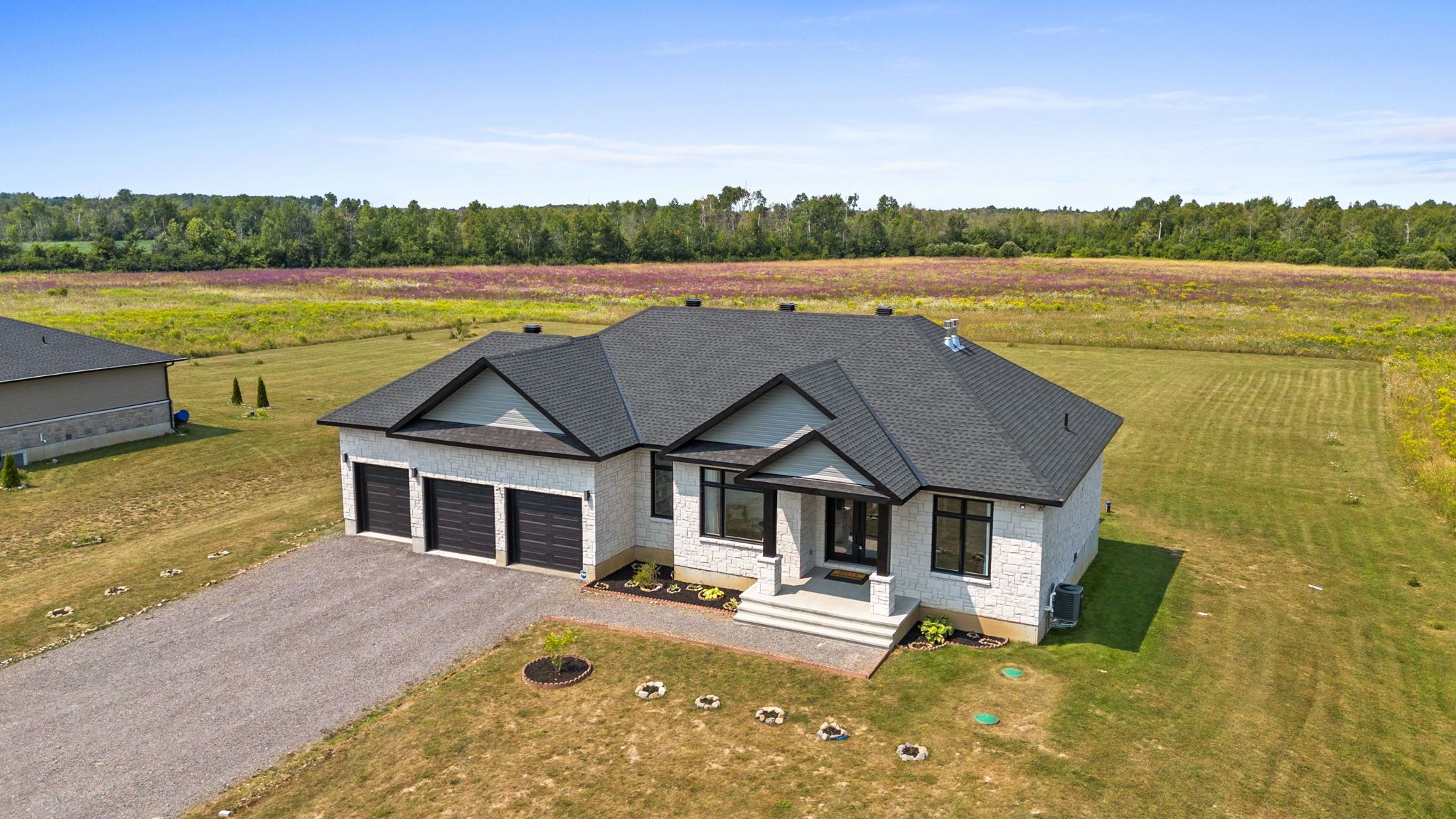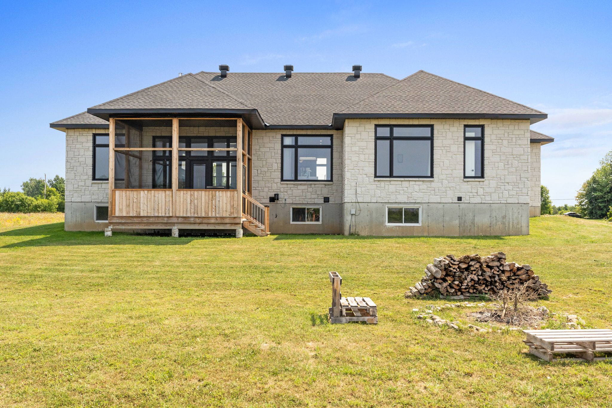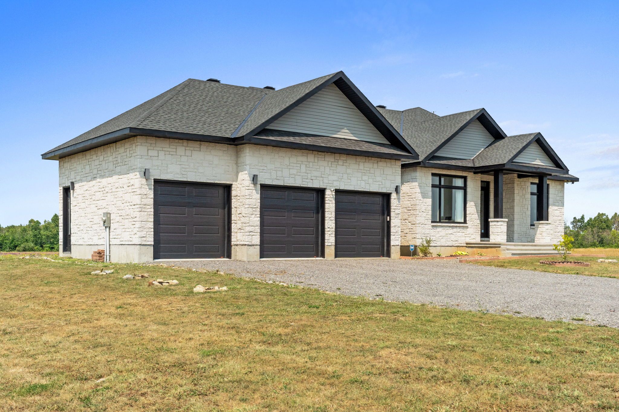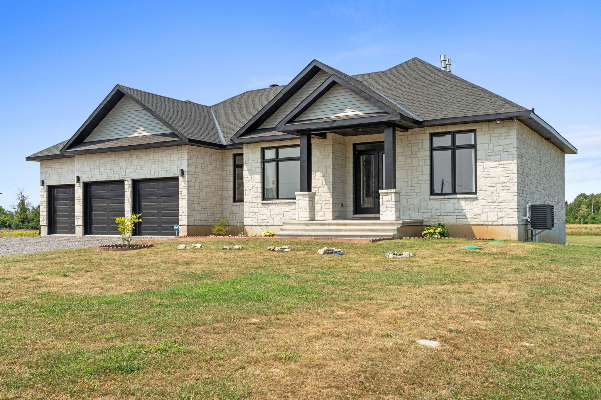 Welcome to this stunning all-stone 5-bedroom, 3-bathroom energy star-rated bungalow (2023), blending timeless style with modern comfort, set on a private 2-acre lot just minutes from historic merrickville. With10ft ceilings on main level and 9ft on lower level. Step inside the beautifully tiled entry and you're greeted with a bright, open layout where the gorgeous chefs kitchen and great room are the heart of the home. Dream kitchen for any cook, custom tall cabinetry, quartz countertops, massive island & breakfast bar, a second sink, plus top-of-the-line stainless appliances. Upgrades include gorgeous light fixtures, beautiful white textured tile backsplash, pot filler tap above stove, and pantry. The great room's 11 ft ceilings, huge windows, stunning hardwood floors, and cozy fireplace create a warm, welcoming space for living and entertaining. The spacious primary suite a walk-in closet and a spa-inspired 5-piece ensuite with a soaker tub and glass shower. Two more bedrooms, plus a flexible room perfect for a home office or den, offer plenty of options for family or guests. A main floor laundry room and a mud room for more functionality. Professionally finished lower level with over 2,000 sq ft, featuring large family room with fireplace, full kitchen/bar, perfect for hosting gatherings or accommodating extended family. Two additional large bedrooms, full bathroom and a huge rec room complete. Outdoors, unwind in the huge screened-in muskoka room while taking in beautiful country views, or enjoy the open yard, future pool, gardens, play, or simply soaking in the peace and quiet. Massive 3-car garage tons room for vehicles, storage, etc. Boasting over 4,000 square feet of finished living space, this home offers the perfect blend of quality, comfort, and privacy, just a minutes from the historic rideau river and town of merrickville with artists, restaurants, shops, dining, waterfall and rideau boat locks. This is truly peaceful paradise, you don't want too miss.