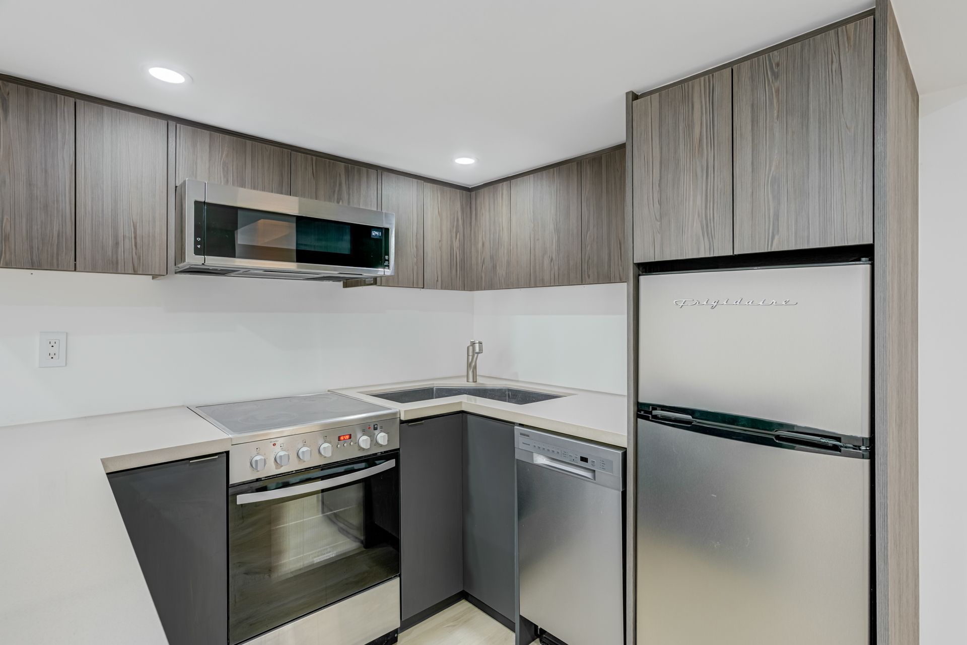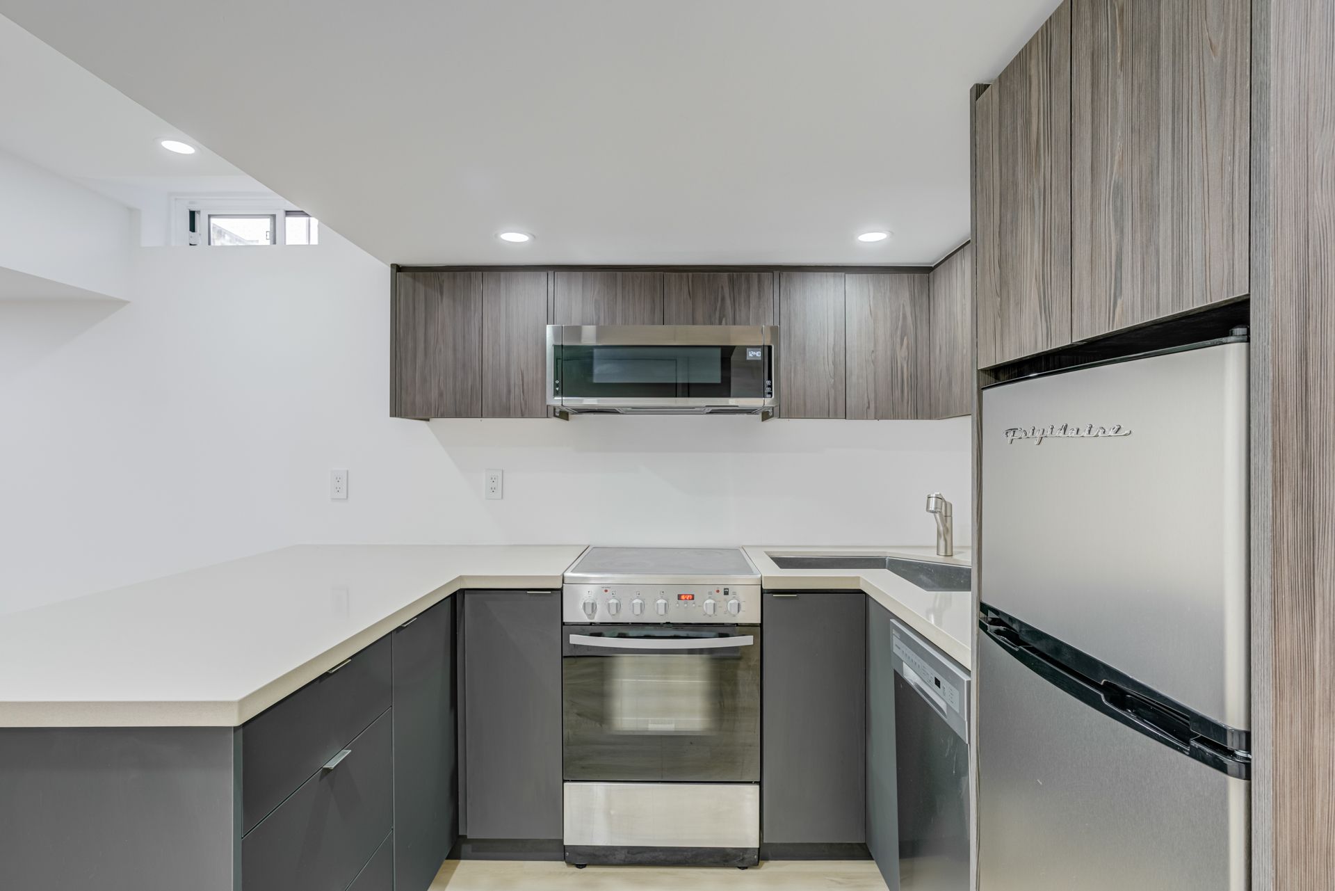 • Modern kitchen with quartz countertops and stainless steel appliances.