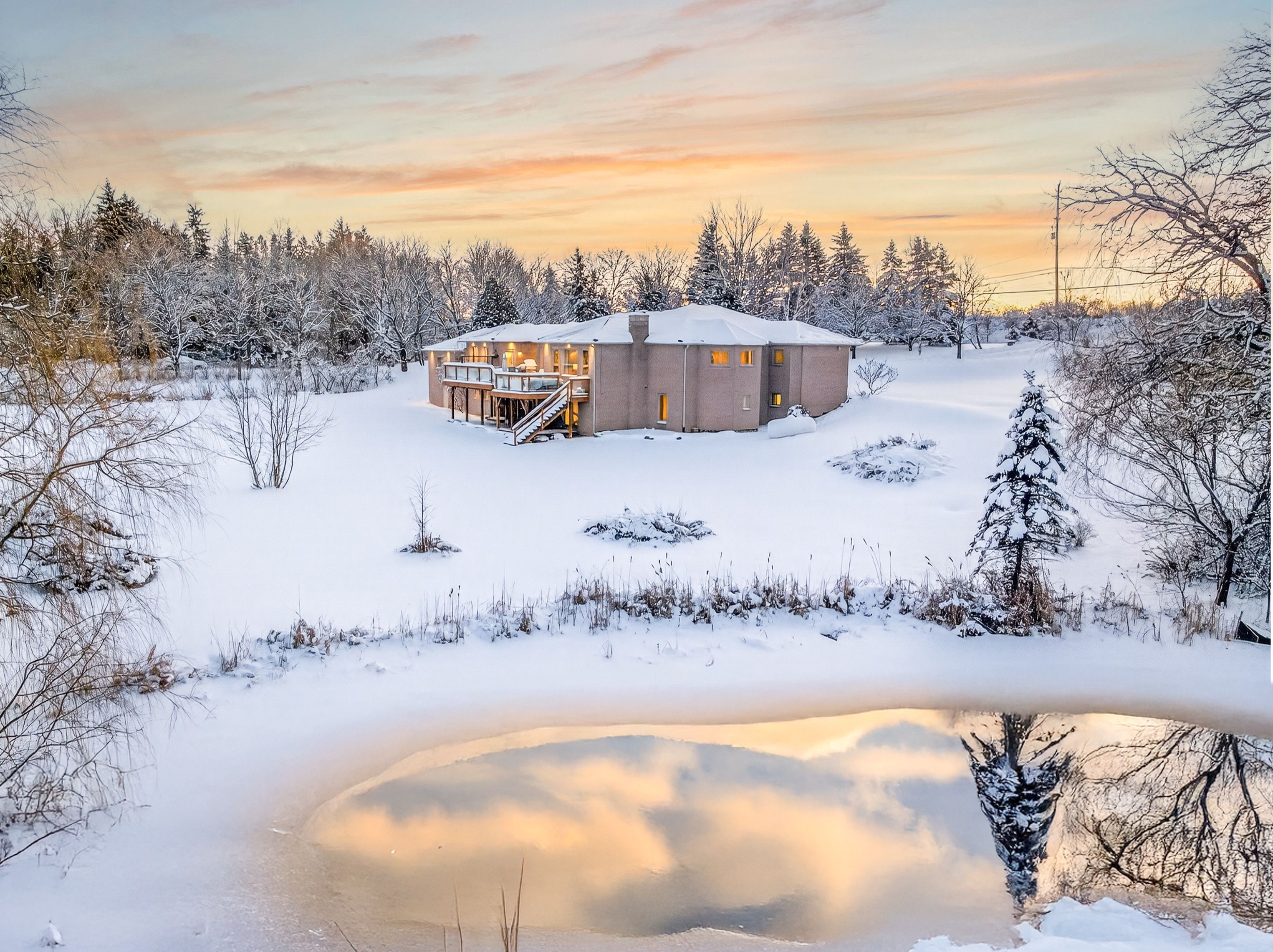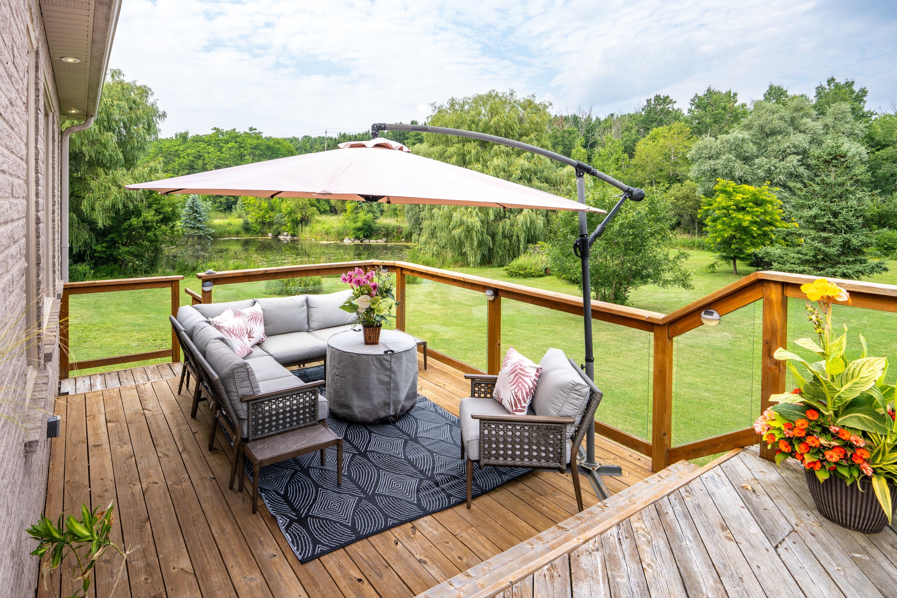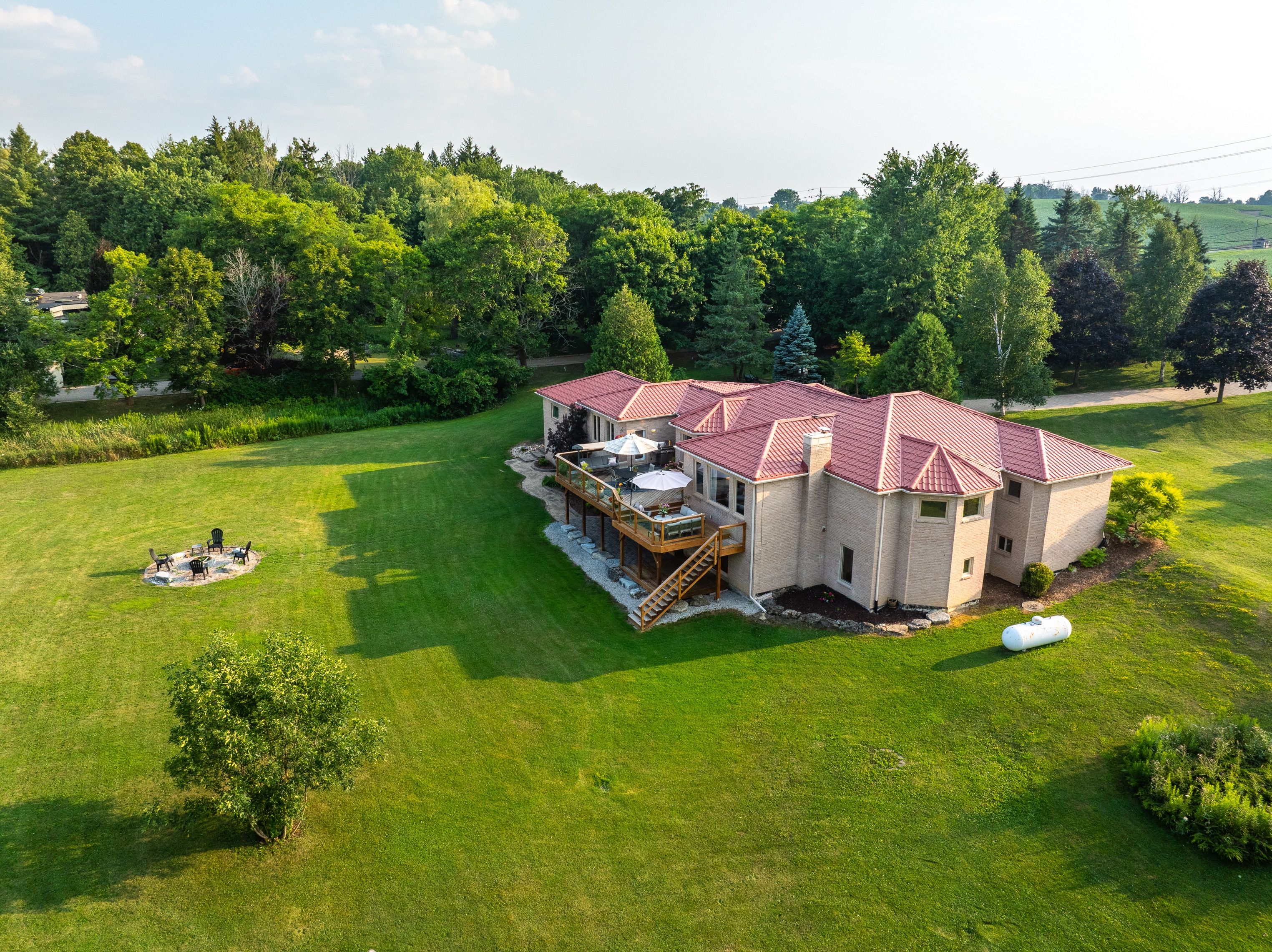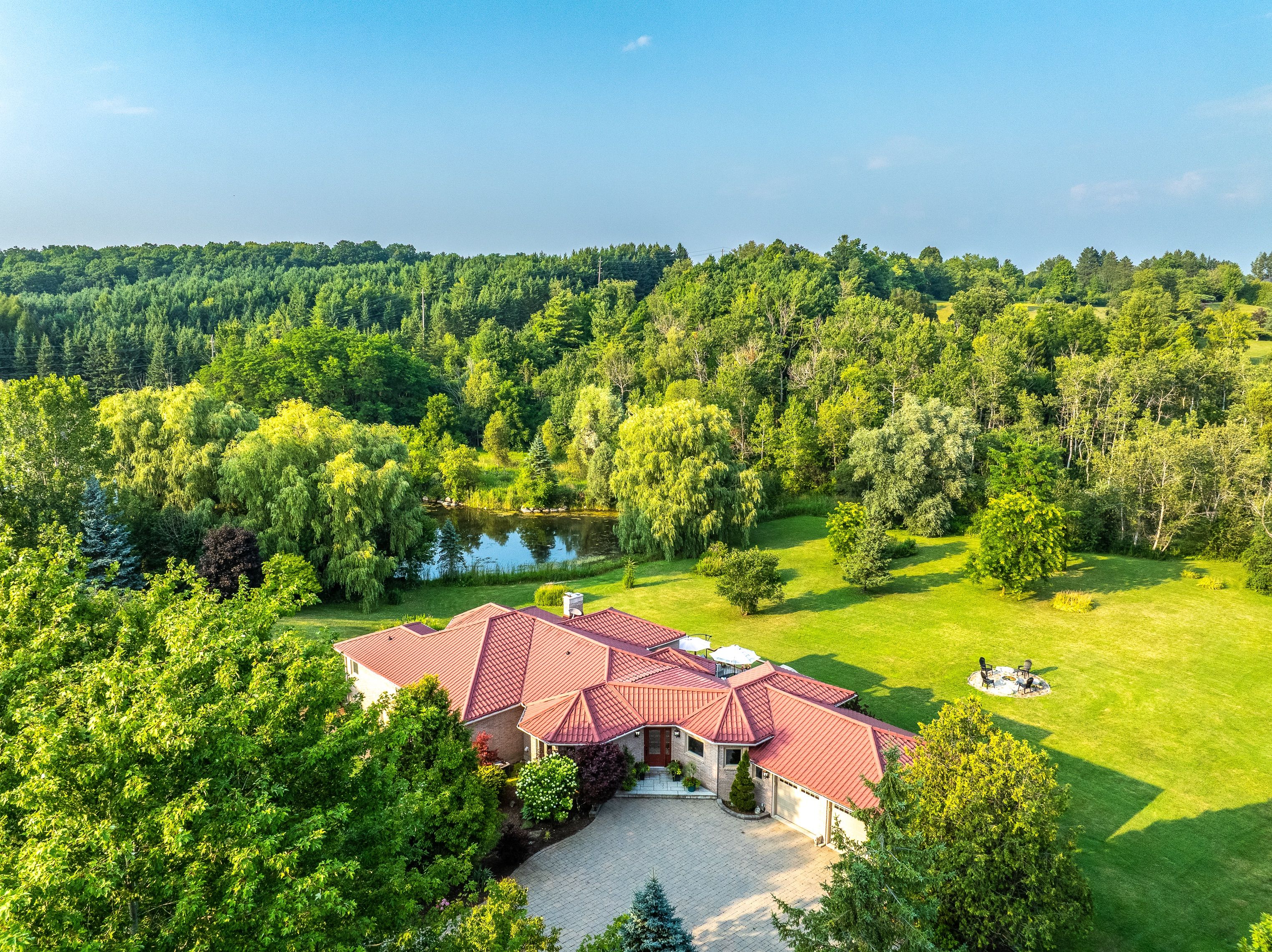 Welcome to this spacious and beautifully updated 3+2 bedroom multigenerational opportunity home offering privacy, functionality, and natural serenity just minutes from town. Nestled on a picturesque lot backing onto humber river catchment area and mature forest, this home features a thoughtfully landscaped backyard oasis complete with multi-level decks, a pond, perennial gardens, and fruit trees including apple and cherry. Step into the grand open-concept foyer with ceramic flooring that flows into a front den perfect for a home office with french doors and large windows overlooking the front gardens. The main level boasts freshly stained hardwood floors, pot lights, and fresh paint throughout. The versatile music room/dining room includes a coffered ceiling and rounded windows for a touch of elegance. The chefs kitchen features ceramic floors, centre island with breakfast bar, a large walkthrough pantry, and stainless steel appliances. The breakfast area provides garage access and a walk-out to the expansive deck, overlooking the tranquil backyard. The living room offers a warm and inviting atmosphere, featuring large sun-filled windows, and a classic wood-burning fireplace framed by custom built-in cabinetry perfect for both cozy nights in and elegant entertaining. Its thoughtful layout and timeless finishes provide a comfortable space that seamlessly blends charm and functionality. The primary bedroom impresses with double doors, walk-in closet, and 4-piece ensuite, while secondary bedrooms offer large closets, beautiful garden views and ample natural light. The newly renovated basement features new concrete flooring throughout, 3-piece roughed-in kitchen & washroom, laundry room, and two separate entrances ideal for in-laws, rental potential, or extended family use. The basement is ready for your personal touch. Only 5 minutes to king village, schools, shopping, and restaurants, this home combines true country charmwith urban convenience.