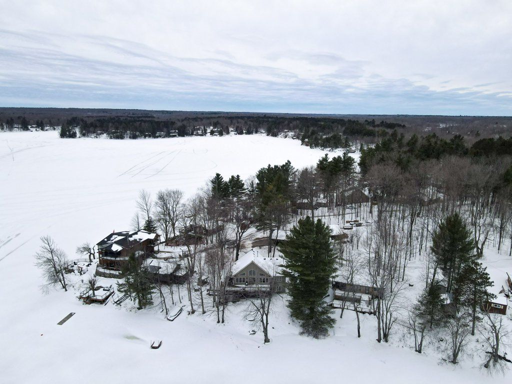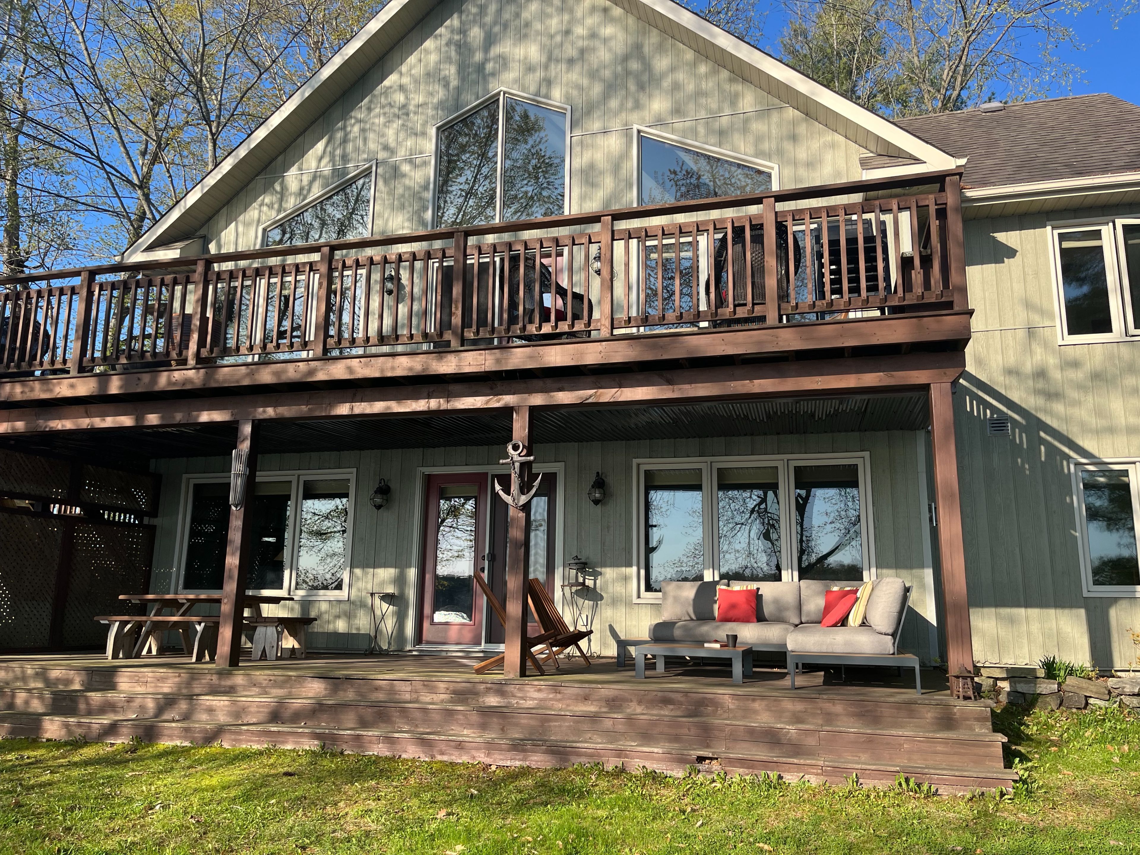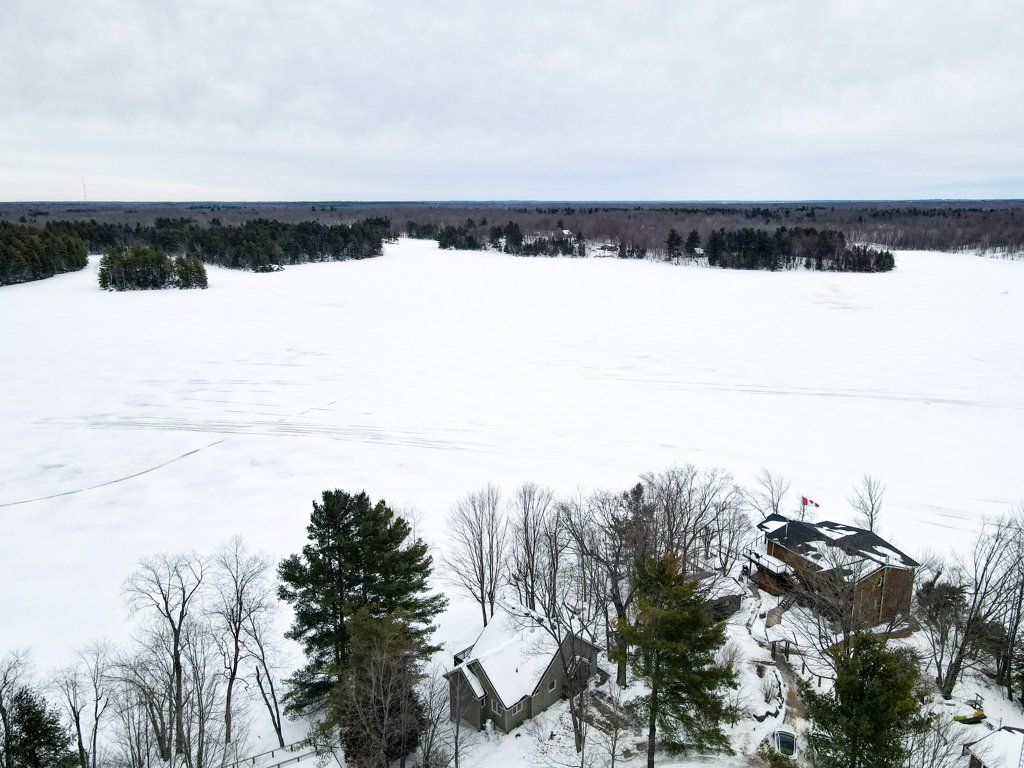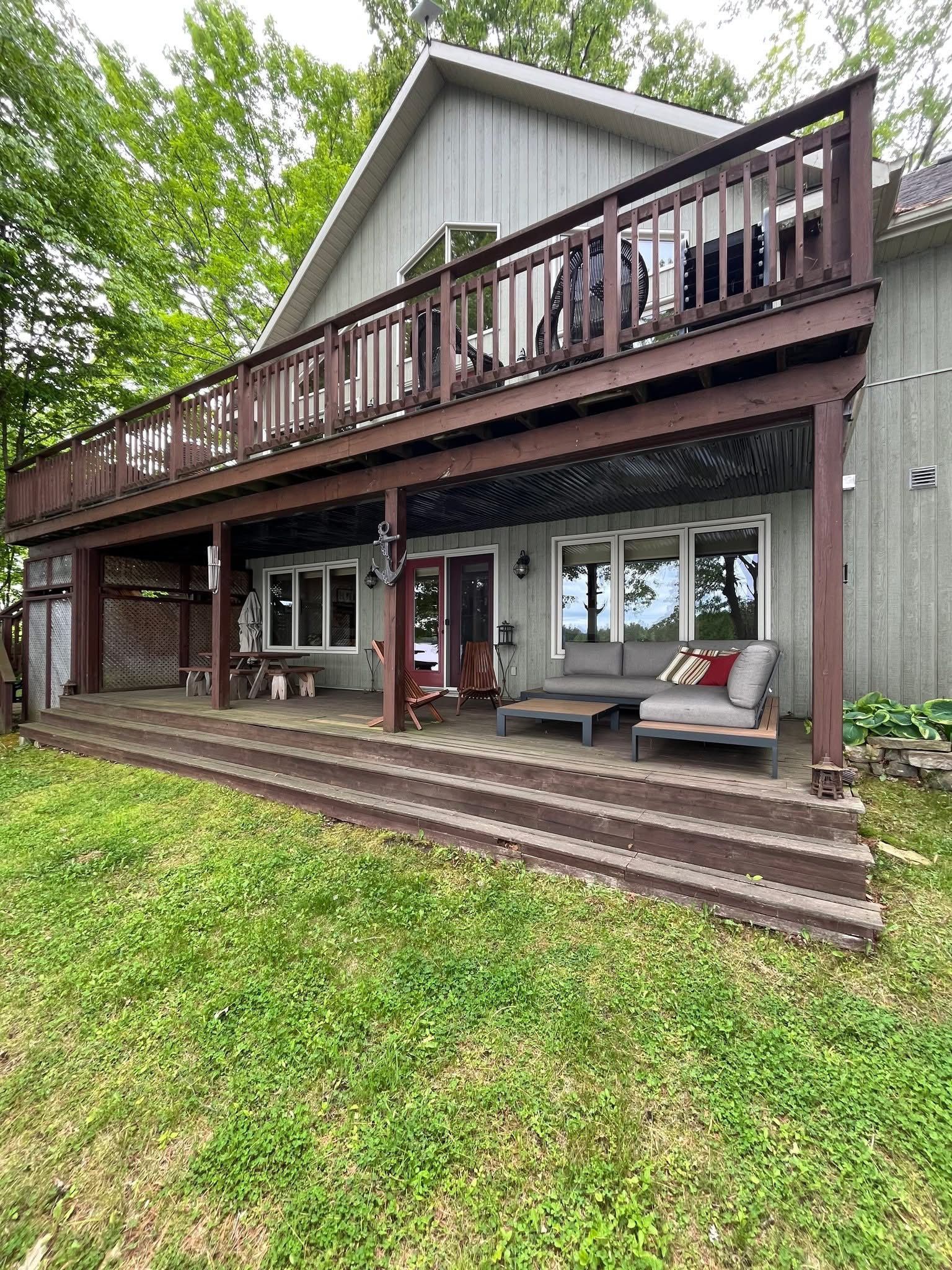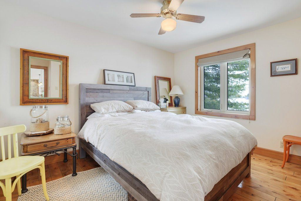 Welcome to this modern lakefront cottage retreat, perfectly designed to capture stunning waterfront views and year-round enjoyment. Set on a private lake & surrounded by mature trees, this property offers exceptional privacy along with the convenience of year-round road access. A beautiful sandy beach and dock create the perfect setting for swimming, boating, and relaxing by the water. The main level features two bedrooms & full bathroom w/heated flooring , along w/a bright and inviting open-concept living space. The well-appointed kitchen includes a breakfast bar overlooking the lake, a walk-in pantry, & dedicated eating area. A welcoming family room with wood-burning fireplace completes the space, creating the perfect gathering area while enjoying scenic lake views through large picture windows that flood the home with natural light. The fully finished walk-out lower level offers excellent additional living space w/a large bedroom, full bathroom, second family room, laundry area, & ample storage-ideal for guests or extended family. Outdoor living is exceptional with two levels of entertaining space. A large upper balcony runs the full width of the home, offering plenty of room for seating & enjoying elevated views of the lake. Below, the covered patio provides a comfortable outdoor lounge area w/sliding doors connecting to the lower level. The shoreline features a beautiful sandy beach with a gentle entry into the water, creating an ideal space for swimming, lounging in the sun, or enjoying time by the lake with family & friends. The dock provides easy access for boating & waterfront recreation. The exterior features vertical hardboard siding, giving the home a rustic yet modern cottage feel. This well-maintained waterfront property on a private lake is the perfect four-season getaway or full-time residence, combining privacy, natural beauty, and year-round accessibility while maximizing light, space, and breathtaking views. 24 hrs irrevocable on all offers.