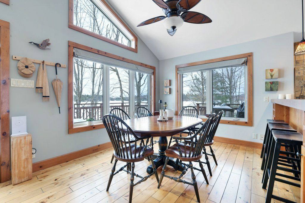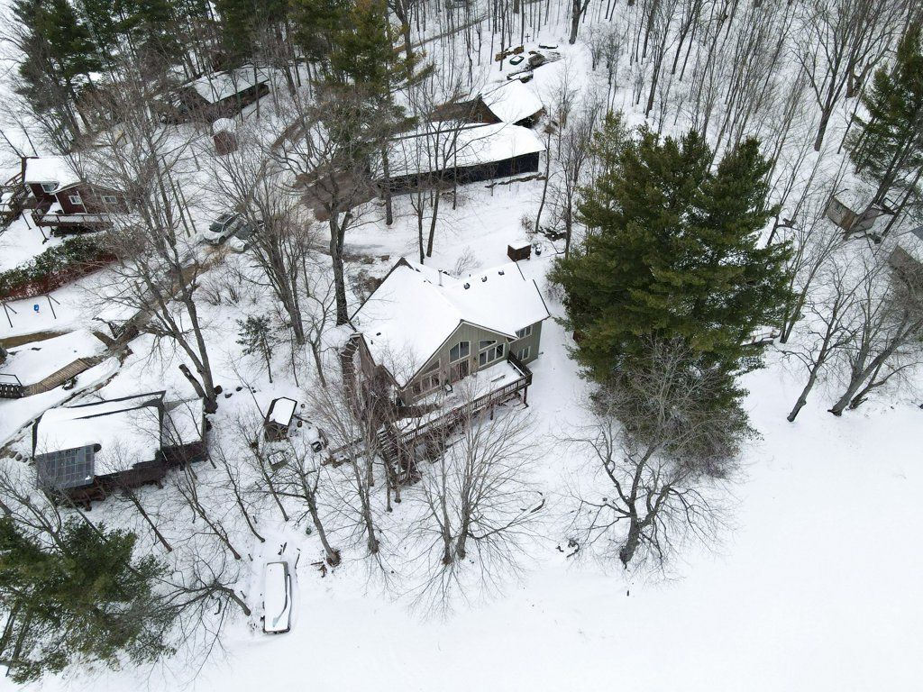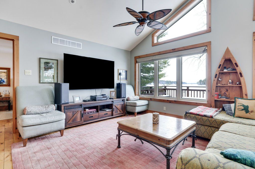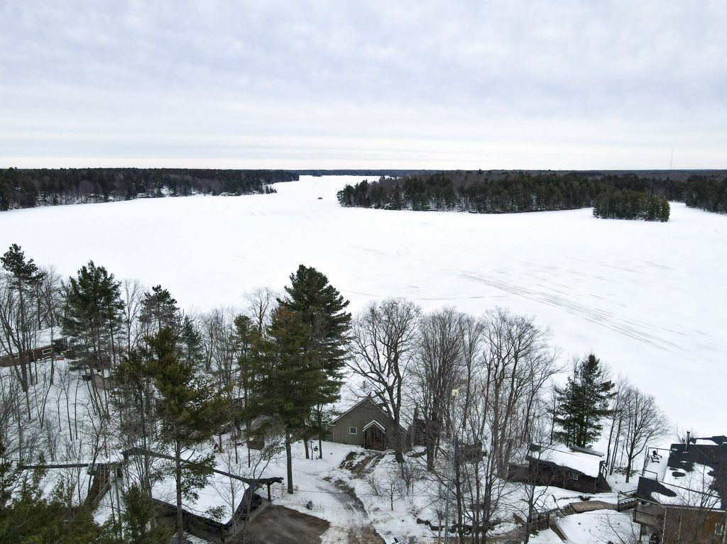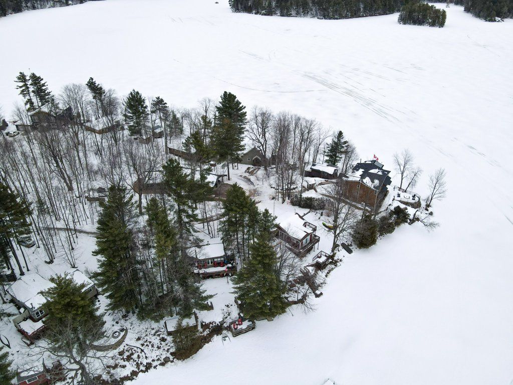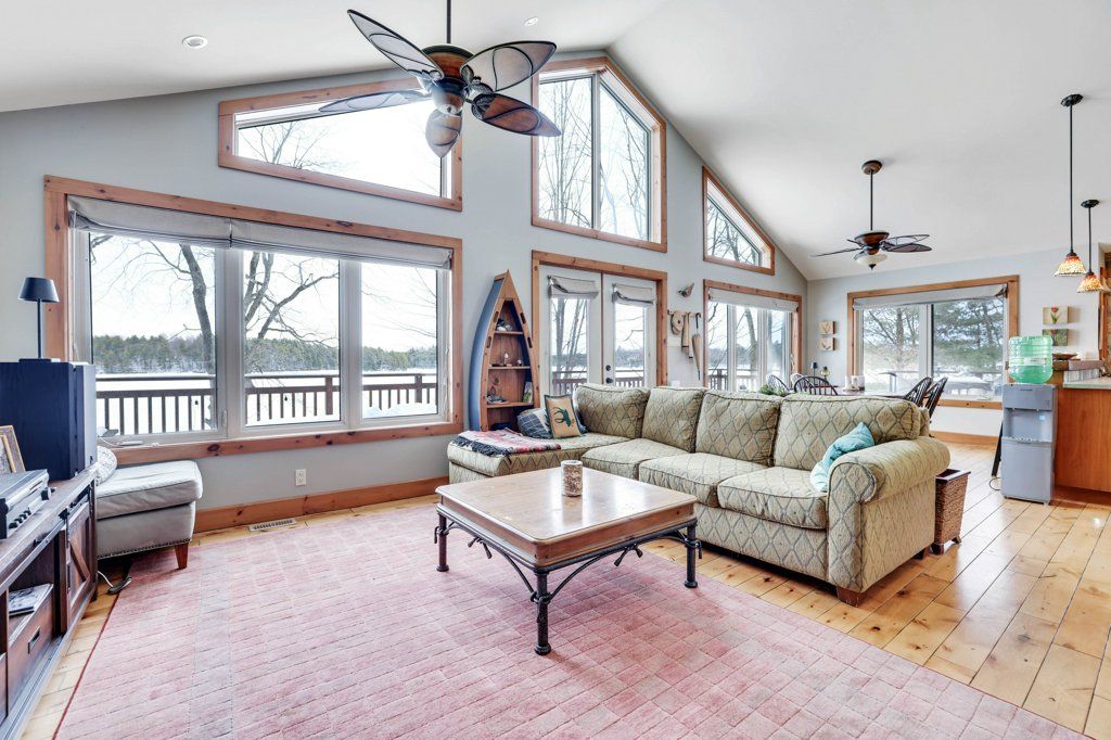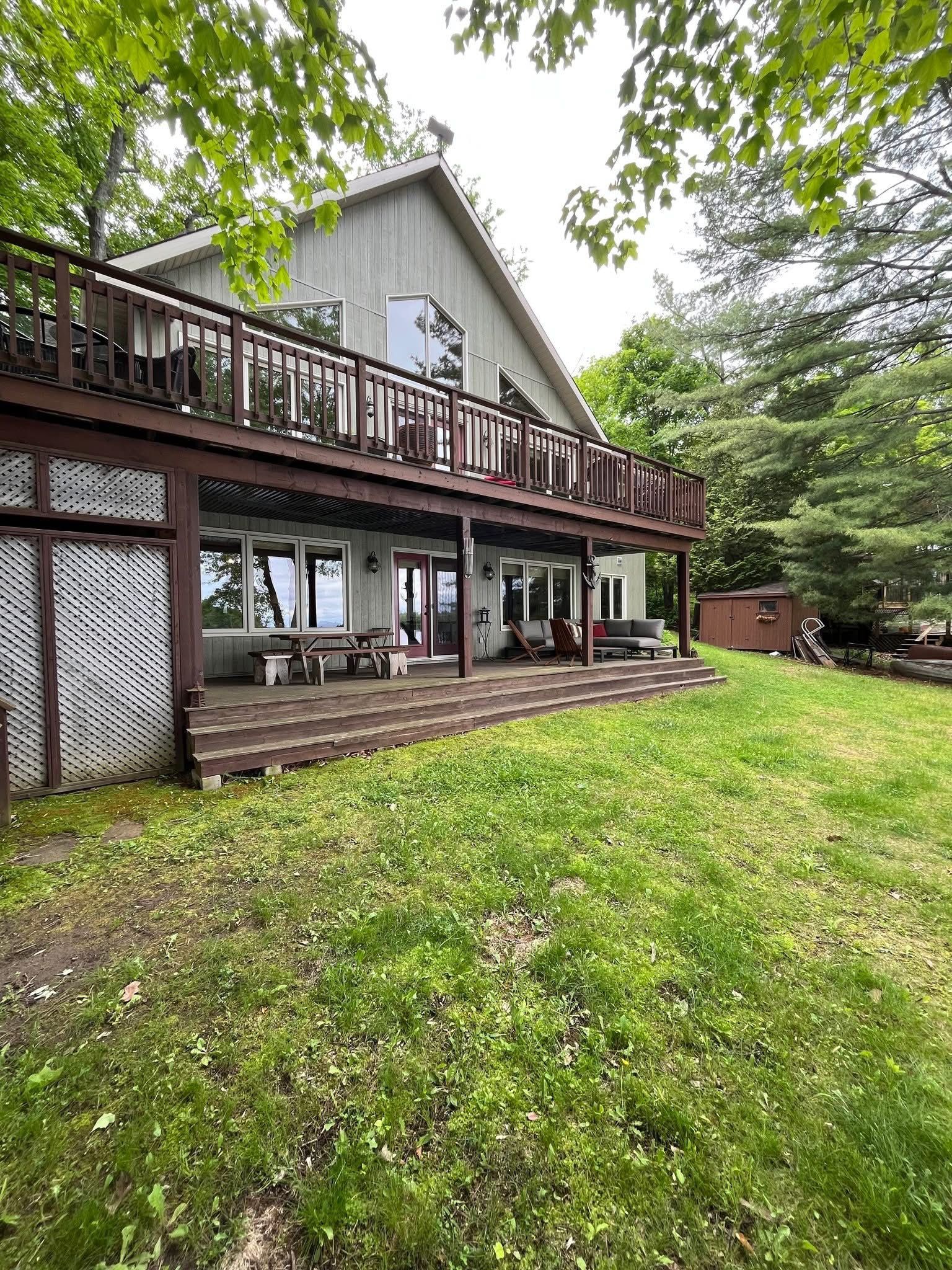 Welcome to this modern lakefront cottage retreat, perfectly designed to capture stunning waterfront views and year-round enjoyment. Set on a private lake & surrounded by mature trees, this property offers exceptional privacy along with the convenience of year-round road access. A beautiful sandy beach and dock create the perfect setting for swimming, boating, and relaxing by the water. The main level features two bedrooms & full bathroom w/heated flooring , along w/a bright and inviting open-concept living space. The well-appointed kitchen includes a breakfast bar overlooking the lake, a walk-in pantry, & dedicated eating area. A welcoming family room with wood-burning fireplace completes the space, creating the perfect gathering area while enjoying scenic lake views through large picture windows that flood the home with natural light. The fully finished walk-out lower level offers excellent additional living space w/a large bedroom, full bathroom, second family room, laundry area, & ample storage-ideal for guests or extended family. Outdoor living is exceptional with two levels of entertaining space. A large upper balcony runs the full width of the home, offering plenty of room for seating & enjoying elevated views of the lake. Below, the covered patio provides a comfortable outdoor lounge area w/sliding doors connecting to the lower level. The shoreline features a beautiful sandy beach with a gentle entry into the water, creating an ideal space for swimming, lounging in the sun, or enjoying time by the lake with family & friends. The dock provides easy access for boating & waterfront recreation. The exterior features vertical hardboard siding, giving the home a rustic yet modern cottage feel. This well-maintained waterfront property on a private lake is the perfect four-season getaway or full-time residence, combining privacy, natural beauty, and year-round accessibility while maximizing light, space, and breathtaking views. 24 hrs irrevocable on all offers.