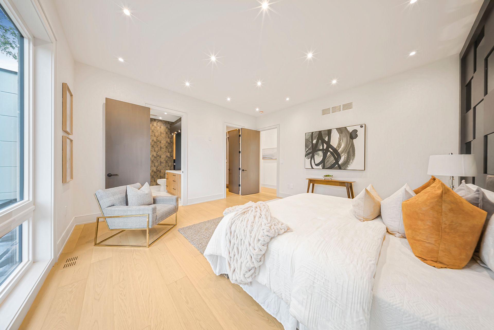 This newly built modern custom home offers over 5000 sqft. Of lavish living space. Whether you're commuting, enjoying the outdoors, or raising a family, this location on a quiet street of oakville offers the perfect balance of convenience and lifestyle. This elite modern home is design and built by zarina construction. As you step through the oversized front door, you're welcomed by a dramatic 23-ft foyer with heated italian tile flooring that flows through the main level. The main level features a private home office, an elegant living room with a stunning marble, wood, and mirror accent wall, and a breathtaking open-to-above family room. Anchored by a custom diamond-pattern feature wall and a double-sided dimplex fireplace, large windows, this space is the heart of the home -open, bright, and welcoming. The gourmet kitchen is a chefs dream, offering a spacious island, custom cabinetry, and built-in miele appliances. A separate spice kitchen keeps bold flavors contained and the main kitchen spotless. The layout flows seamlessly into a formal dining area with a walkout to the fully fenced backyard. Upstairs, you will find four generous bedrooms, each with its own ensuite bathroom featuring custom floating vanities, integrated sinks, heated tile flooring, and calming finishes. The primary suite is a luxurious retreat with a custom walk-in closet and a spa-like 5-piece ensuite with a freestanding tub, curbless shower, and dual vanities. A laundry room on this floor adds convenience. The finished basement offers 11. 5-ft ceilings, a bright open rec area, a second kitchen, two bedrooms with a shared bath, and for the ultimate movie night experience, there's a dedicated theatre room fully equipped with 4 dedicated speakers for a true cinematic experience. This home also includes 16 built-in speakers throughout. With a basement walkout and large windows bringing in natural light. This home is a reflection of modern luxury tailored to your lifestyle.