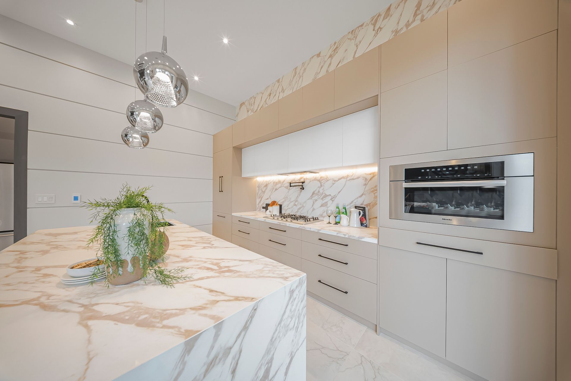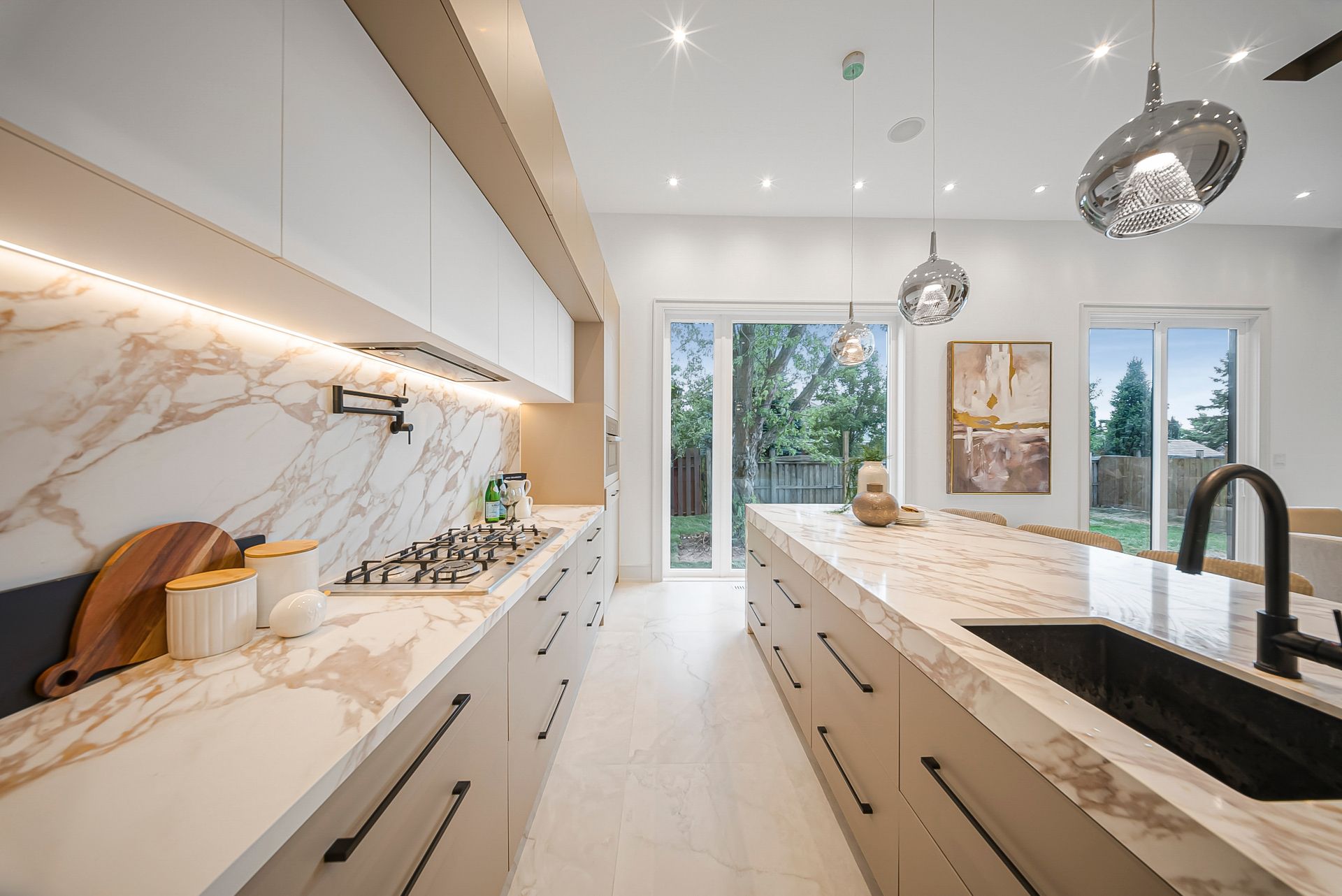 • Gourmet kitchen with spacious island, custom cabinetry, and separate spice kitchen.