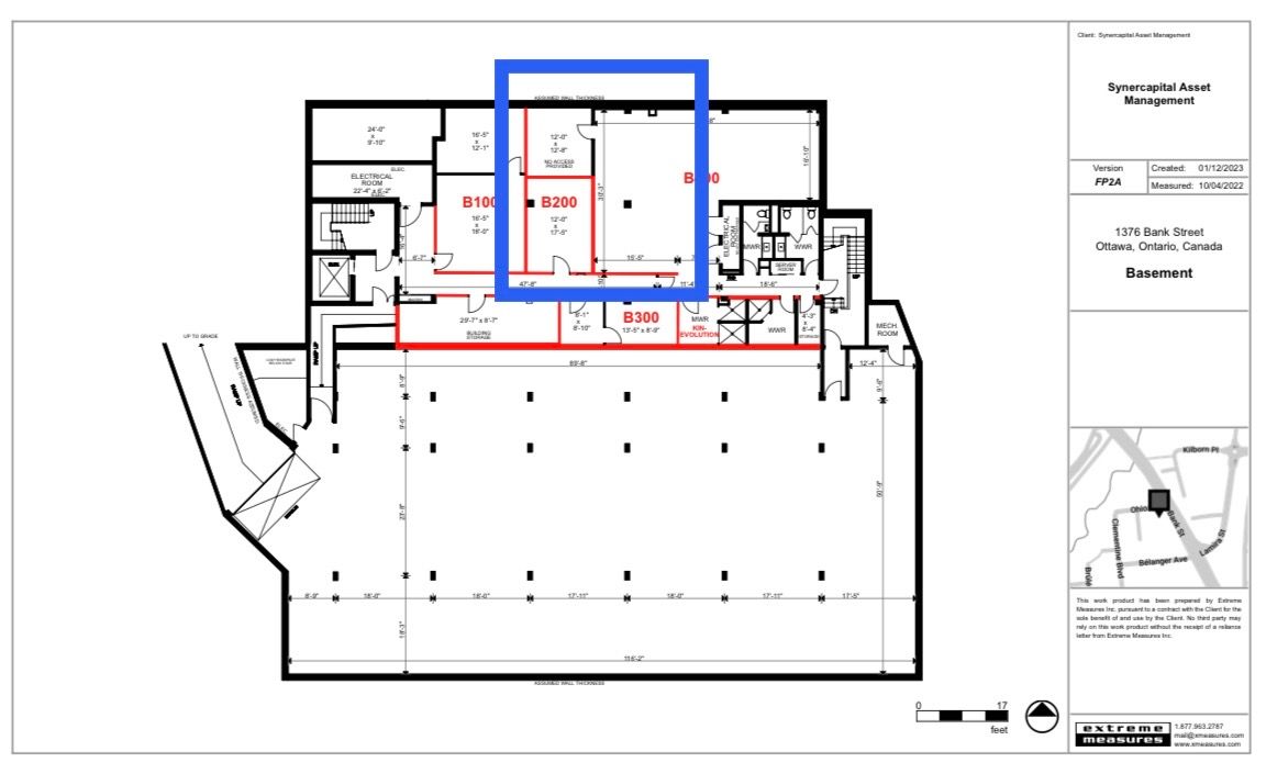 Approx 900 rentable square feet of turn-key office space in basement of well-managed office building! Currently divided into 3 large rooms, and can be divided further. Landlord can provide/organize desired fit-up at cost, pro-rated over the lease term! Space is currently used as physiotherapy/osteopathy/rmt wellness practitioners but has wide variety of applications. See marked-up floorplans in tandem with the following description: the proposed new space crops some of the (current) b400 open floor plan and closes it off for owner personal use; b200 is absorbed, and doors opened between spaces as tenant requires. There is some flexibility re: placement of walls; possible inclusion of all or some gym equipment in the rental. Equipment is not for sale unless tenant is leasing space. All utilities and operating expenses included in the rent - fully gross lease! Escalations of $50/mo/year. Excellent location close to 417, riverside drive,bank street, and billings bridge shopping plaza. Building is home to professional tenants such as law offices, mental wellness practitioners, not-for-profit, technology, etc. Video walk through is available upon request.