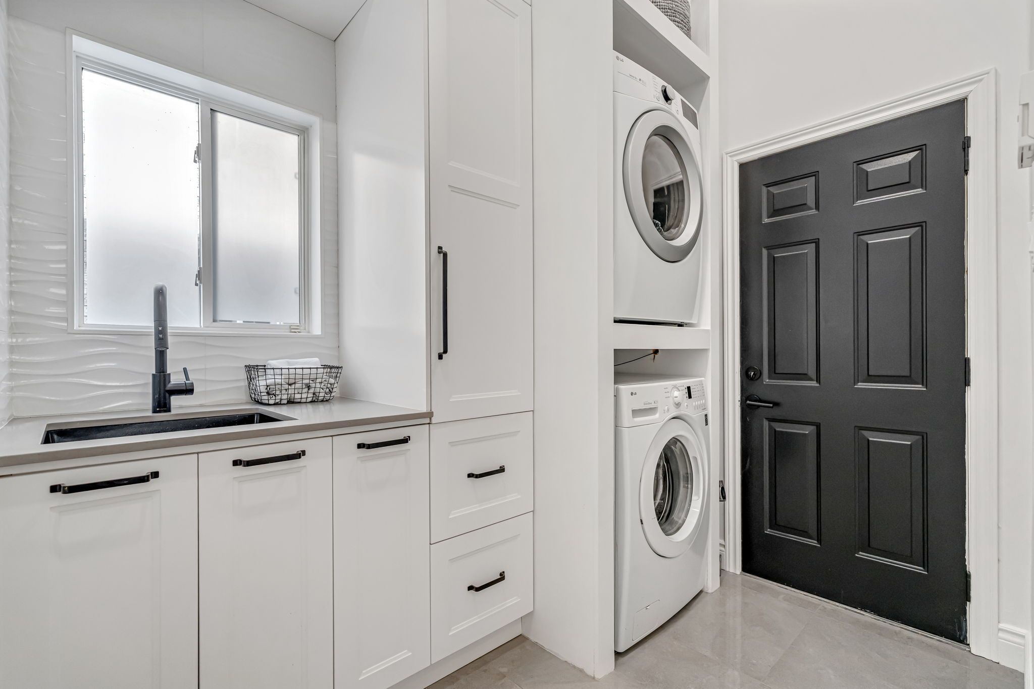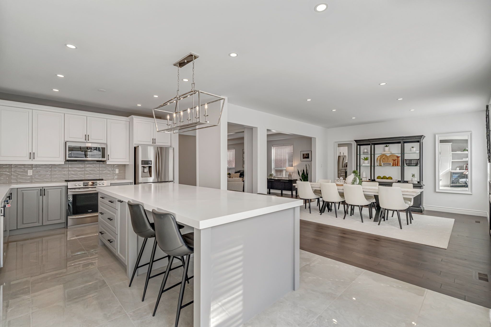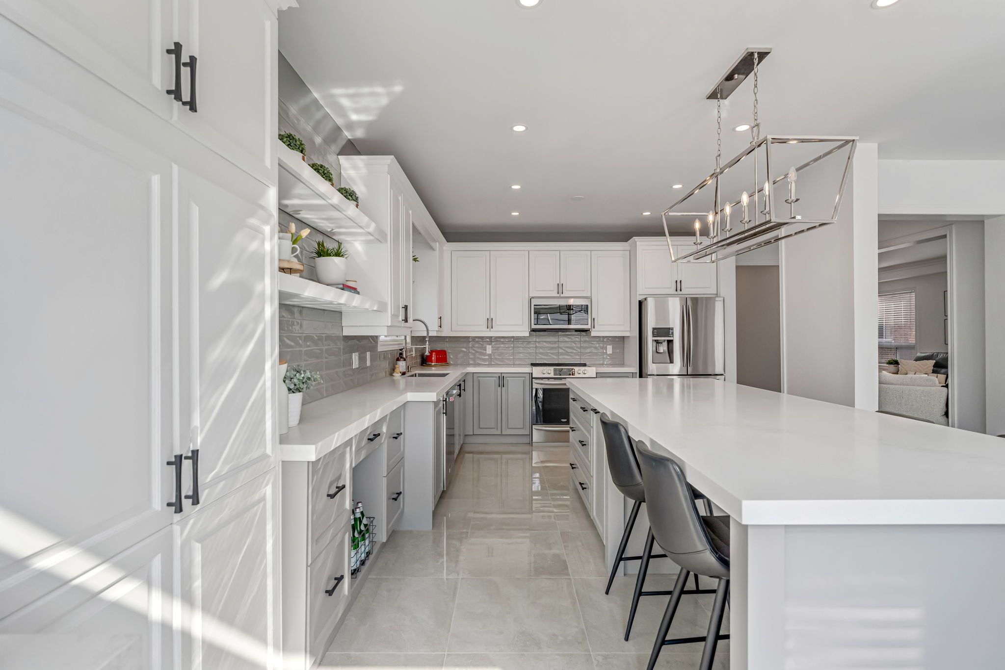 • Stylish quartz kitchen with a 10-foot island and sleek cabinetry.