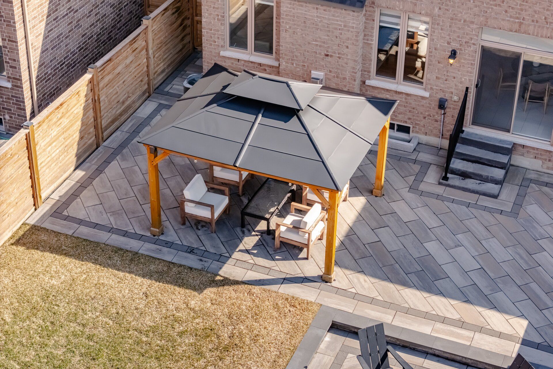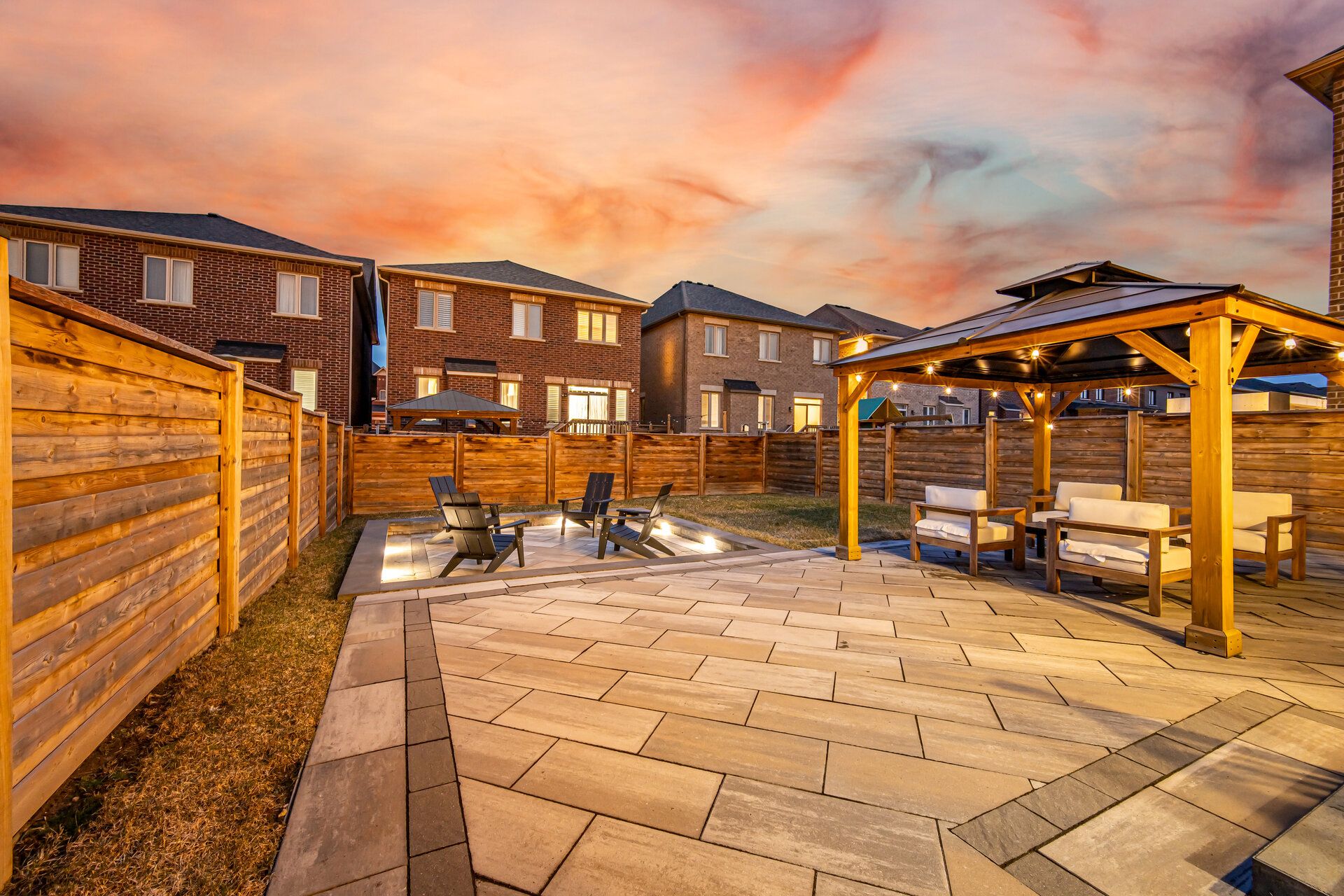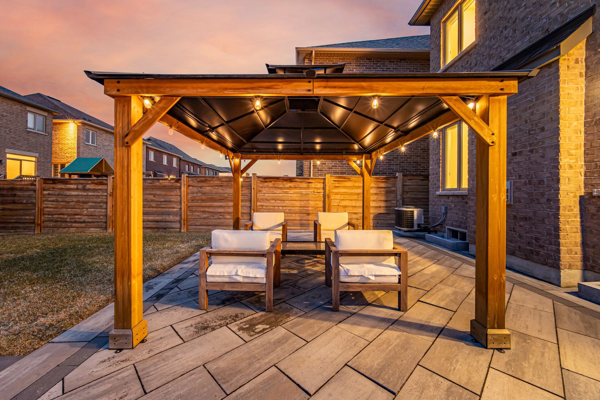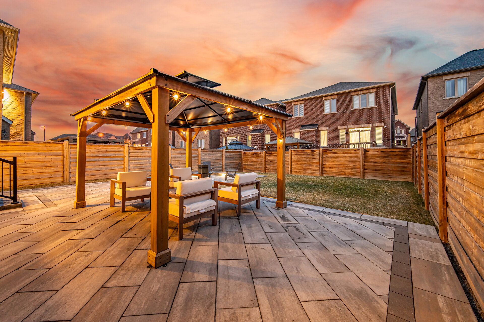 • Impressive backyard oasis with interlocking stone and stylish gazebo.