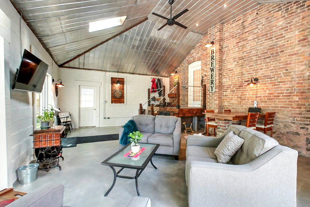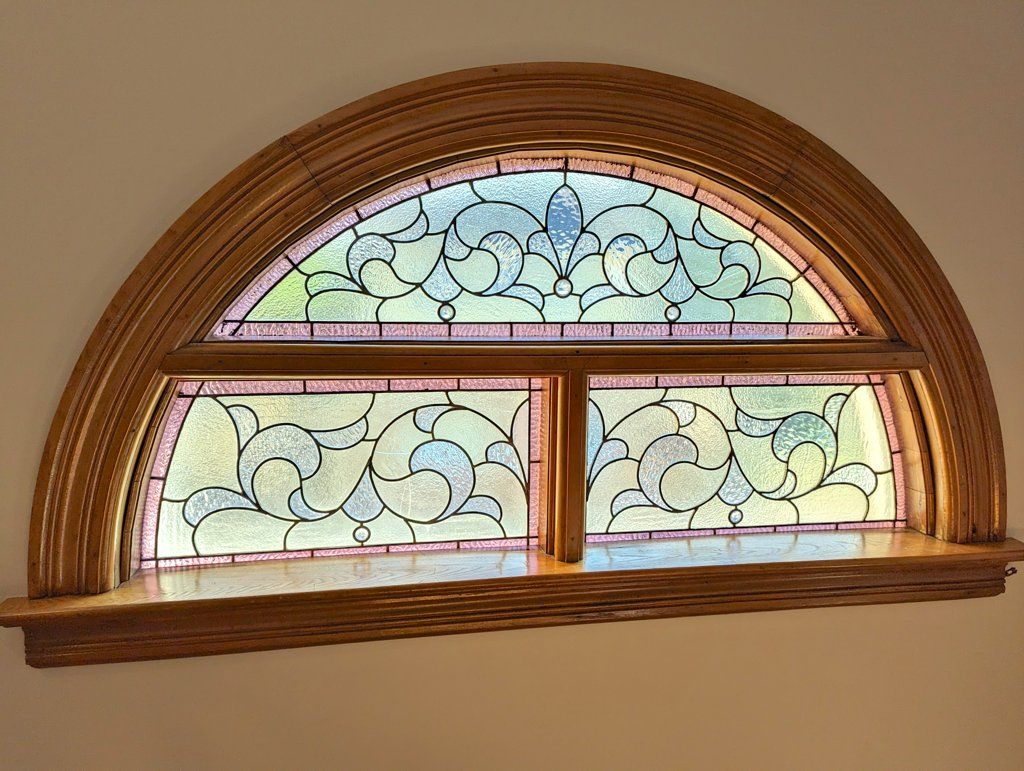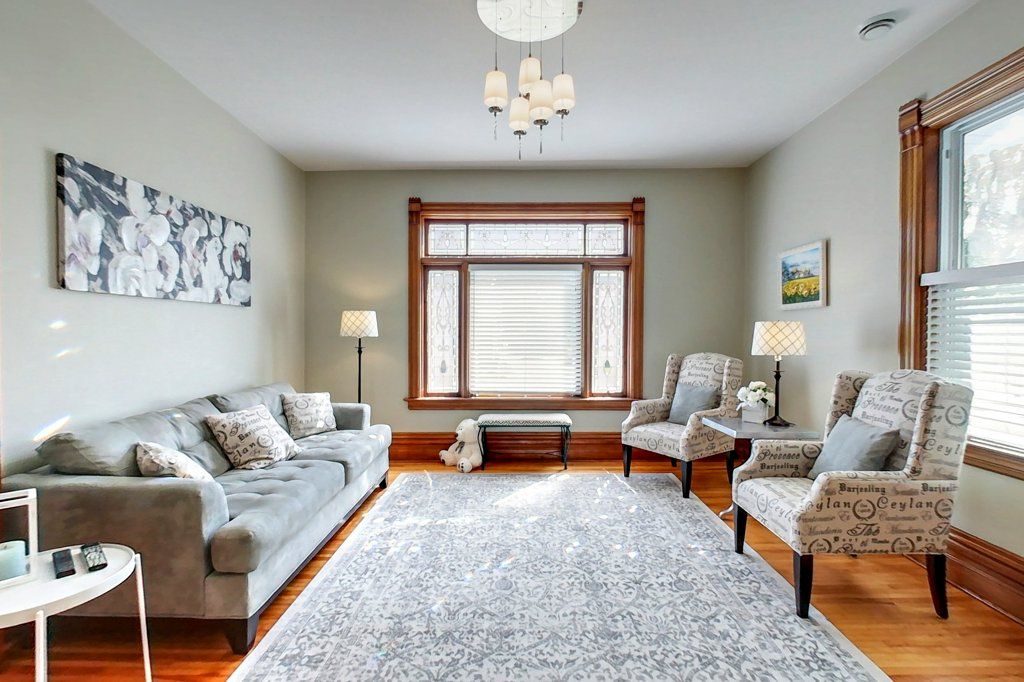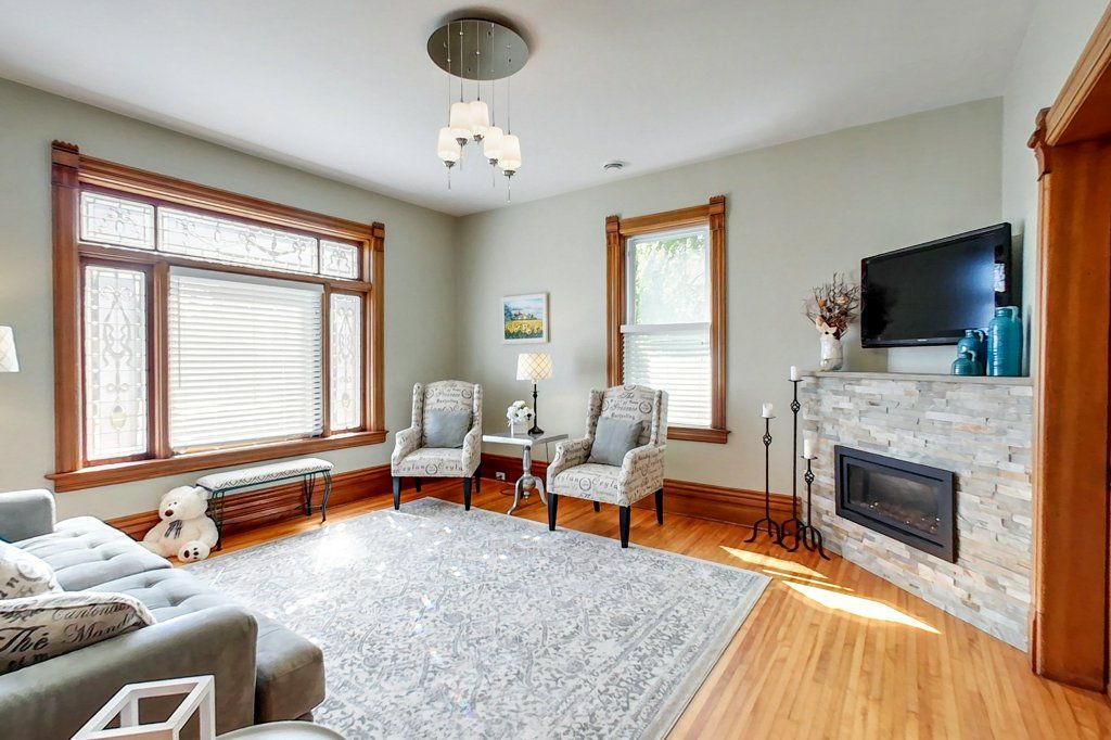 • Welcoming living room featuring a cozy gas fireplace and original stained glass window.