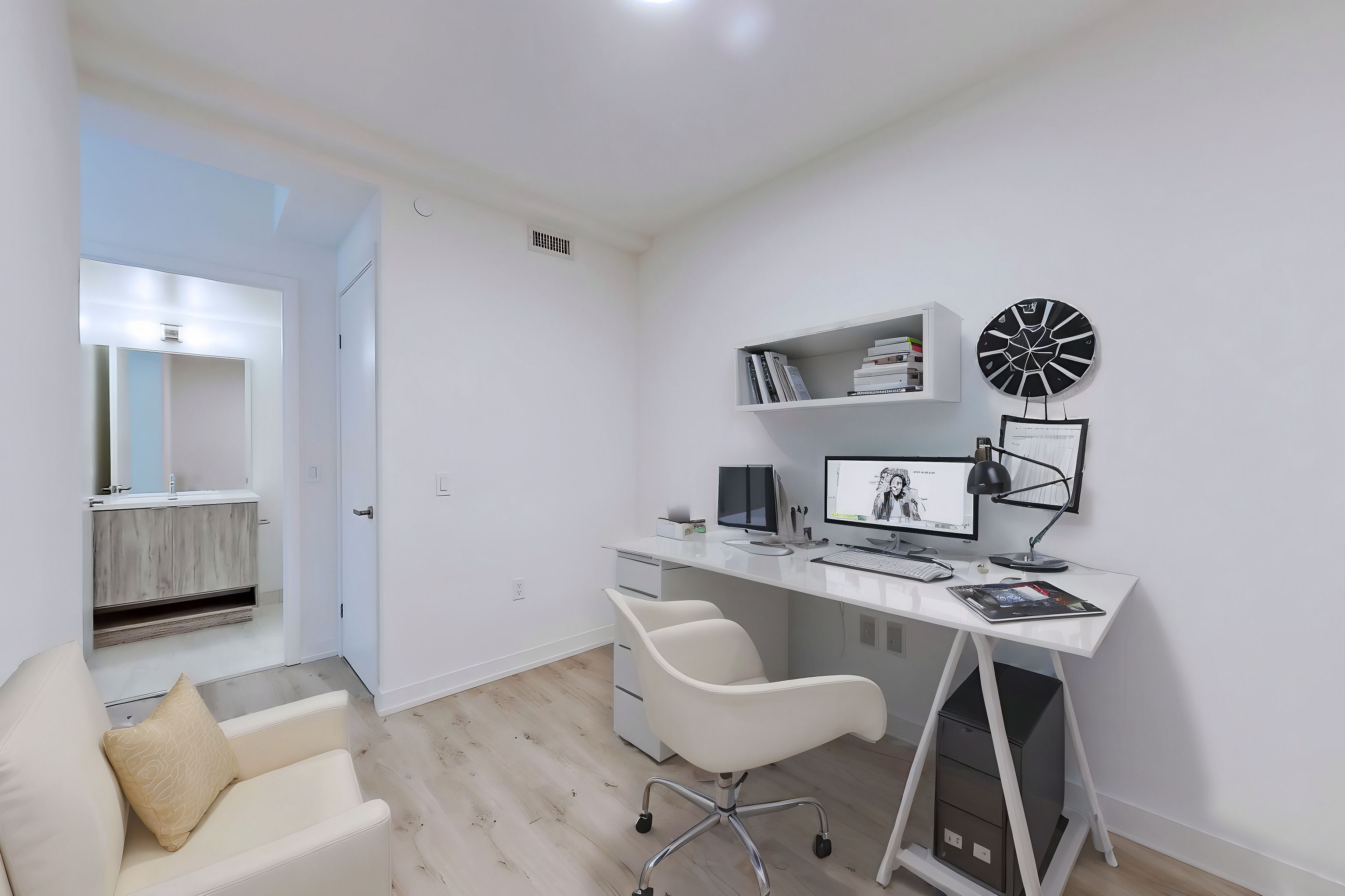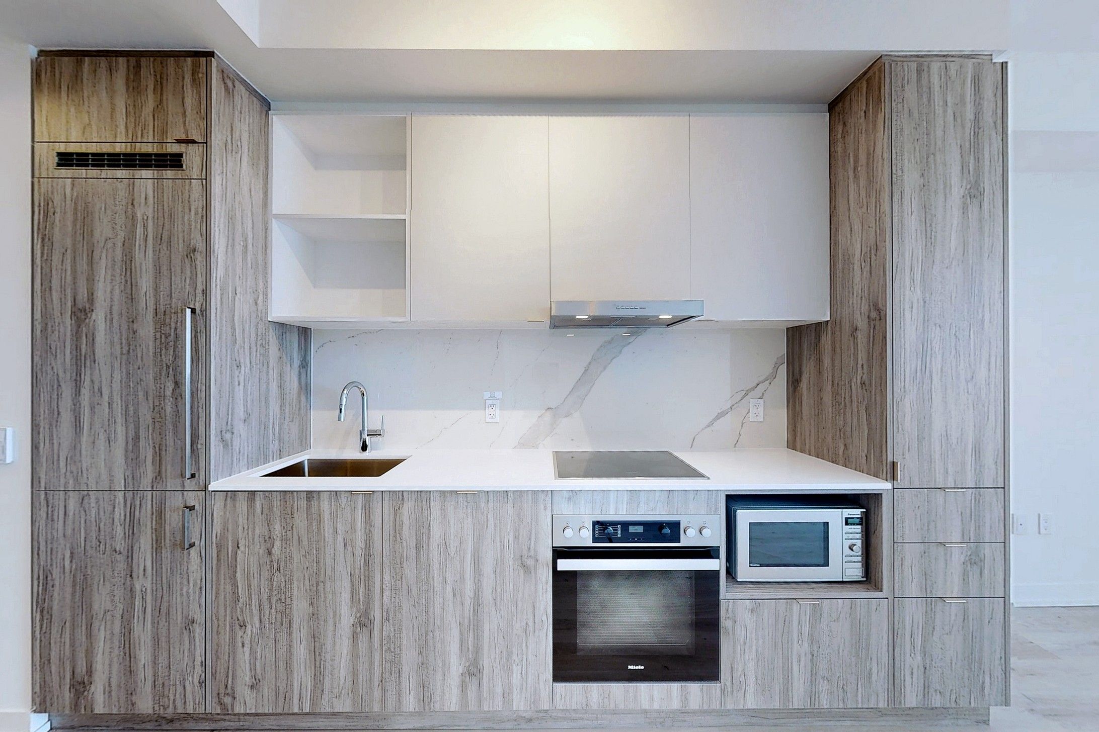 • Modern kitchen features integrated appliances and open concept design.