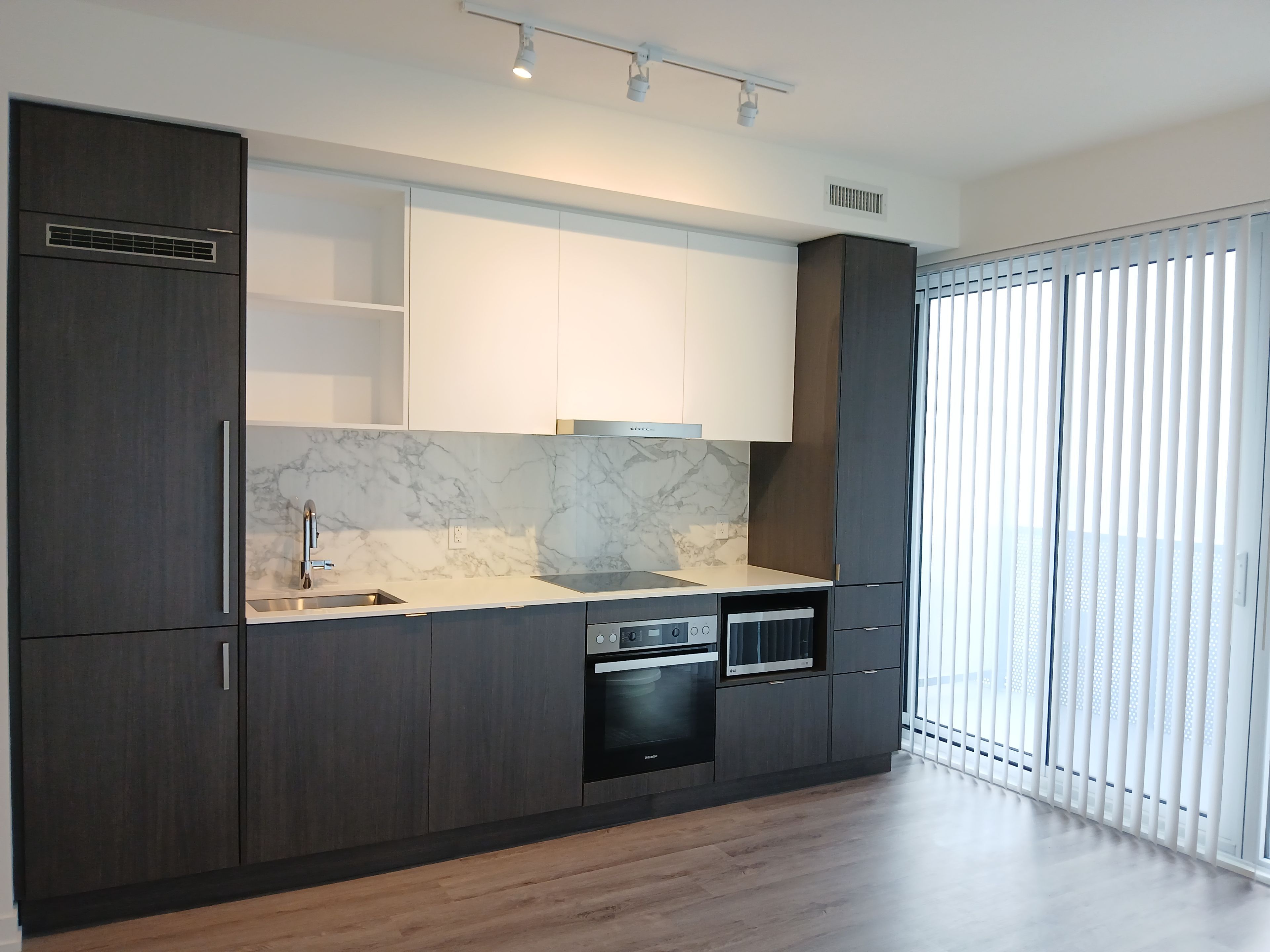 Sugar wharf 1 bedroom / 1 bathroom , 501 sqft interior unit w/ amazing views from balcony facing south. Clear view open concept kitchen living room - ensuite laundry, stainless steel kitchen appliances included. Engineered hardwood floors, stone counter tops. Steps away from sugar beach, employment, shops & restaurants. Farm boy, loblaws, lcbo, the lake. The life. The city. Built-in fridge, dishwasher, stove, microwave, front loading washer and dryer, existing lights, ac, hardwood floors, window coverings