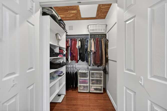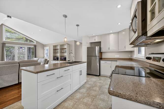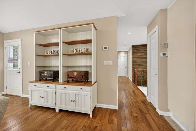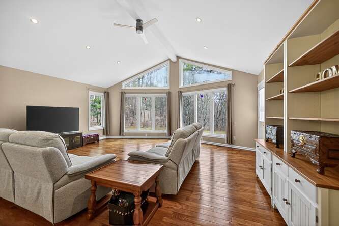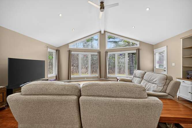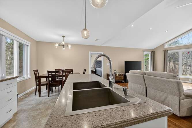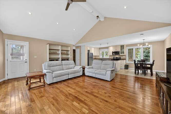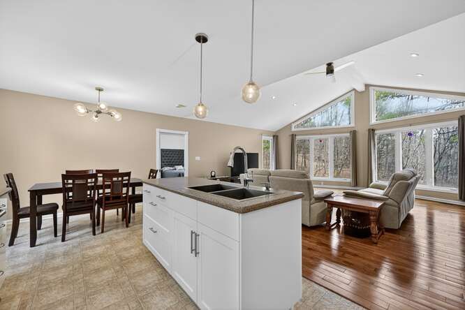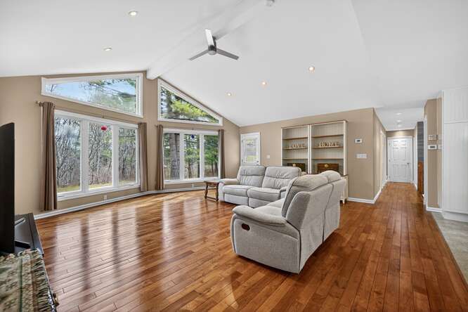 • Open concept design with hardwood floors and a vaulted ceiling.