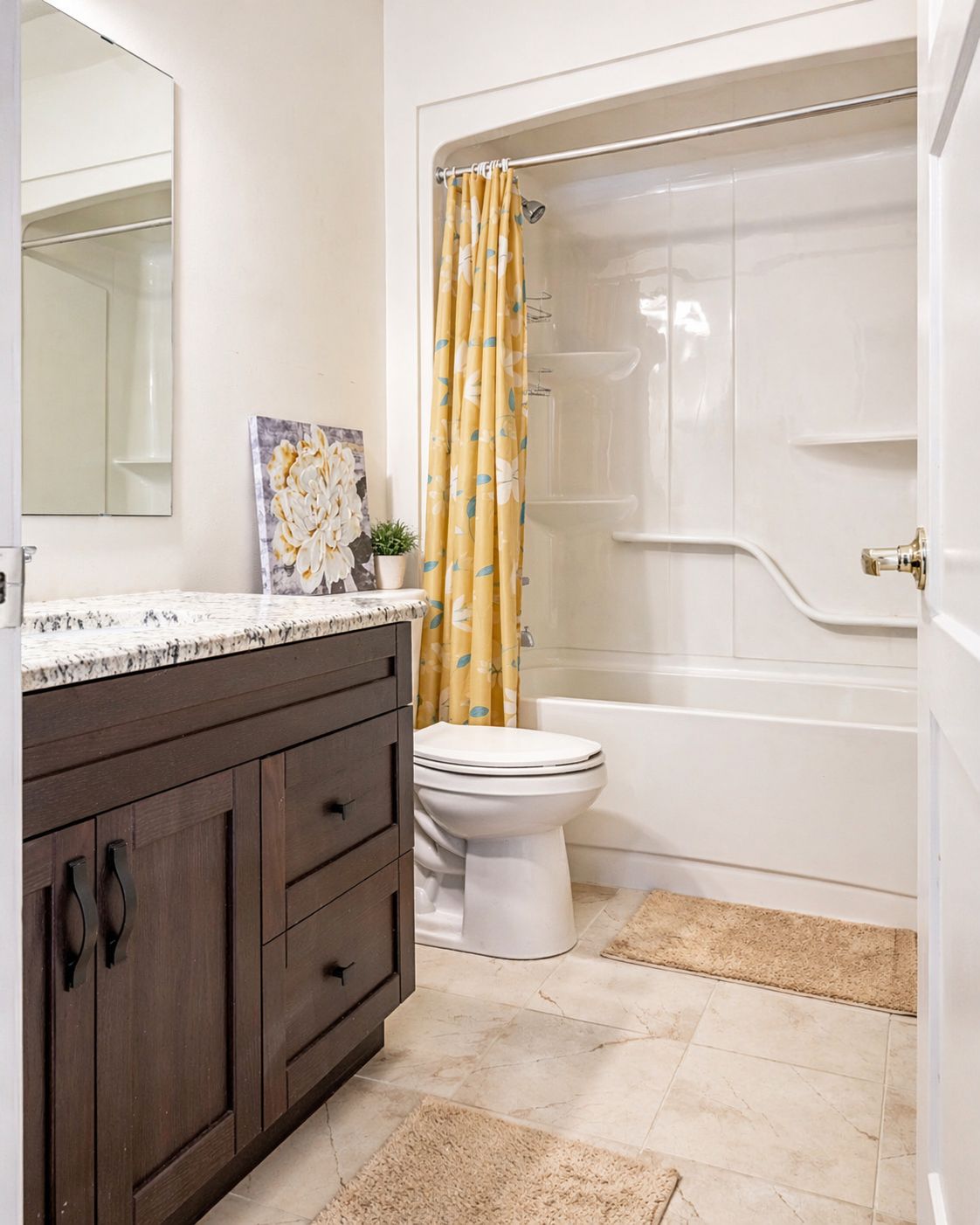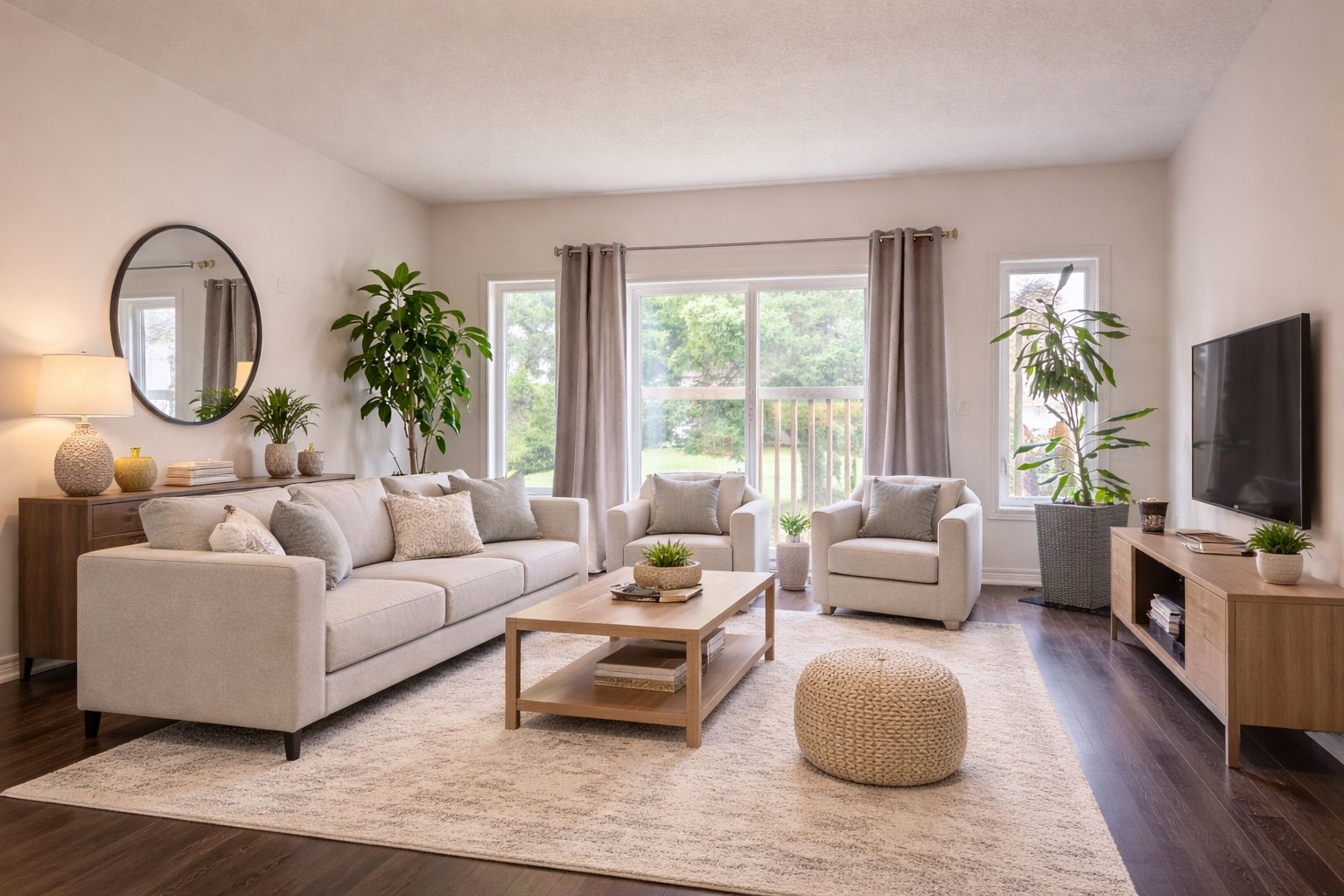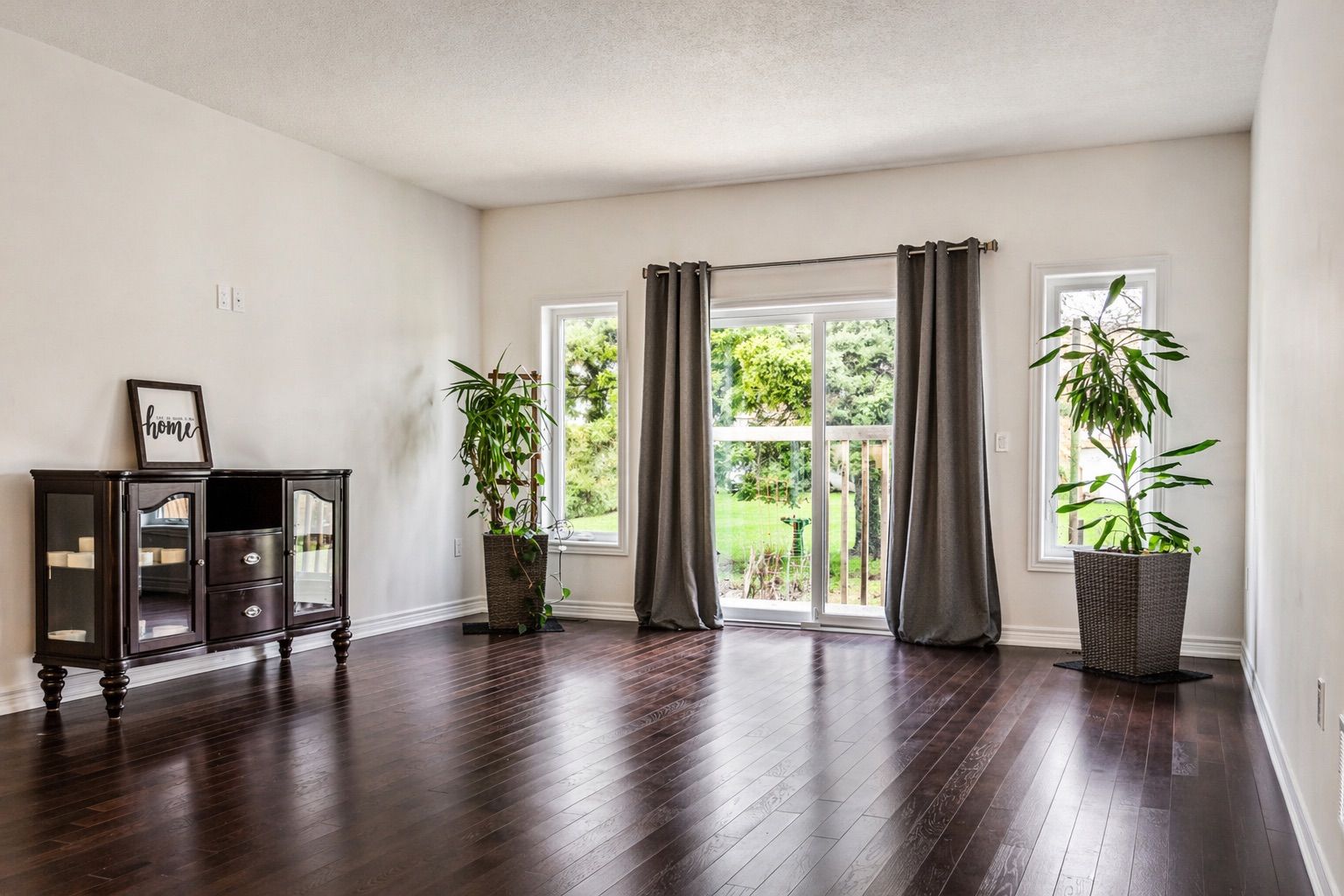 • Bright, open-concept design featuring vaulted ceilings and hardwood flooring.