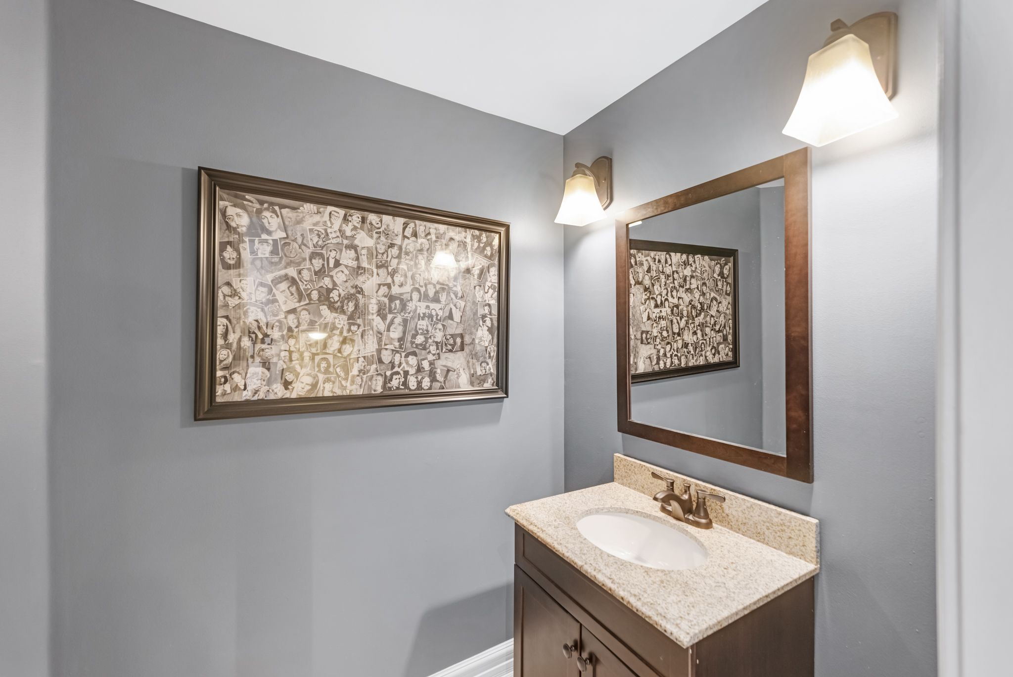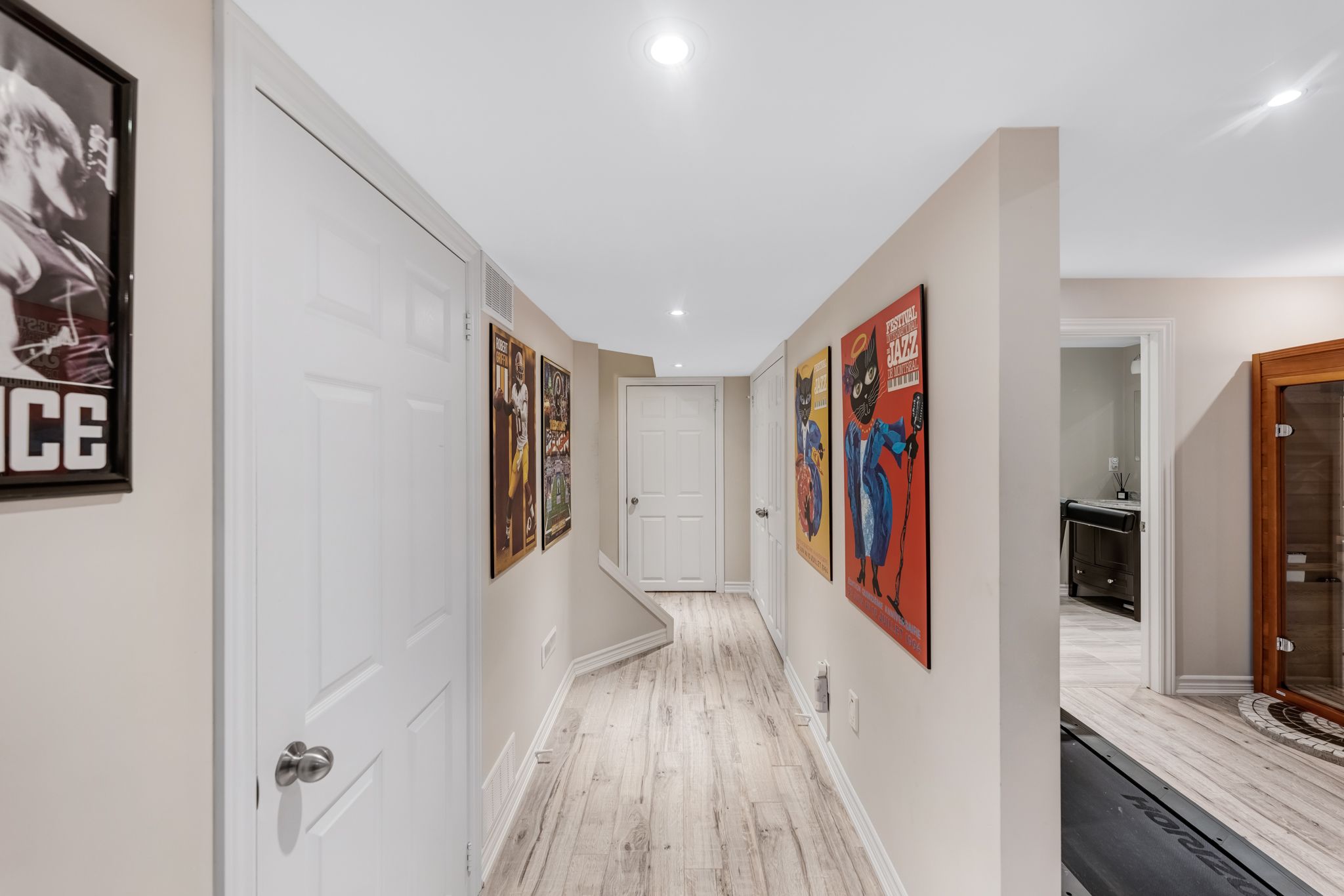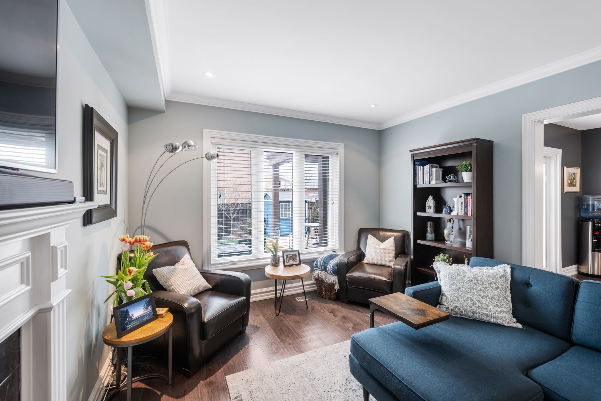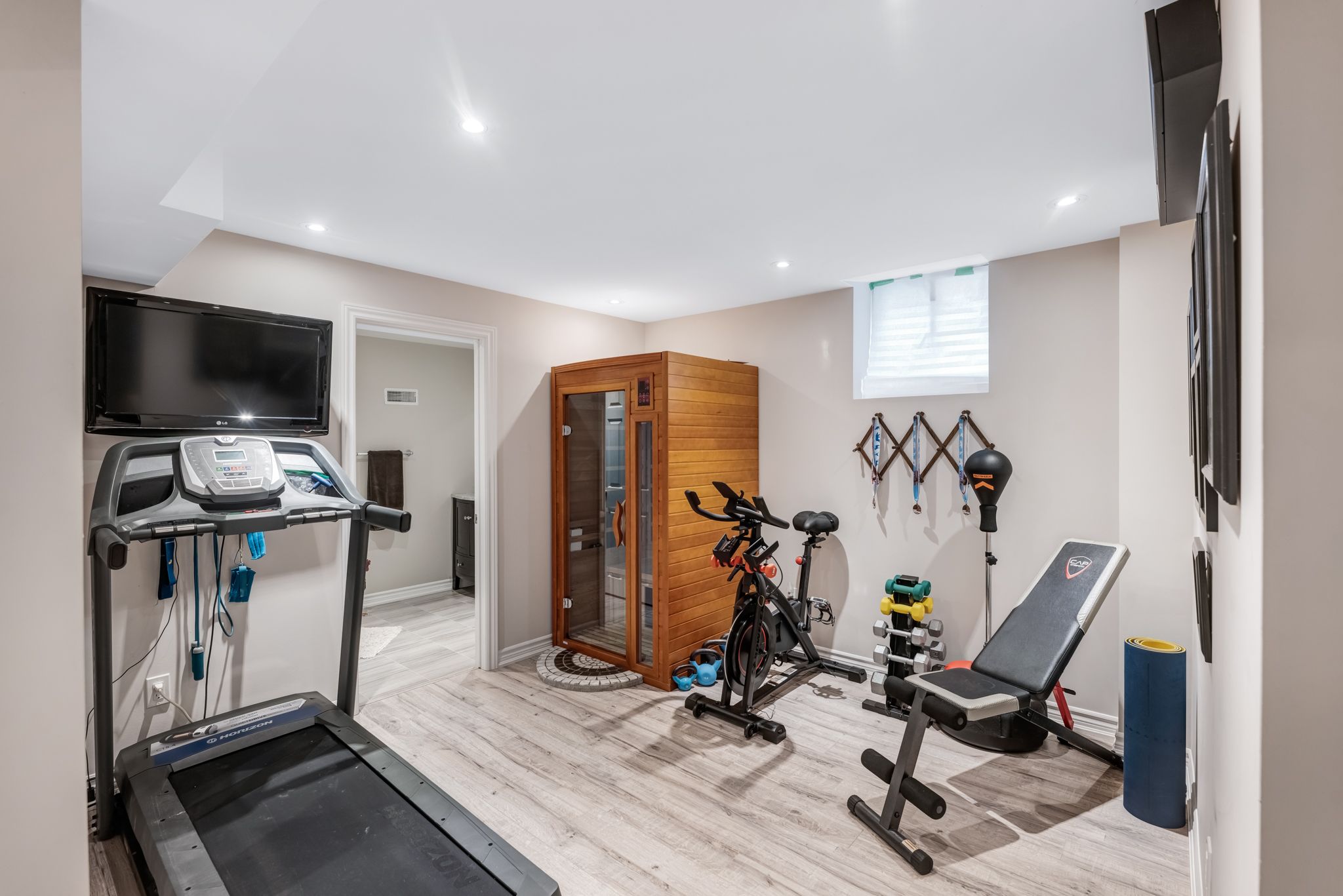• Fully finished basement with electric fireplace, custom bar, and gym space.
