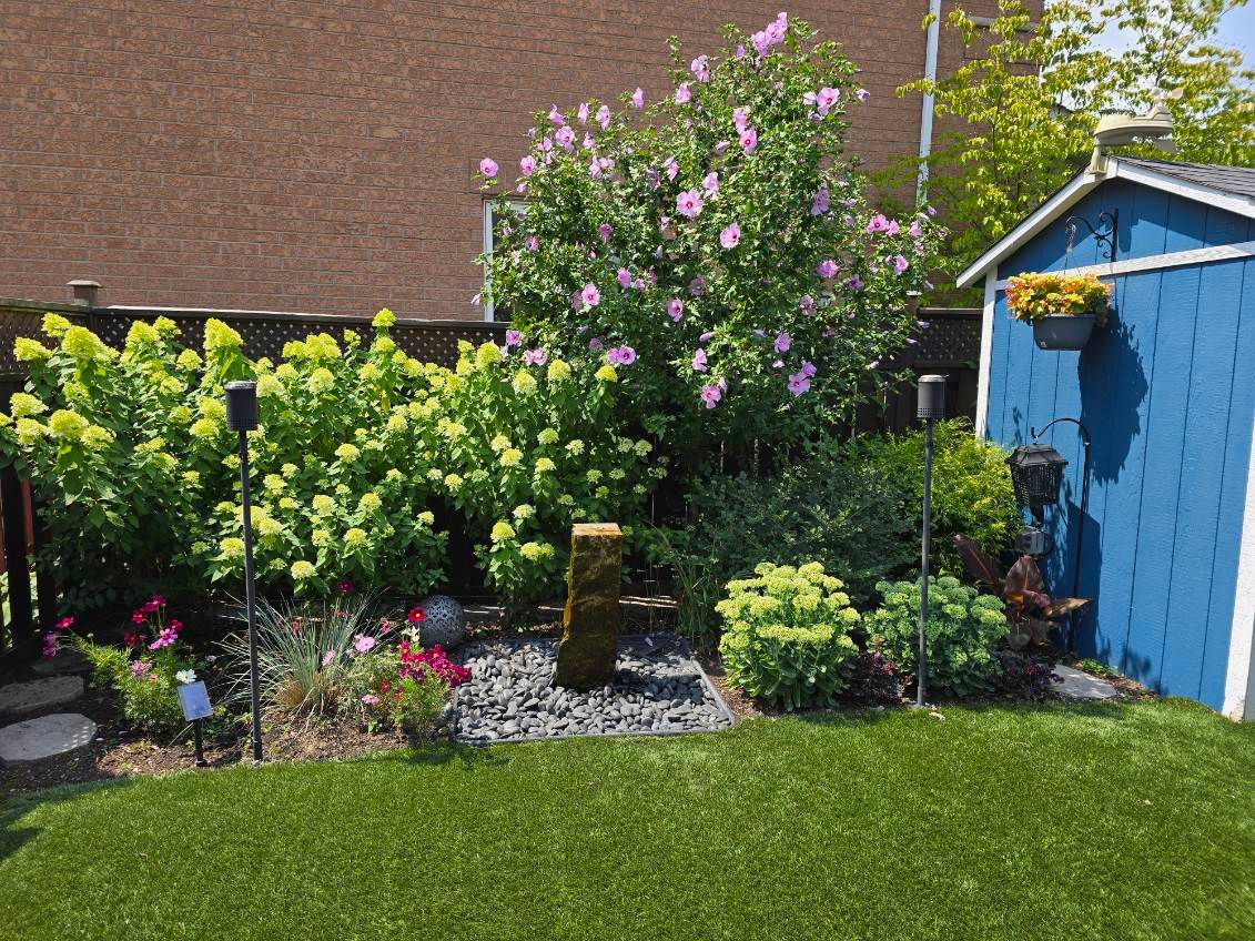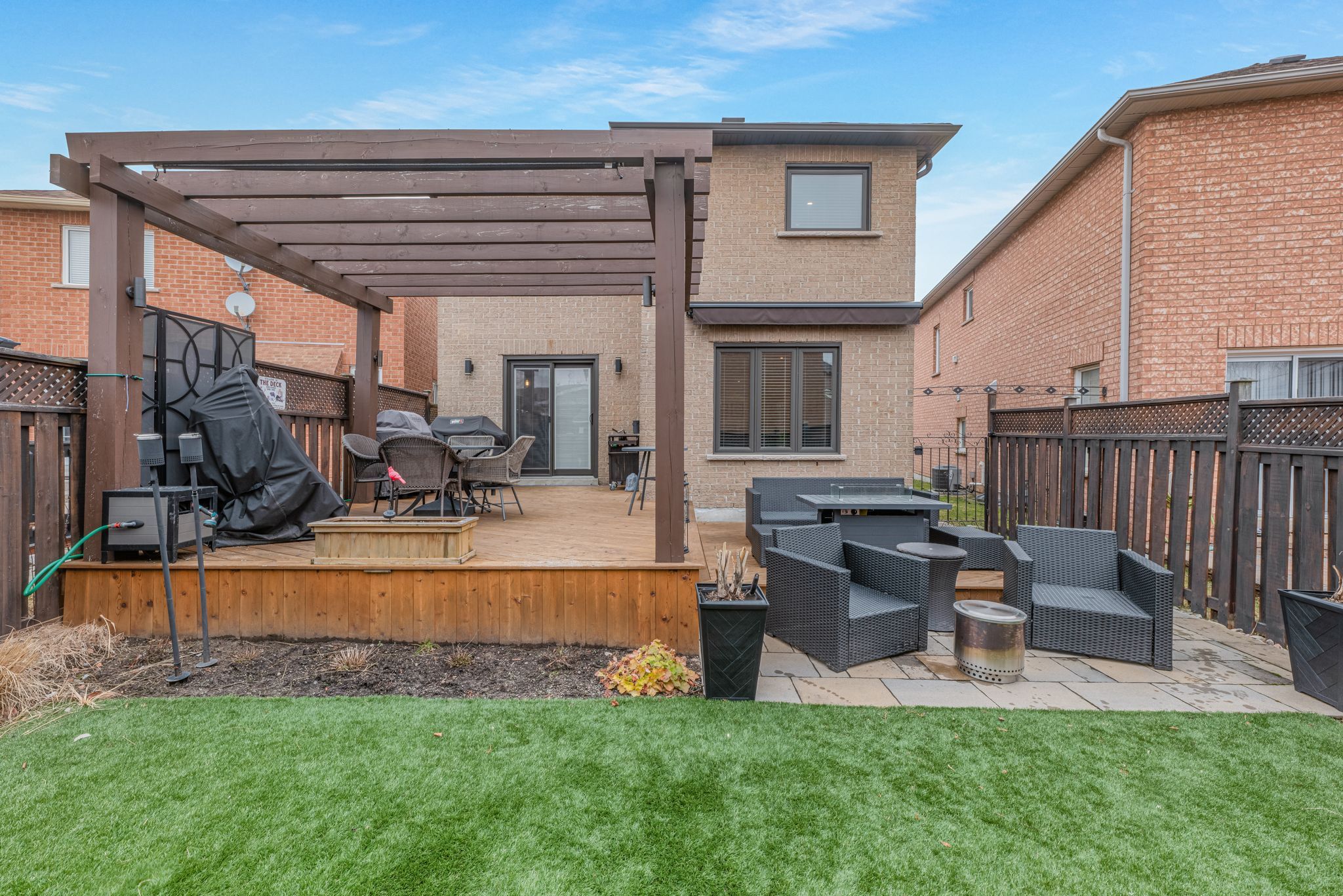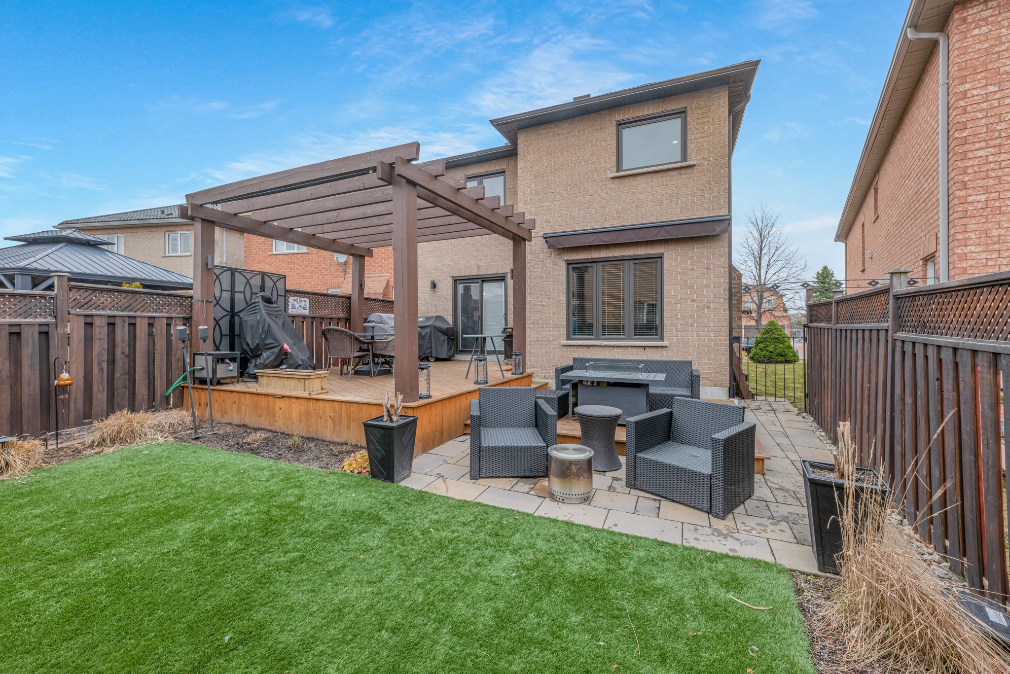 • Private backyard oasis with artificial turf, oversized pergola, and serene water feature.