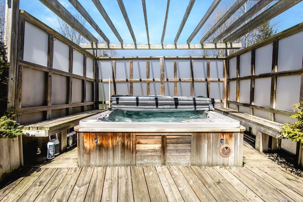 • Private backyard features a hot tub, gas fire pit, and mature trees.