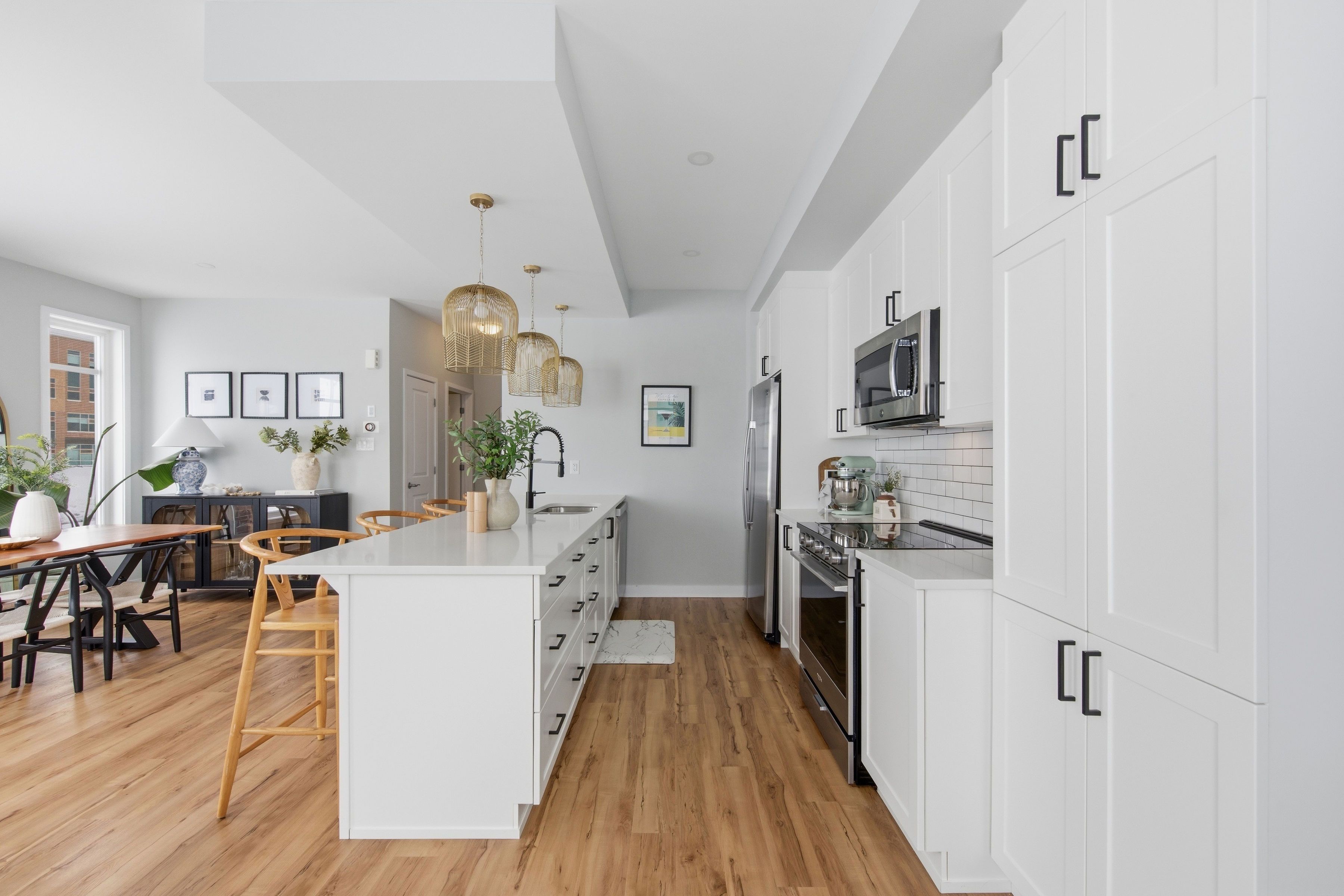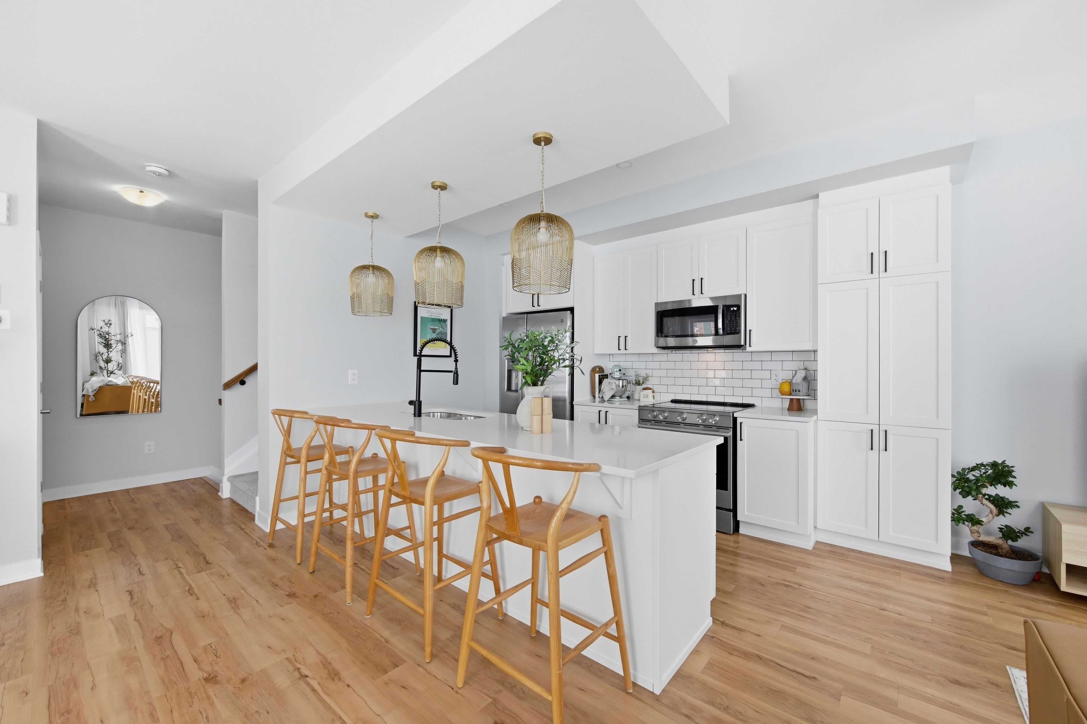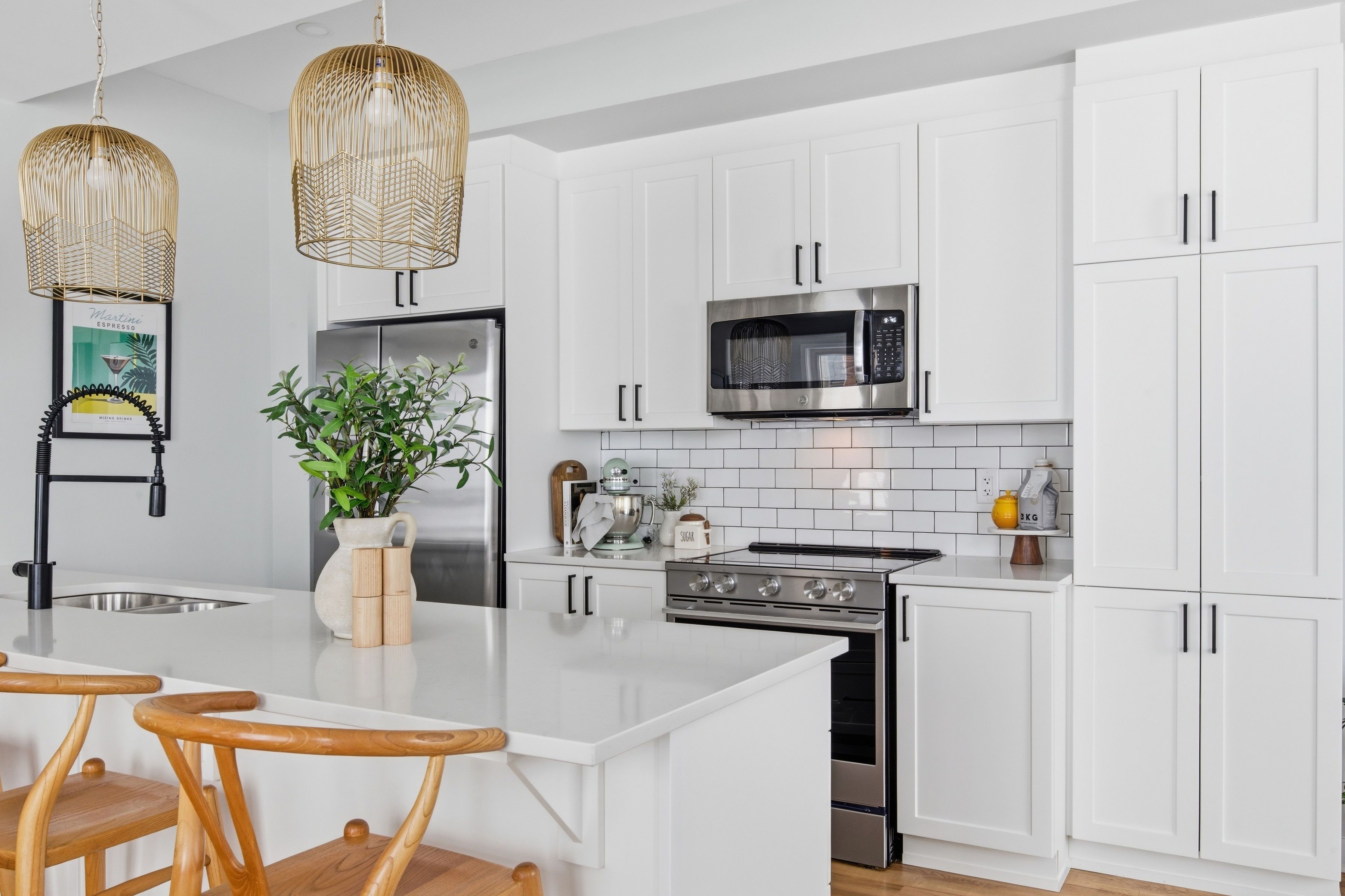 • Modern kitchen with quartz countertops and stainless steel appliances.