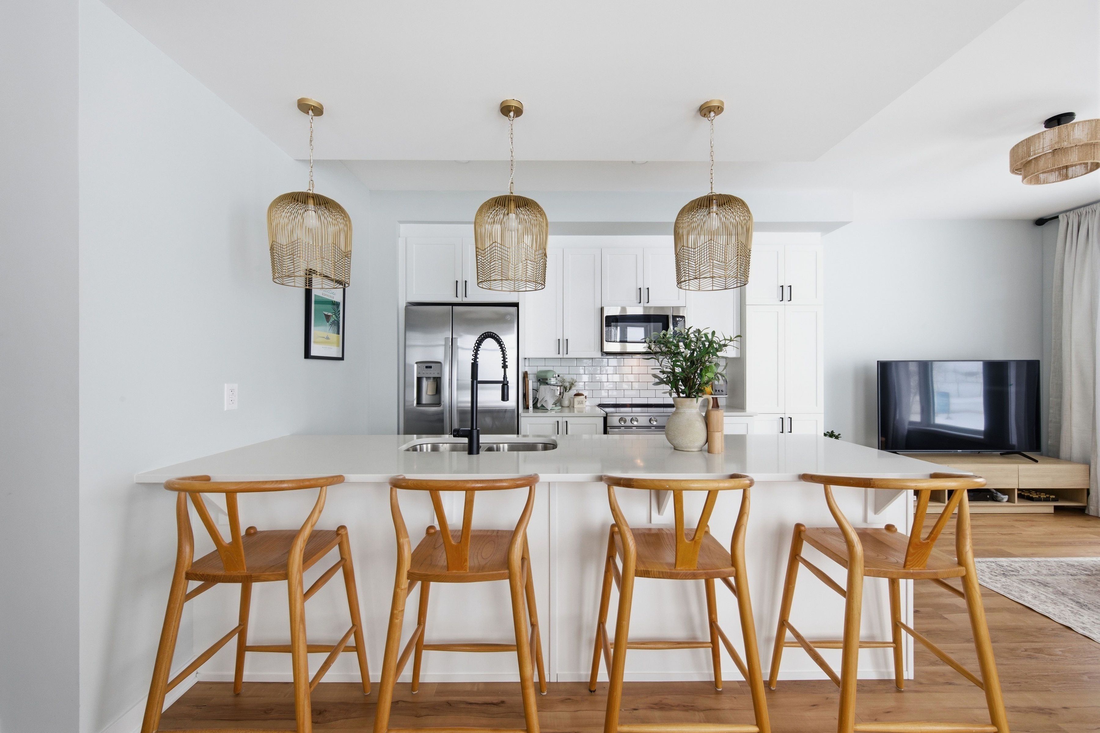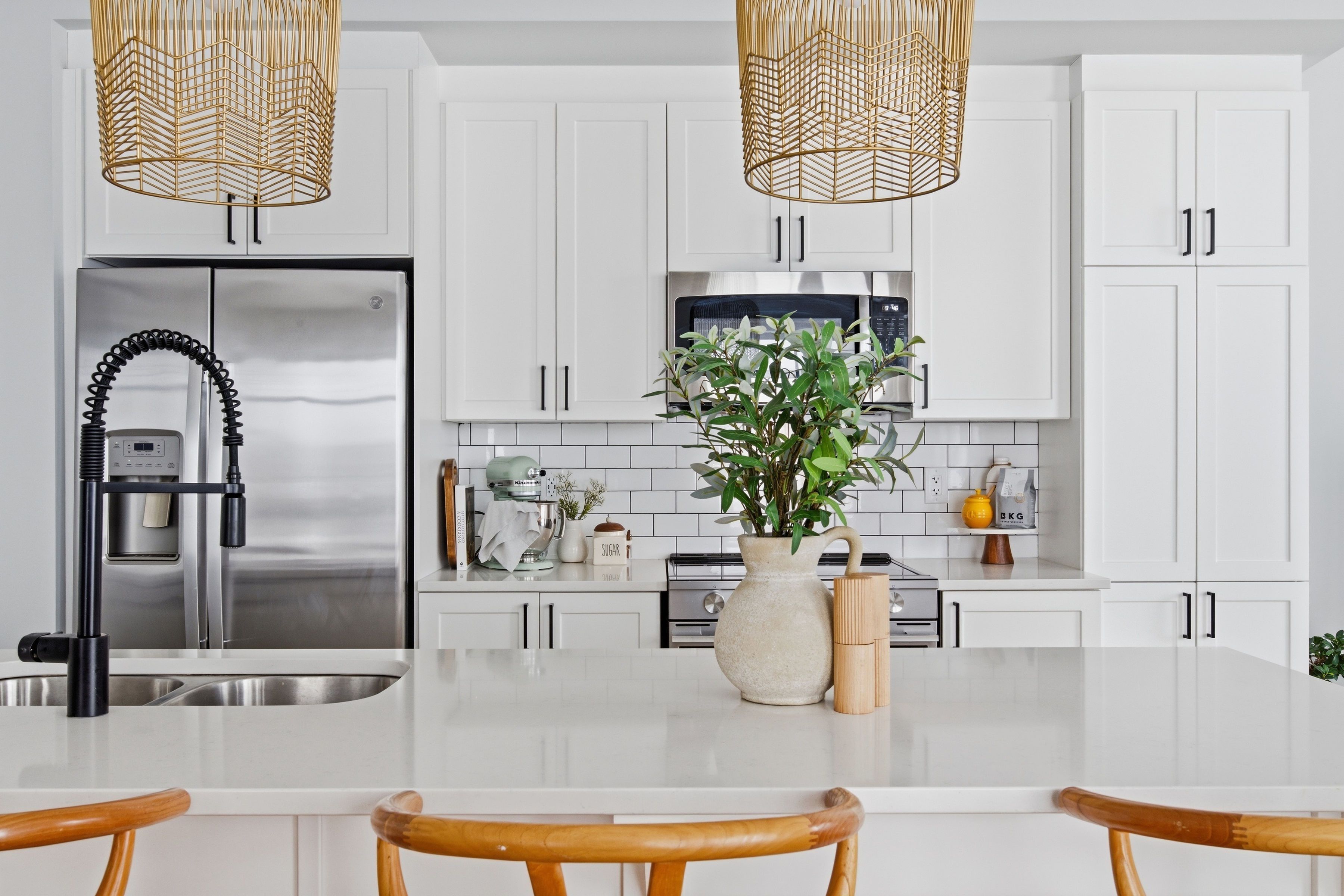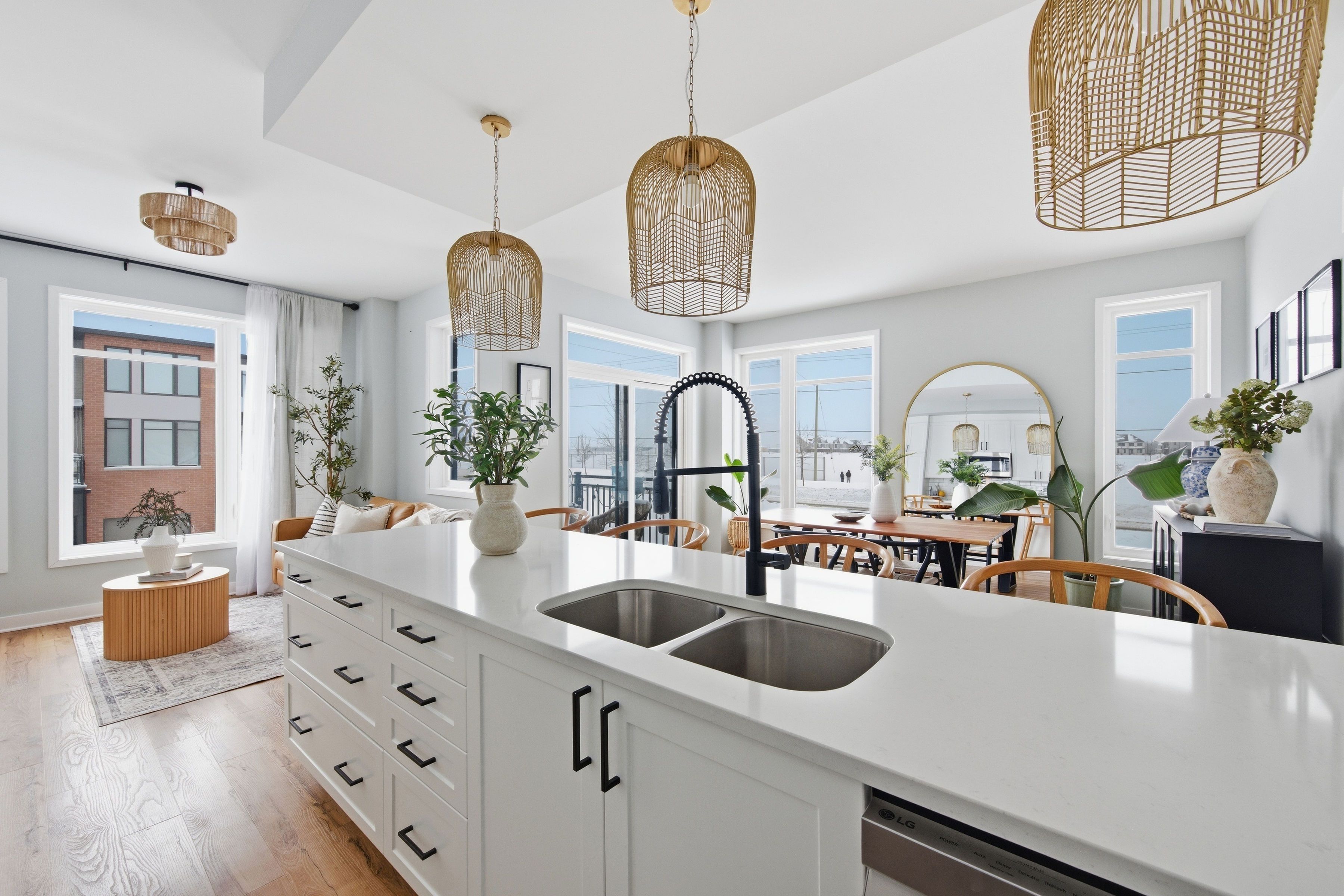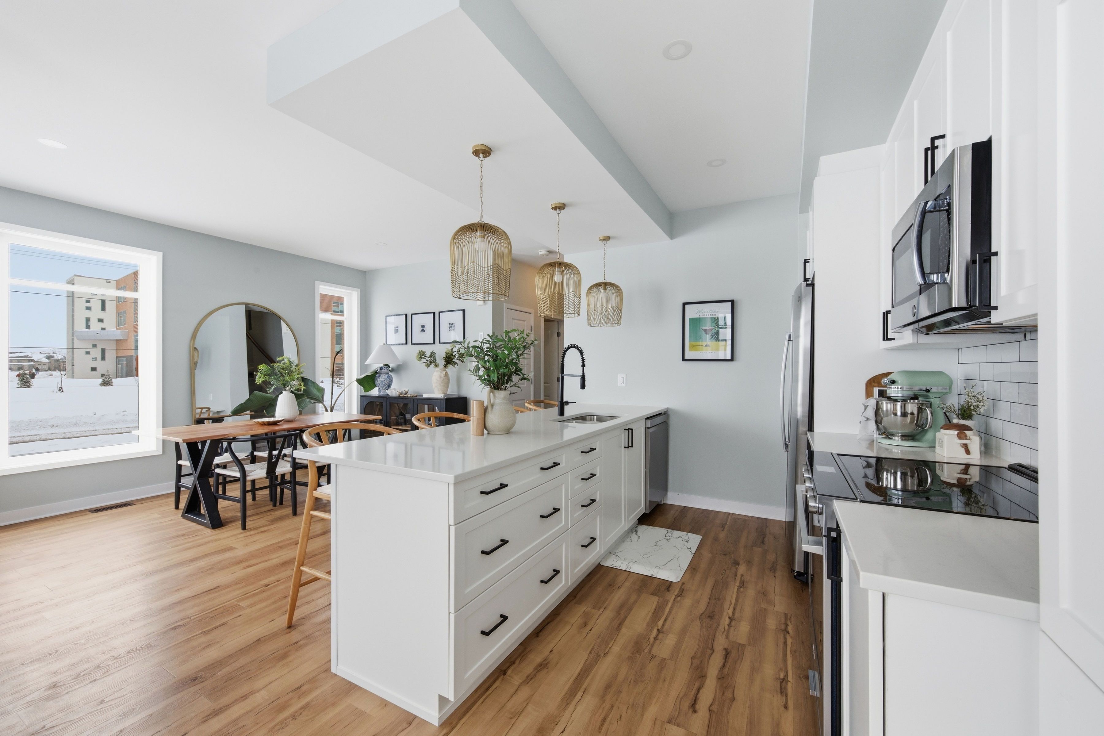 • Modern kitchen with quartz countertops and stainless steel appliances.