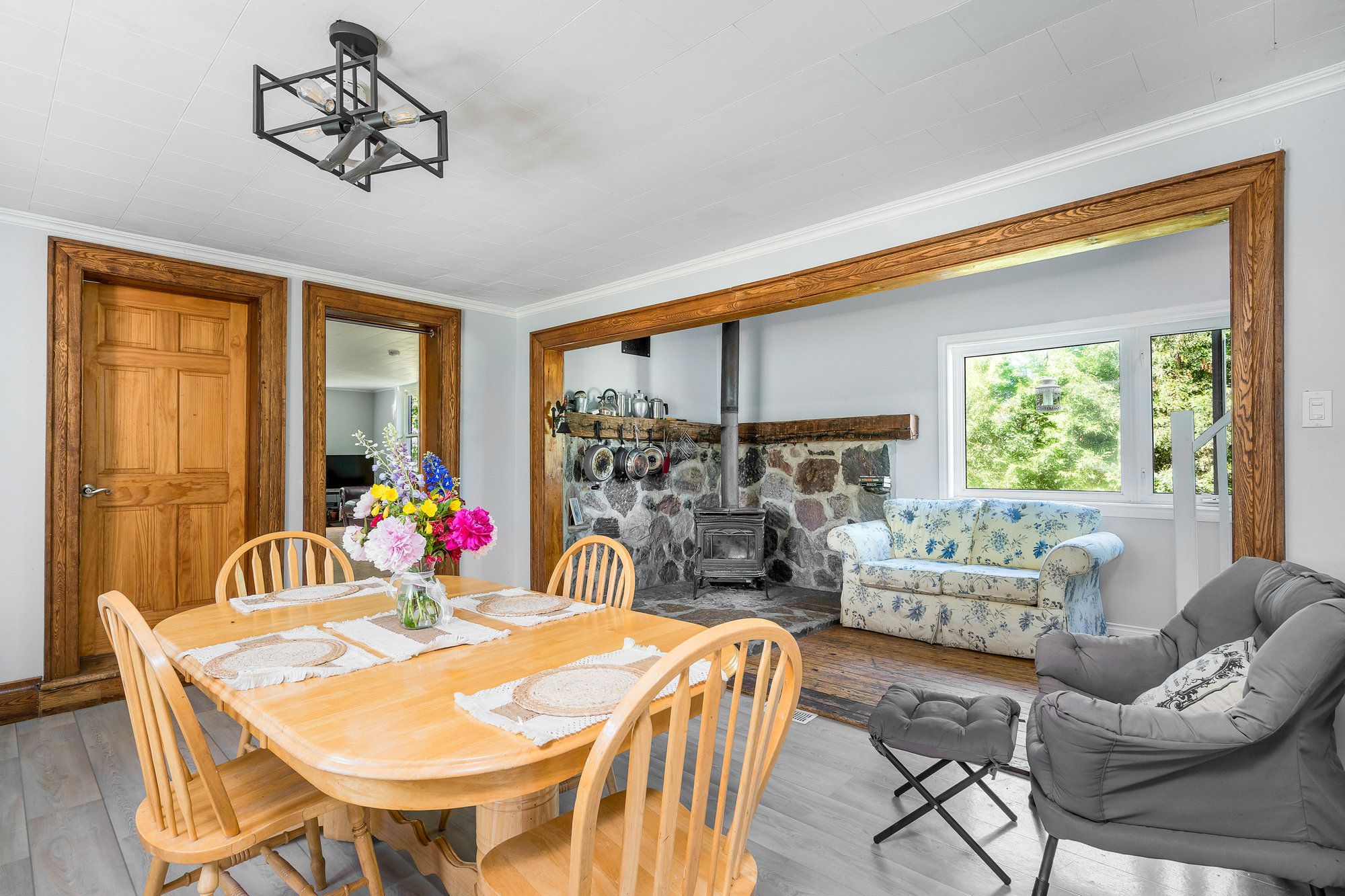 • Comfortable wood burning fireplace and sunroom for relaxation.