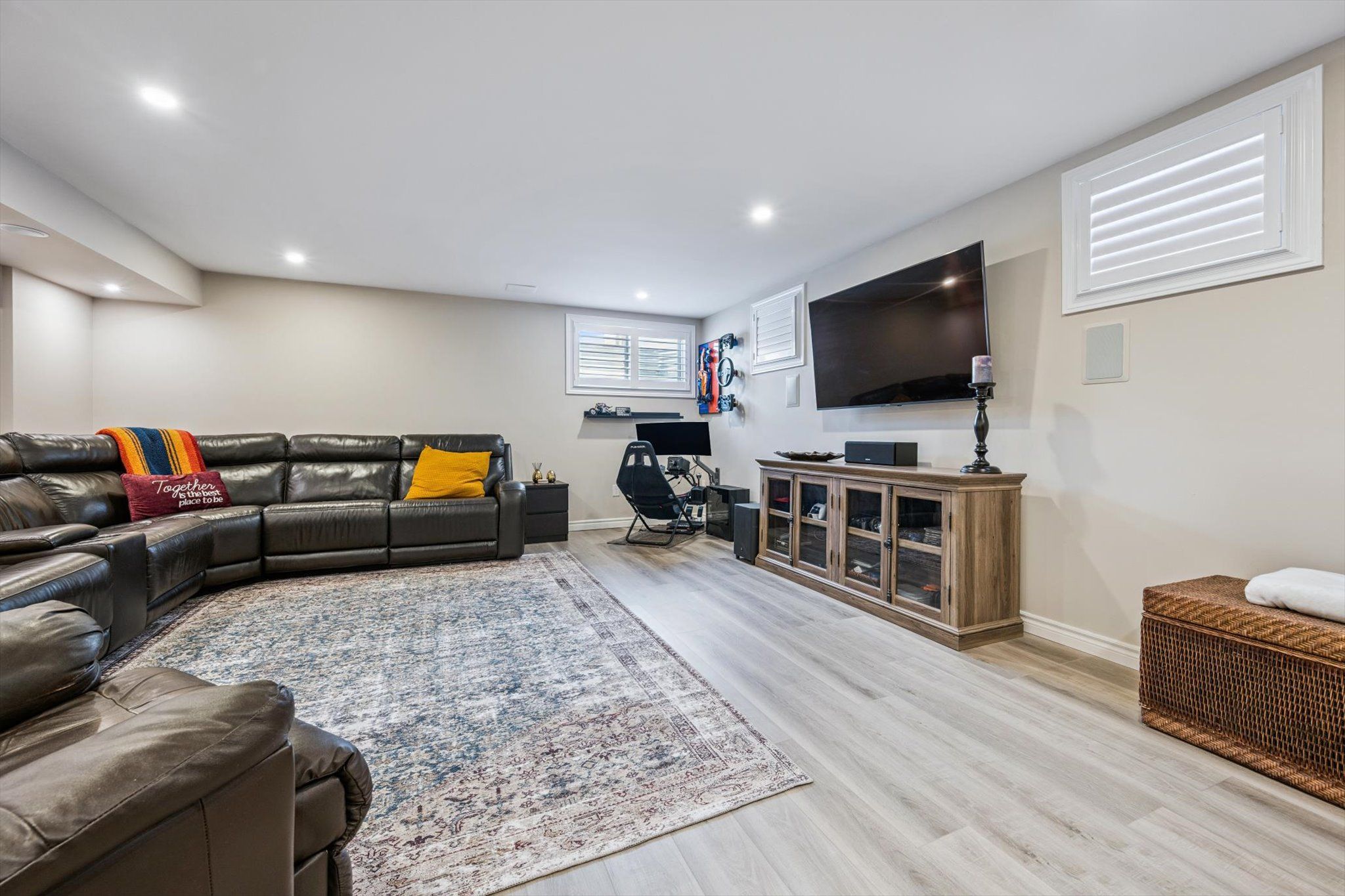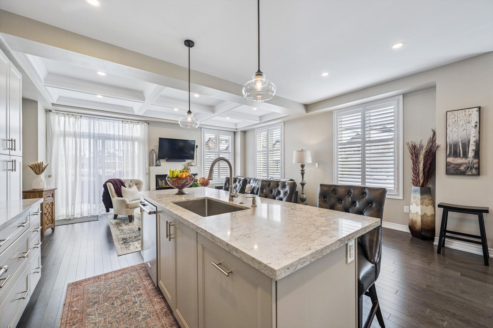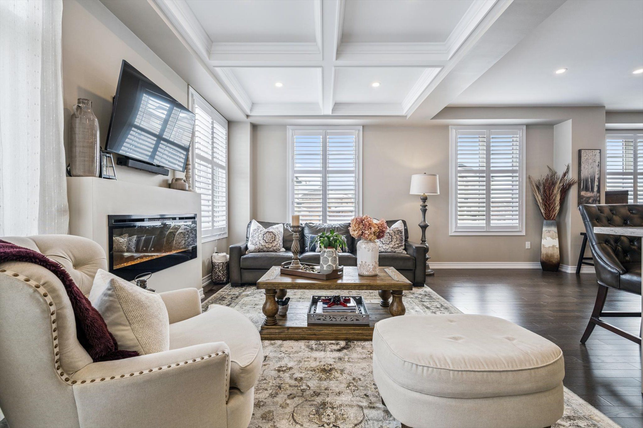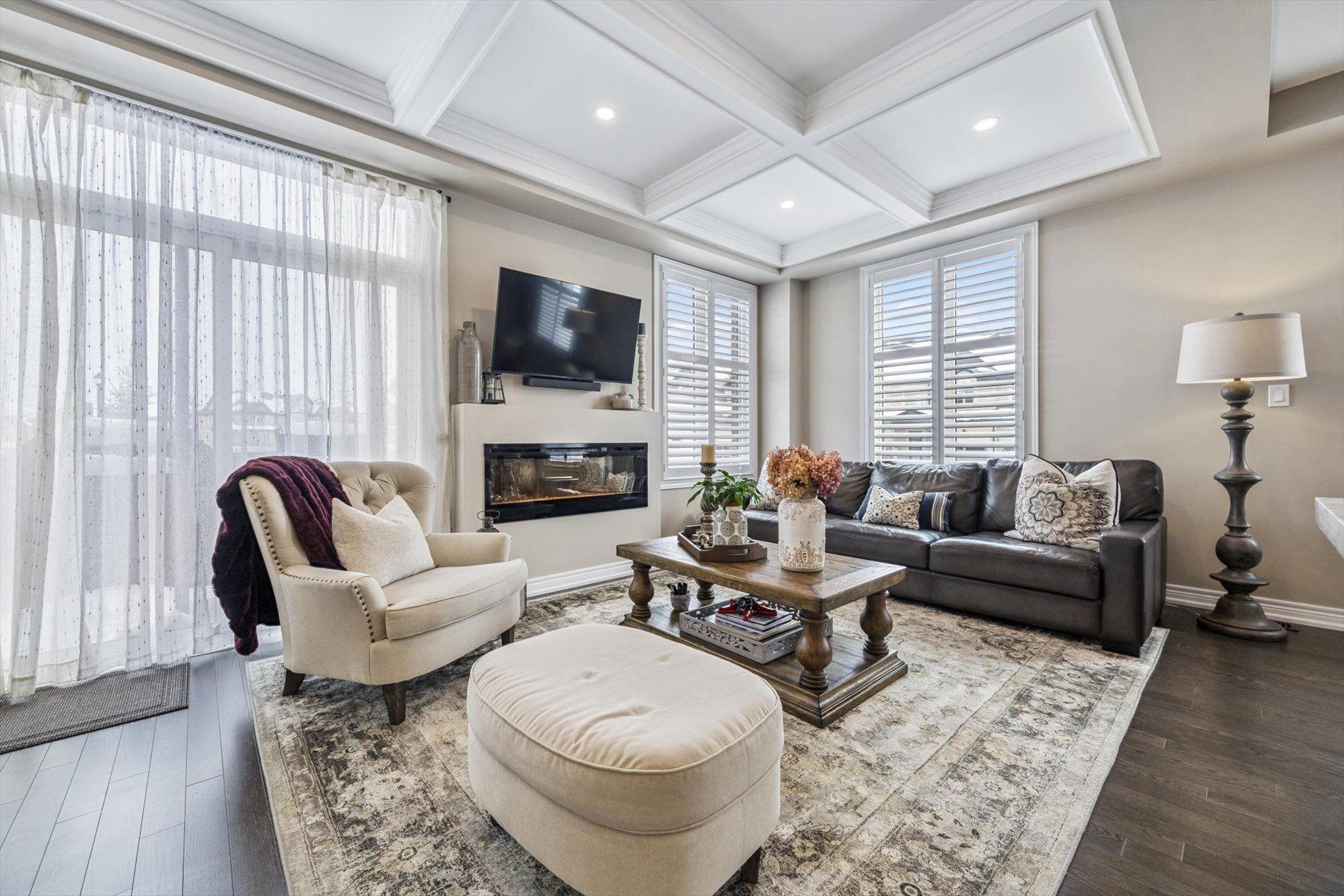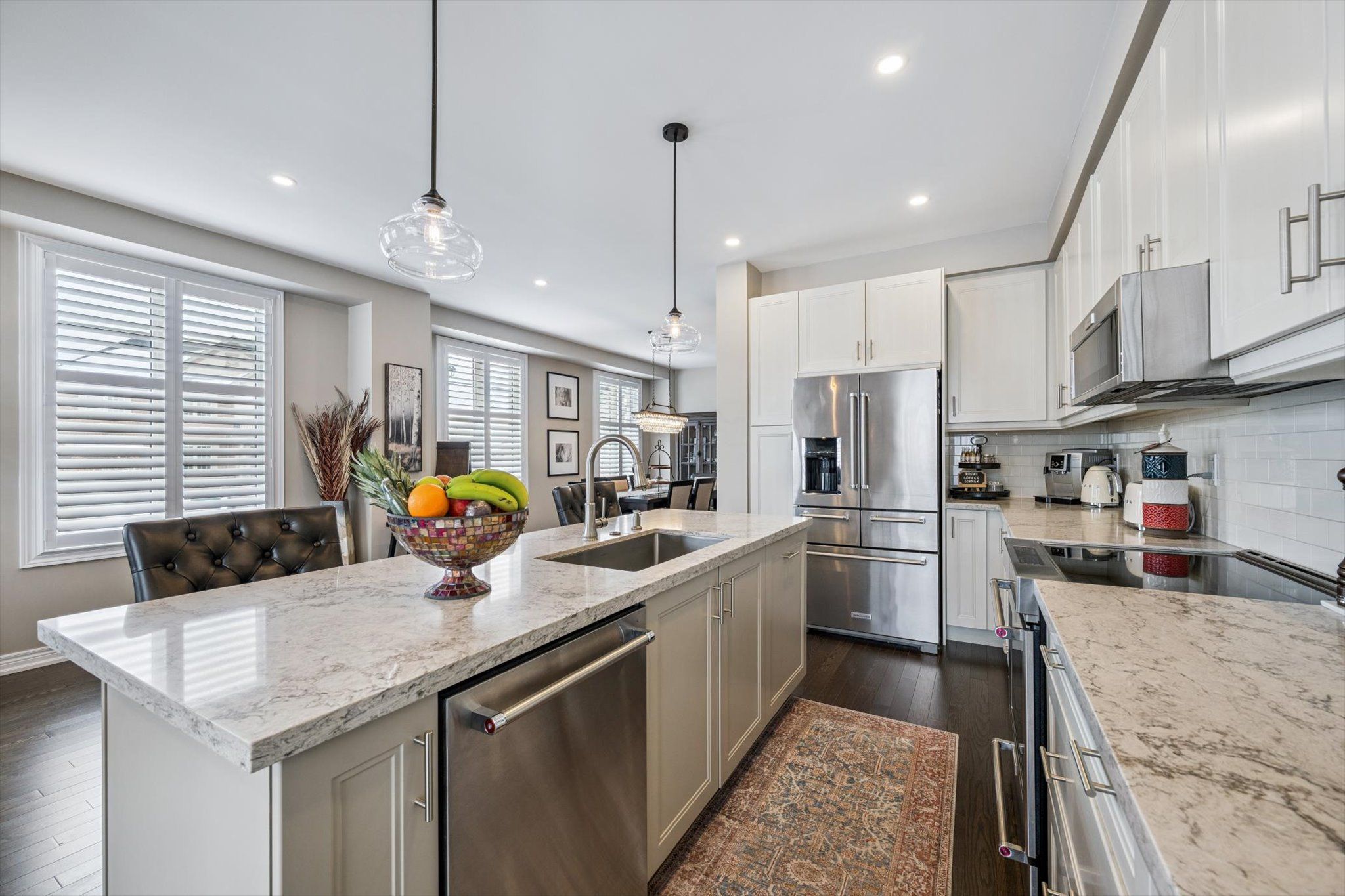 Refined design, elevated comfort, and exceptional craftsmanship define this beautifully curated residence at 1383 farmstead - a fully carpet-free home where every finish has been thoughtfully selected to create a timeless and sophisticated living experience. The stunning open-concept main floor showcases rich hardwood flooring, elegant coffered ceilings, california shutters throughout, and an abundance of natural light. A striking wood staircase with wrought-iron spindles adds architectural interest, while upscale light fixtures and pot lights create a warm, refined ambiance. The designer kitchen is both functional and impressive, featuring granite countertops, under-cabinet lighting, a coordinated backsplash, and impeccable craftsmanship. A discreet powder room, versatile office or piano room, and an elegant electric fireplace complete this inviting and beautifully balanced level. Upstairs, three spacious bedrooms and two full bathrooms provide exceptional comfort. The second bedroom offers convenient ensuite privilege access, while the luxurious primary retreat features two walk-in closets and a spa-inspired ensuite with a 6-jet rainfall shower tower. Hardwood flooring continues throughout the upper level, complemented by ceramic tile in the bathrooms. A well-appointed laundry room and rare walk-in linen closet add everyday practicality. The bright lower level extends the living space with a stylish open-concept great room finished in luxury vinyl plank flooring, california shutters, a four-piece bathroom with upscale finishes, wall-mounted speaker system, and generous storage. Furnace and a/c are nearly new, providing efficiency and peace of mind. Outdoors, enjoy a fully fenced yard with irrigation system, custom shed, and professionally landscaped gardens showcasing hydrangeas, hostas, and three japanese maples. An exceptional, meticulously maintained home where quality, design, and comfort come together seamlessly.