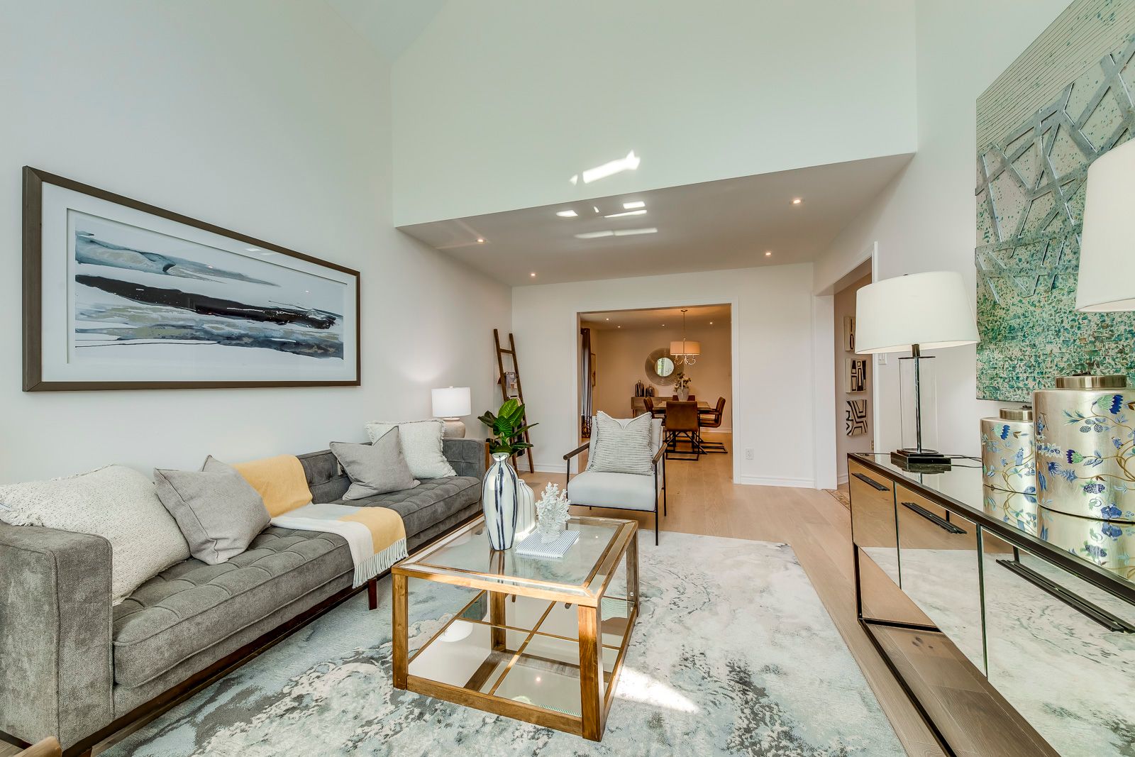 • Bright living room with vaulted ceilings and large windows for natural light.
