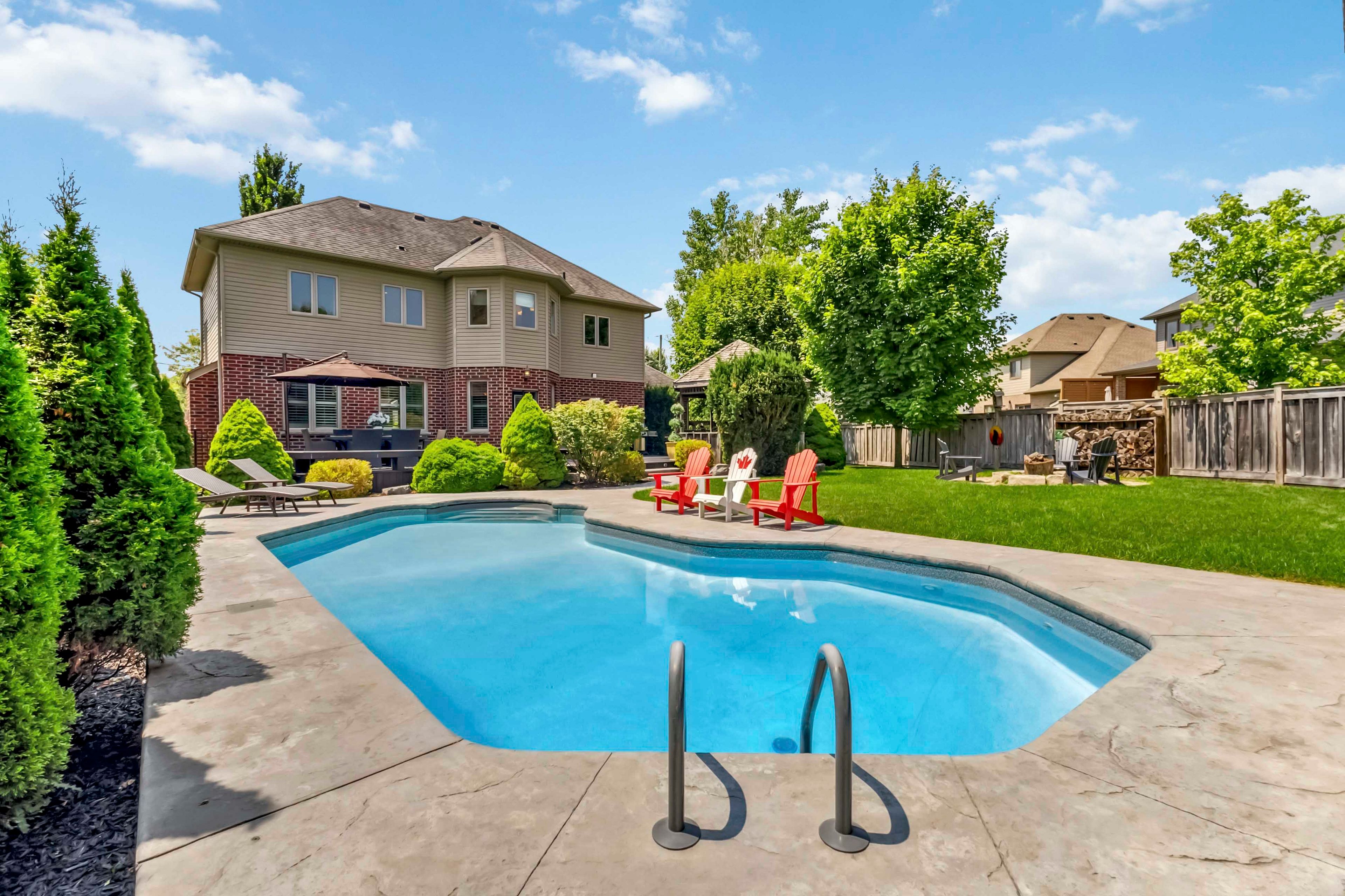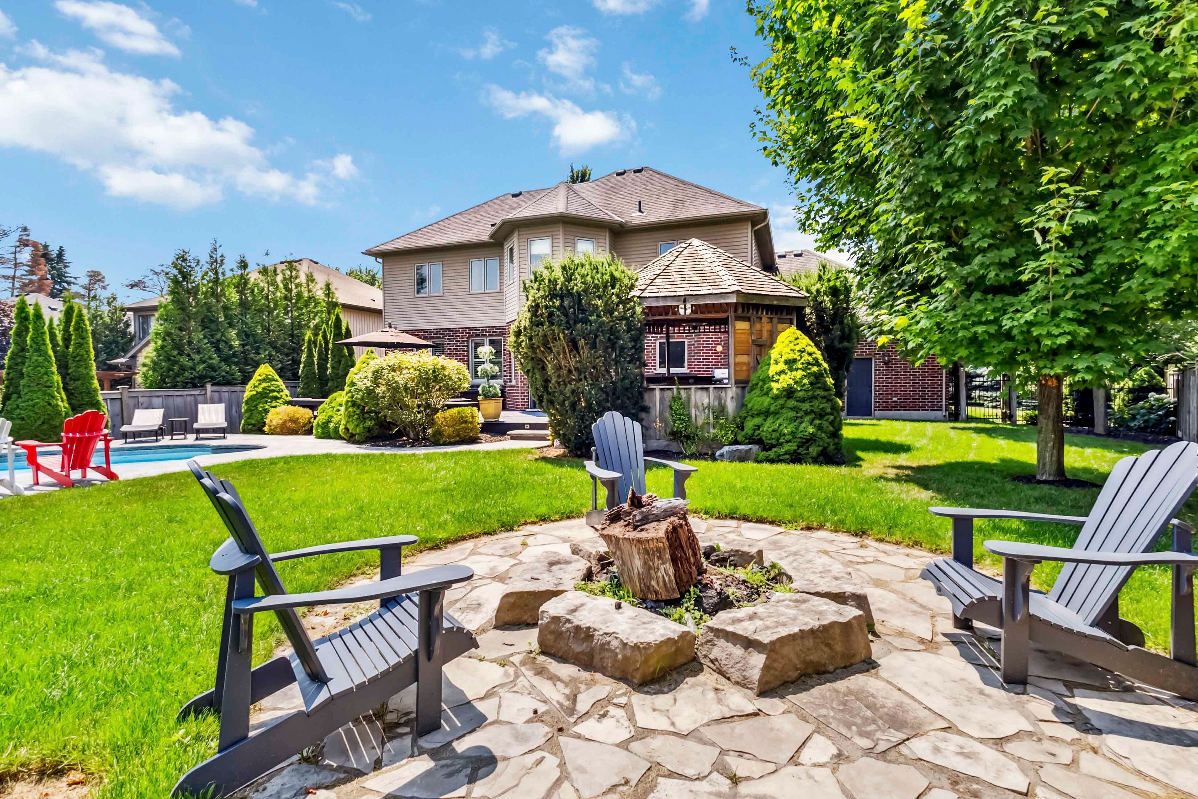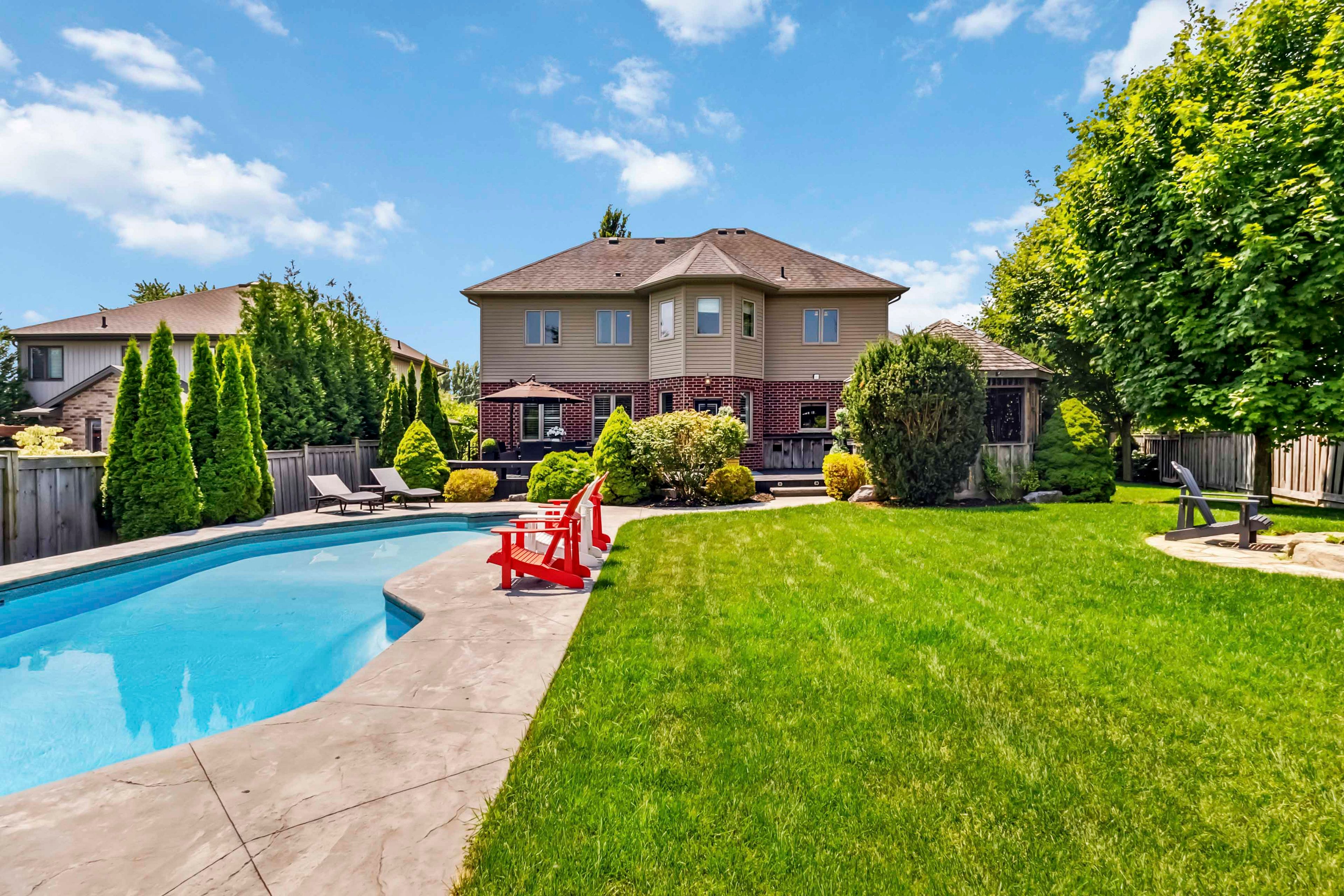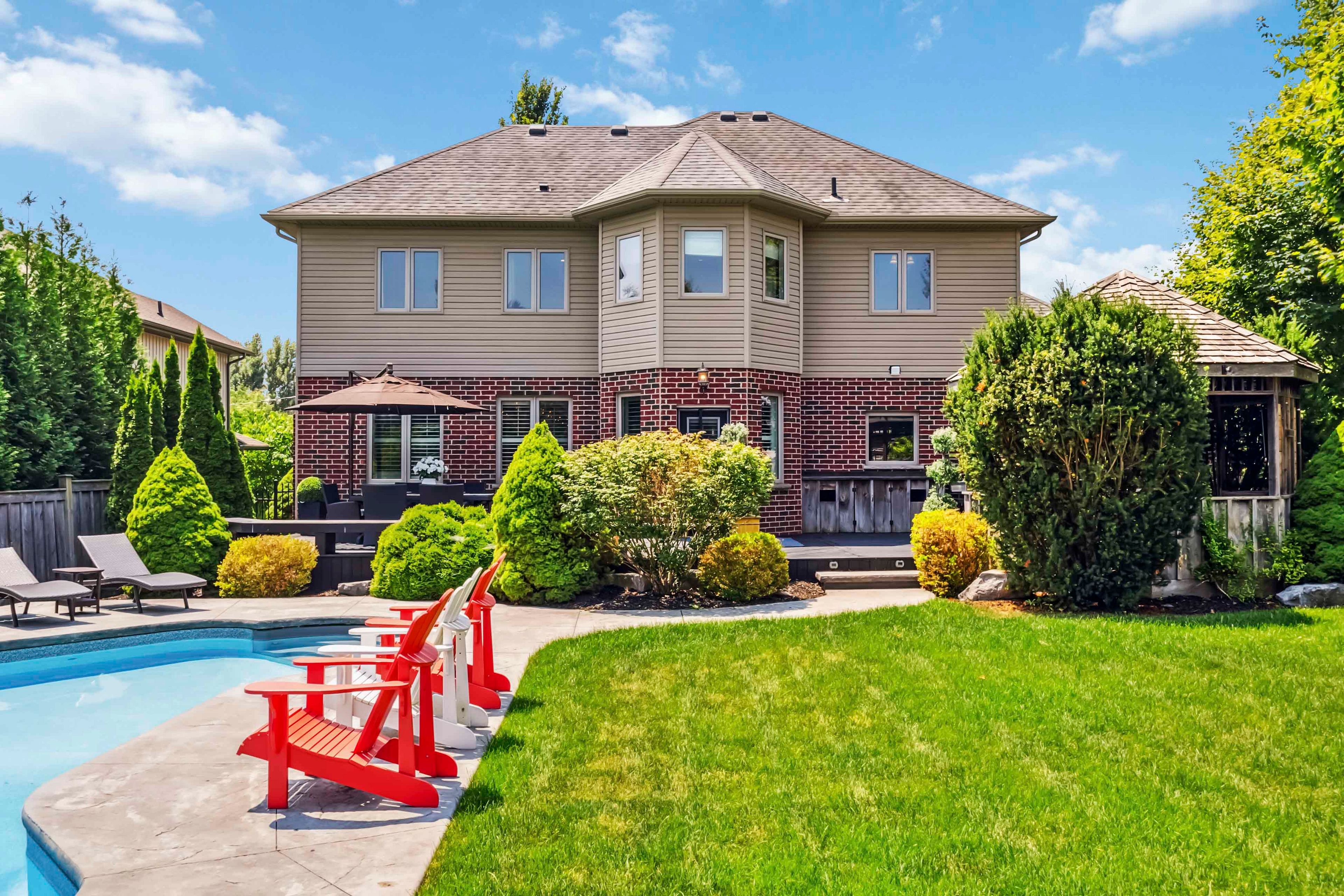 Welcome to this beautifully maintained 2-storey home offering 4+1 spacious bedrooms and 3. 5 bathroomsperfect for a growing family or those who love to entertain. Nestled on a picturesque lot with mature trees and beautifully landscaped gardens, this home combines comfort, functionality, and resort-style living. The inviting open-concept main level features a custom kitchen with a stunning tile backsplash, a large walk-in pantry, and modern finishes including a brand new quartz counter top that will inspire your inner chef. Some rooms and lower level have been freshly painted. A versatile den or office on the main floor is currently set up as a hair salon but can easily be transformed to suit your needs. This home comes equipped with smart lights interior and exterior. Upstairs, the spacious principal bedroom is a true retreat with a walk-in closet and a luxurious ensuite featuring a soaker tub and tiled glass shower. The fully finished basement offers even more living space with a large family room, a full bathroom, and an additional bedroomperfect for guests or a teen suite. Outside, the backyard oasis awaits. Enjoy summer days by the inground pool with stamped concrete surround, relax in the poolside cabana, or entertain at the outdoor bar under the gazebo, just off the newly stained deck. The front lawn manual lawn sprinklers can make keeping your front grass beautiful all summer and a sandpoint that provides watering to the backyard water bibs. A 3-car garage provides ample space for vehicles, storage, or a workshop. This home is the perfect blend of style, space, and serenitydont miss your opportunity to call it your own!