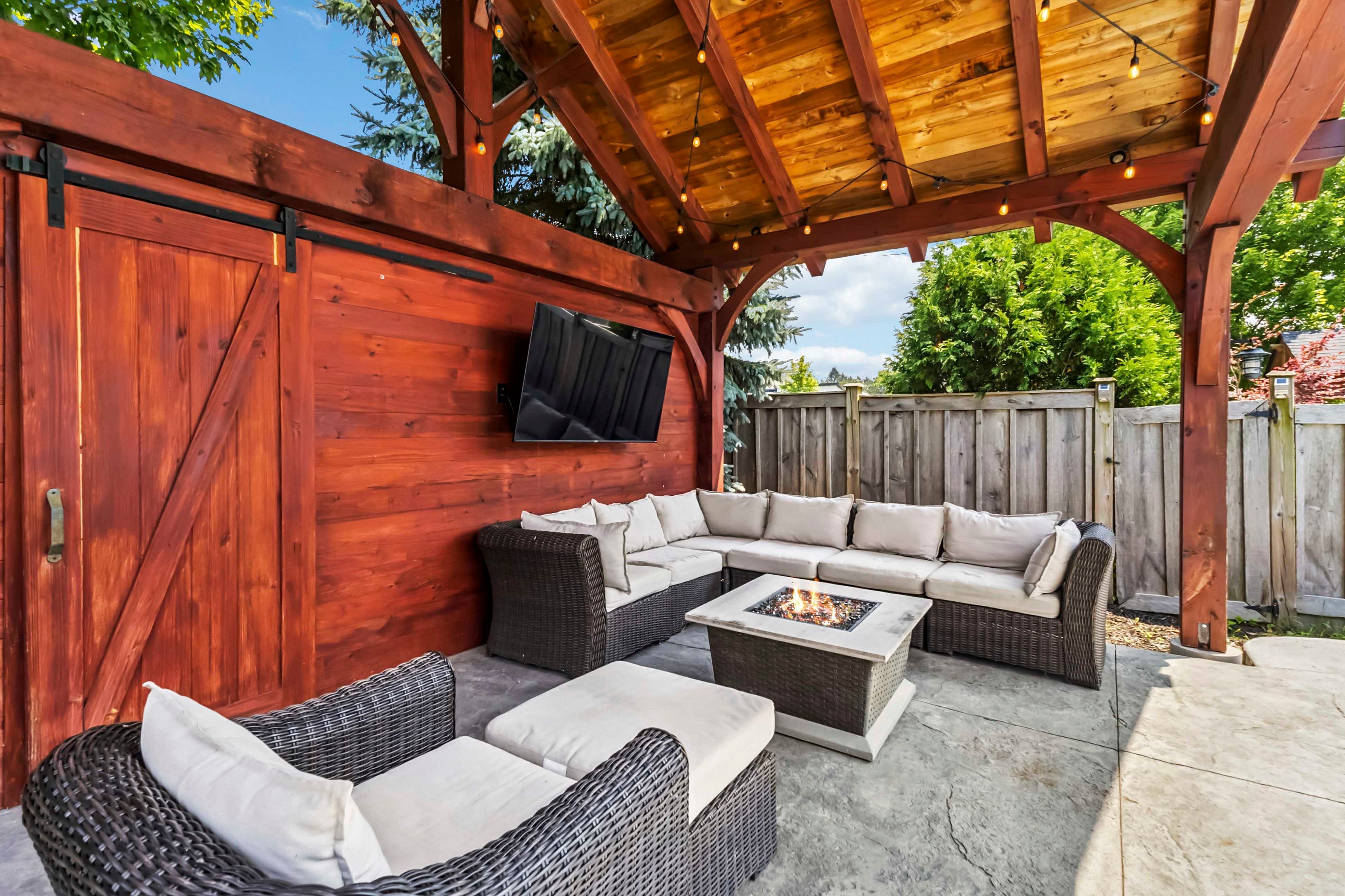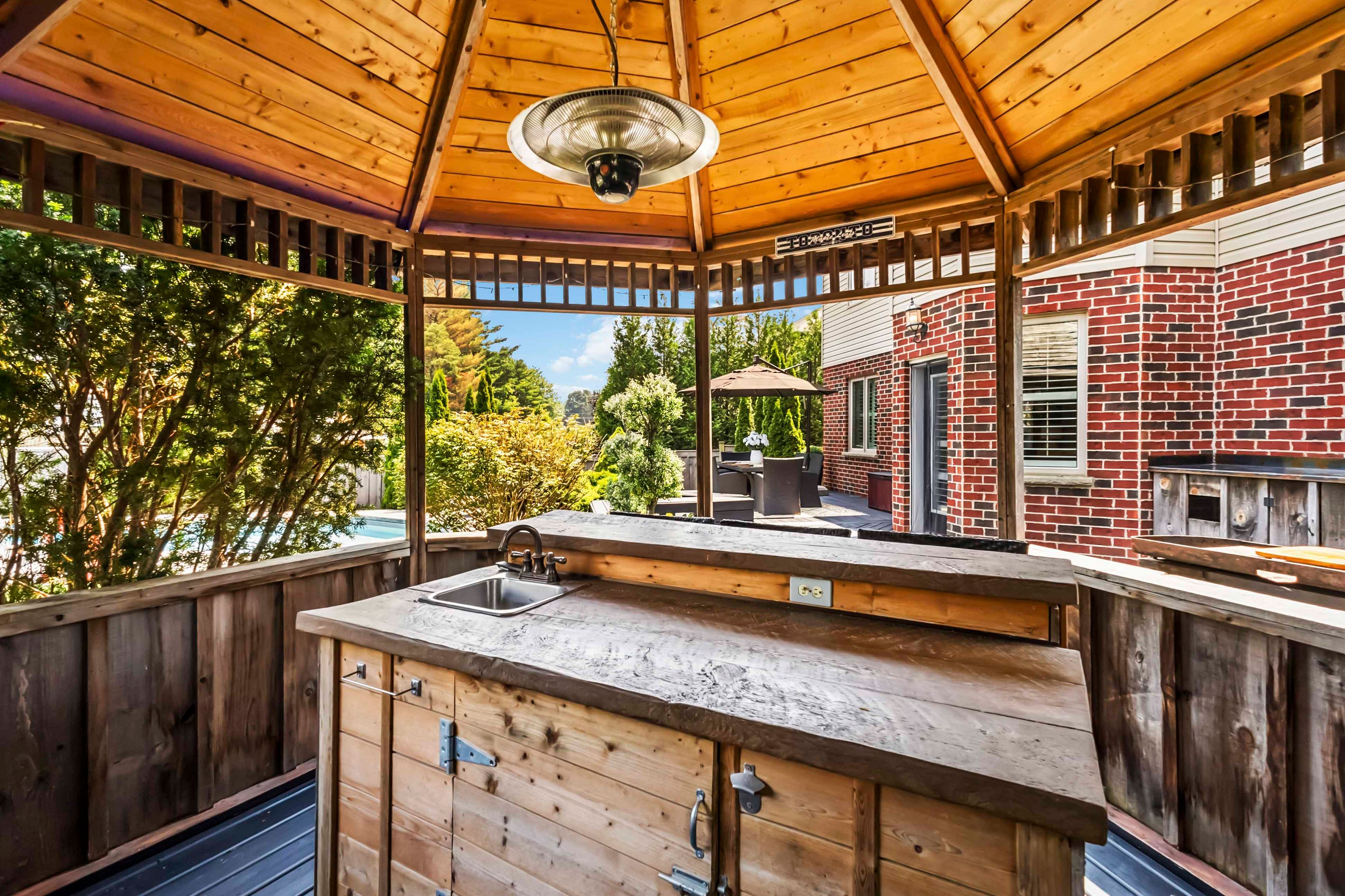 • Backyard oasis features an inground pool, cabana, and outdoor bar.