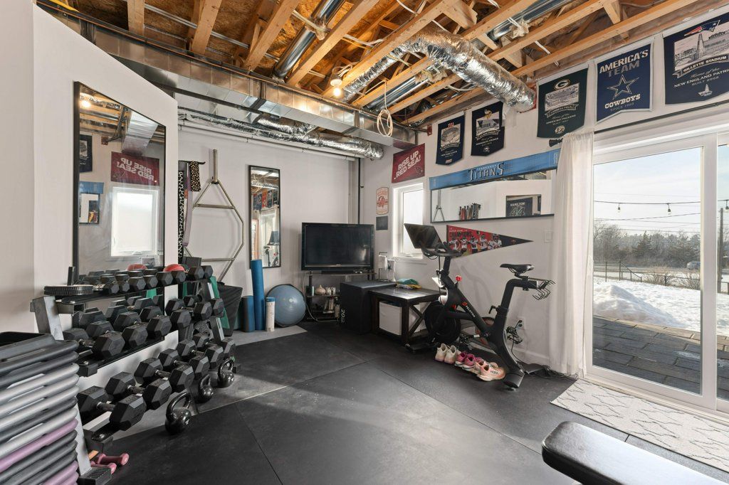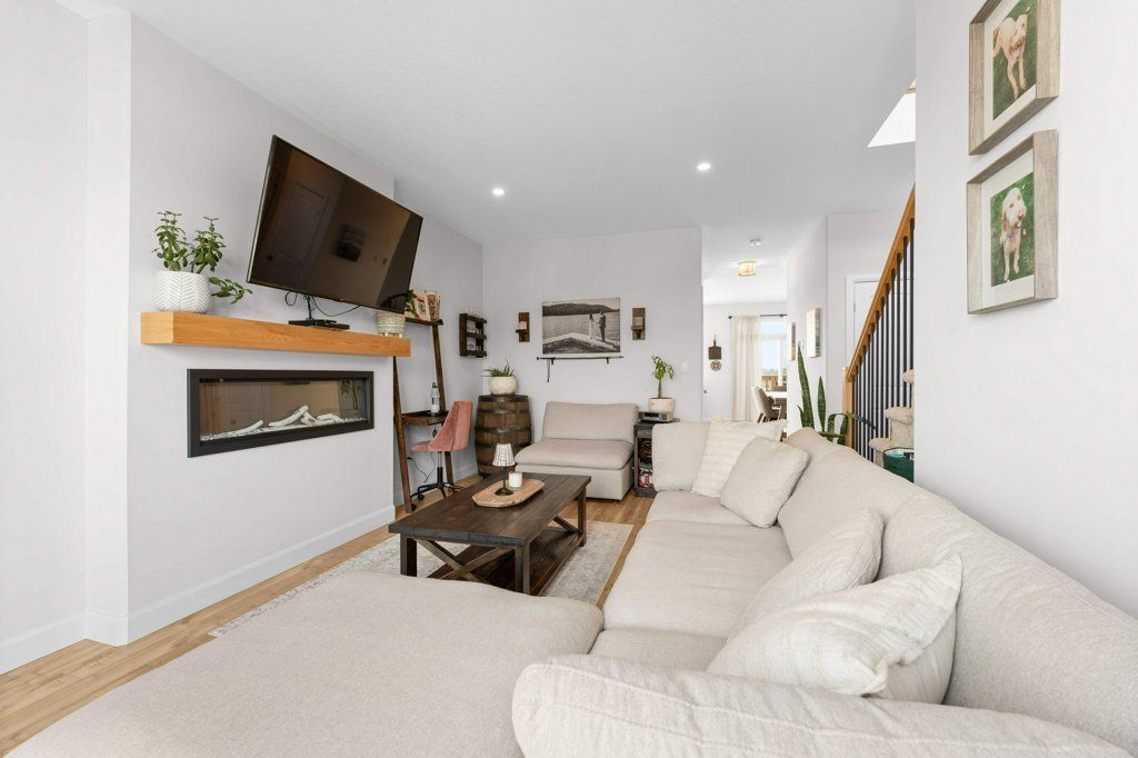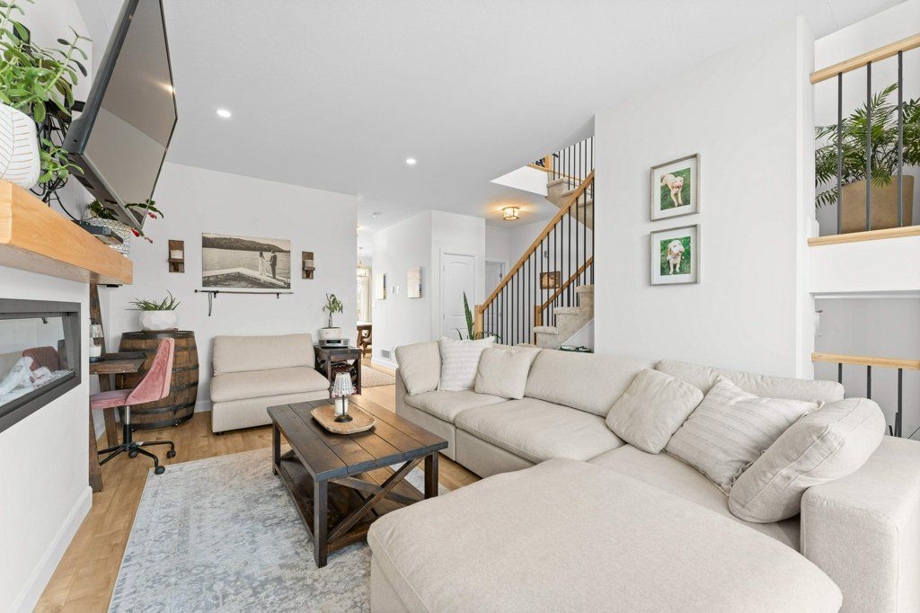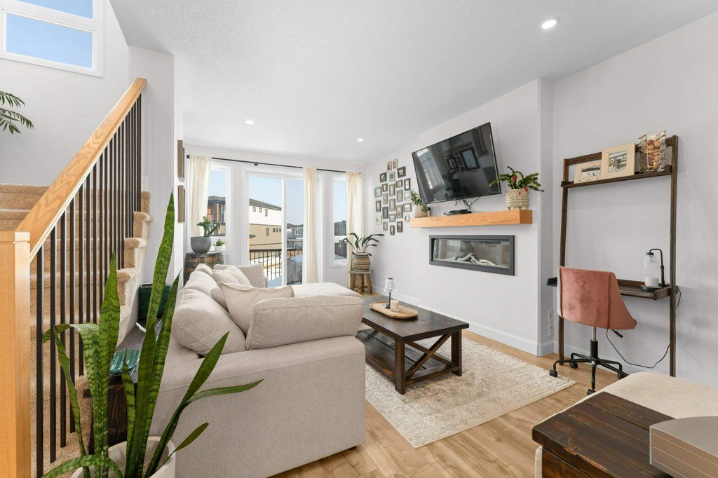 • Sunny living room with electric fireplace and large deck access.