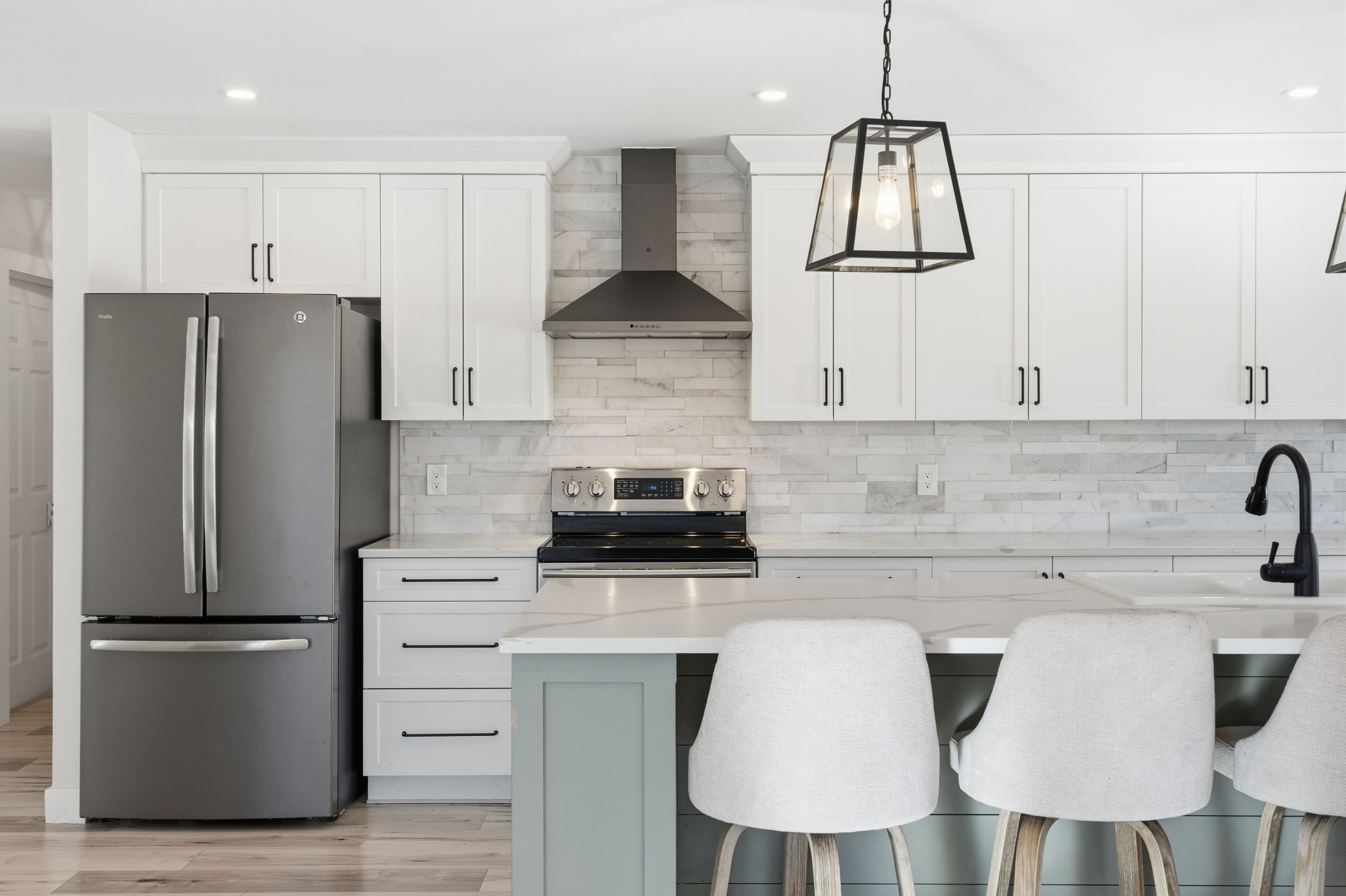 • Modern kitchen with stainless steel appliances and quartz countertops.
