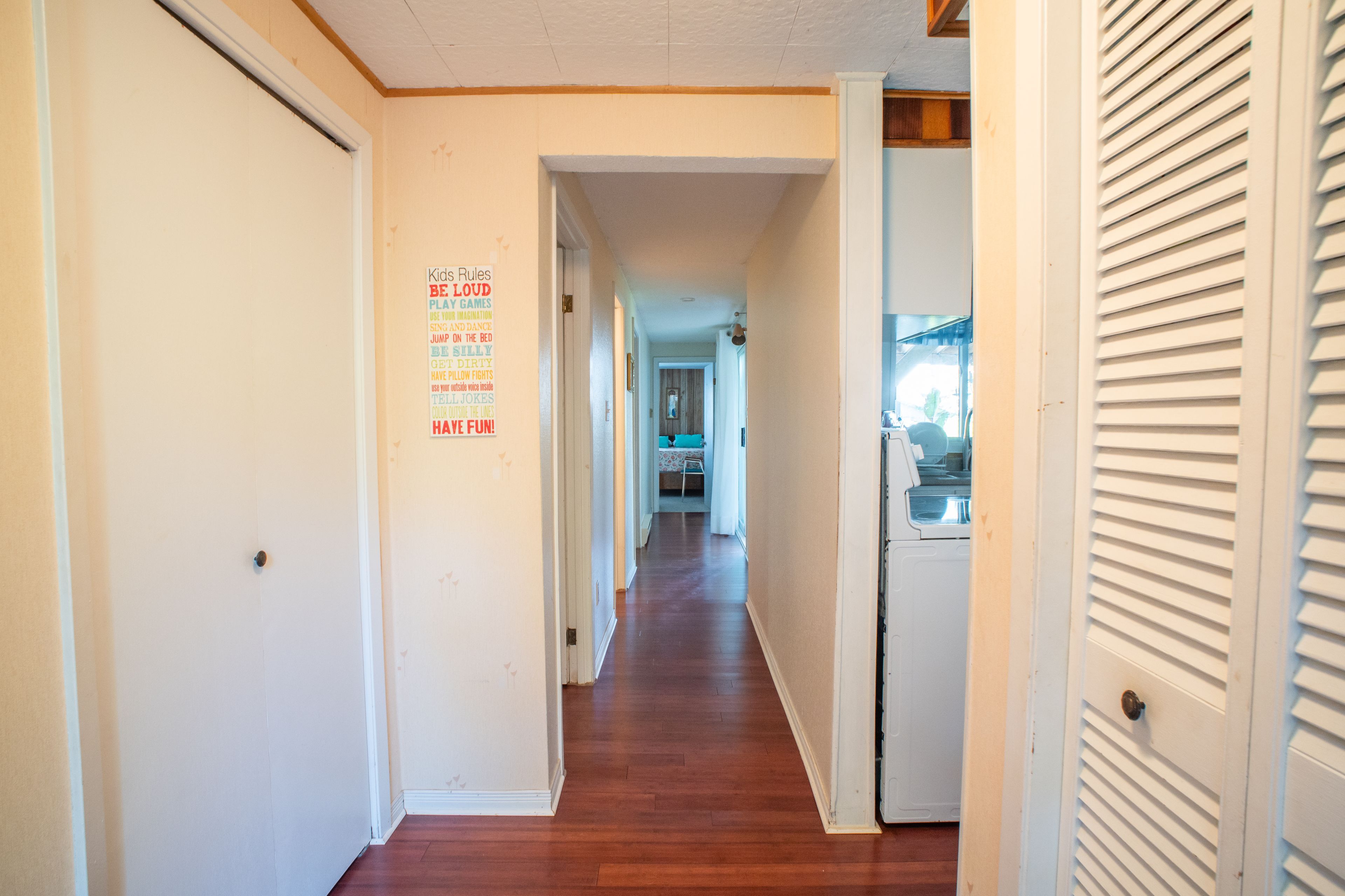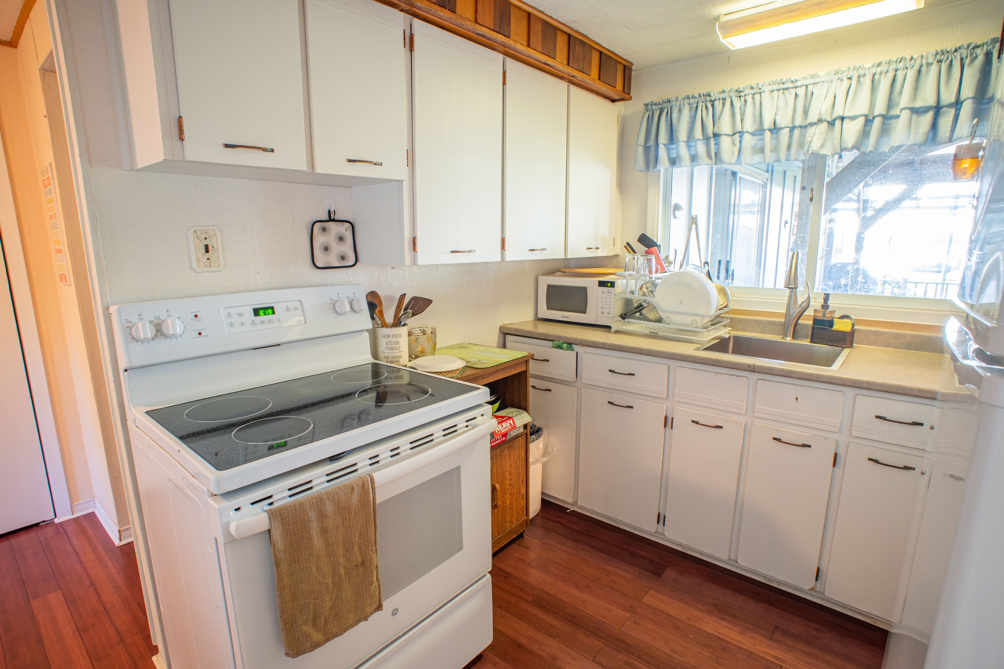 • Bright living room with vaulted ceilings and a woodstove for warmth.