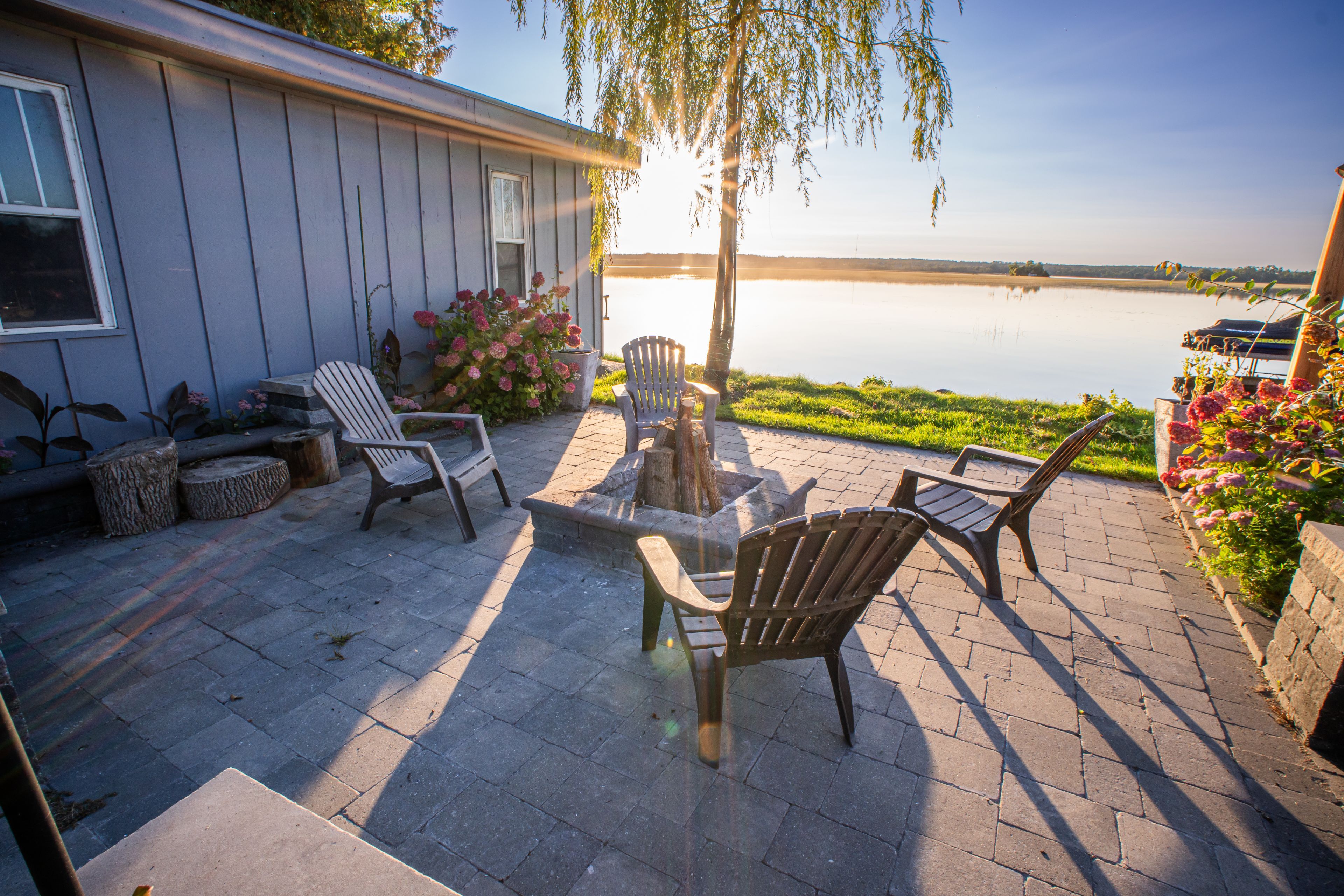 • Outdoor firepit patio and deck with gazebo overlook the water.