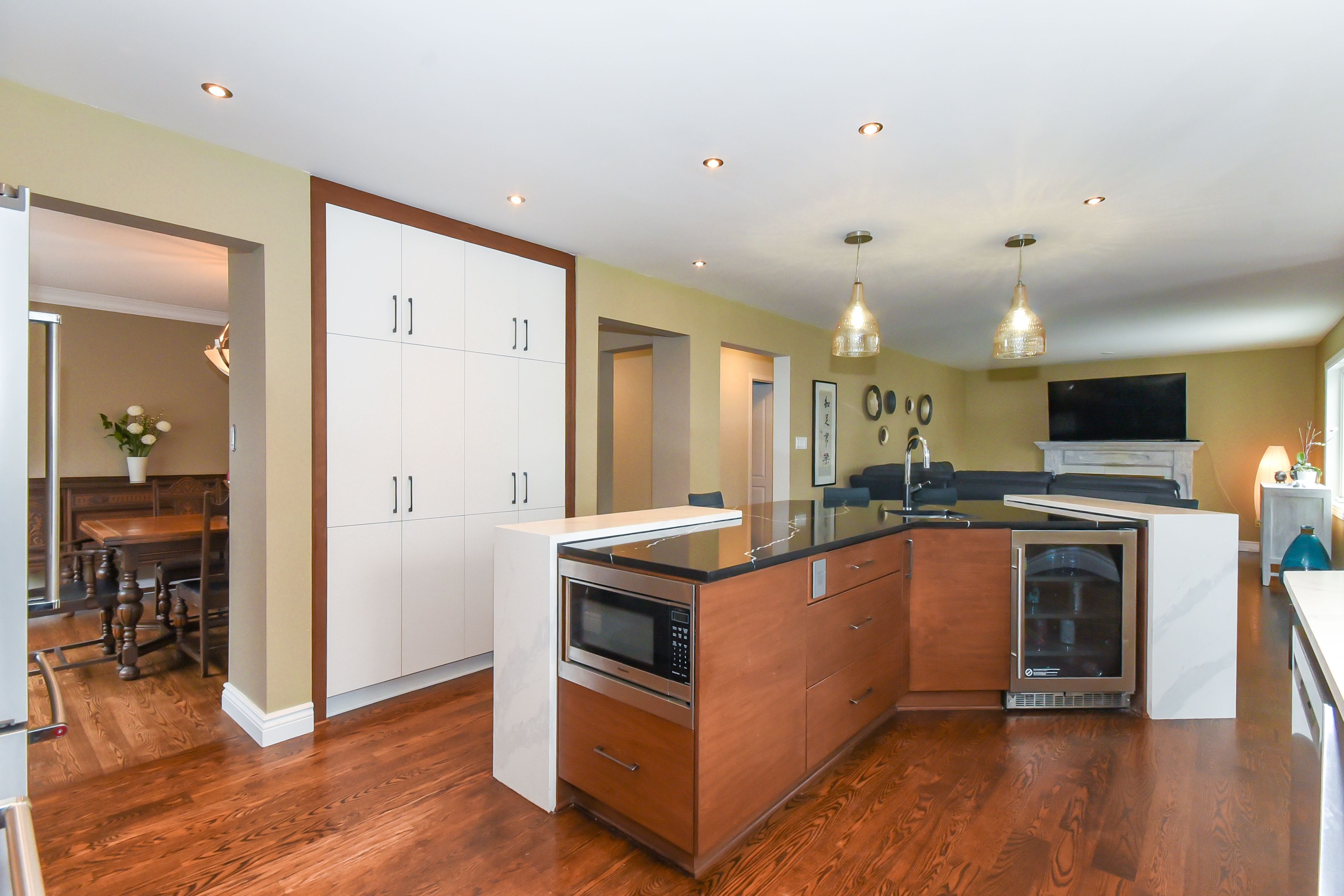 • Chef-inspired kitchen with quartz countertops and built-in wine fridge.
