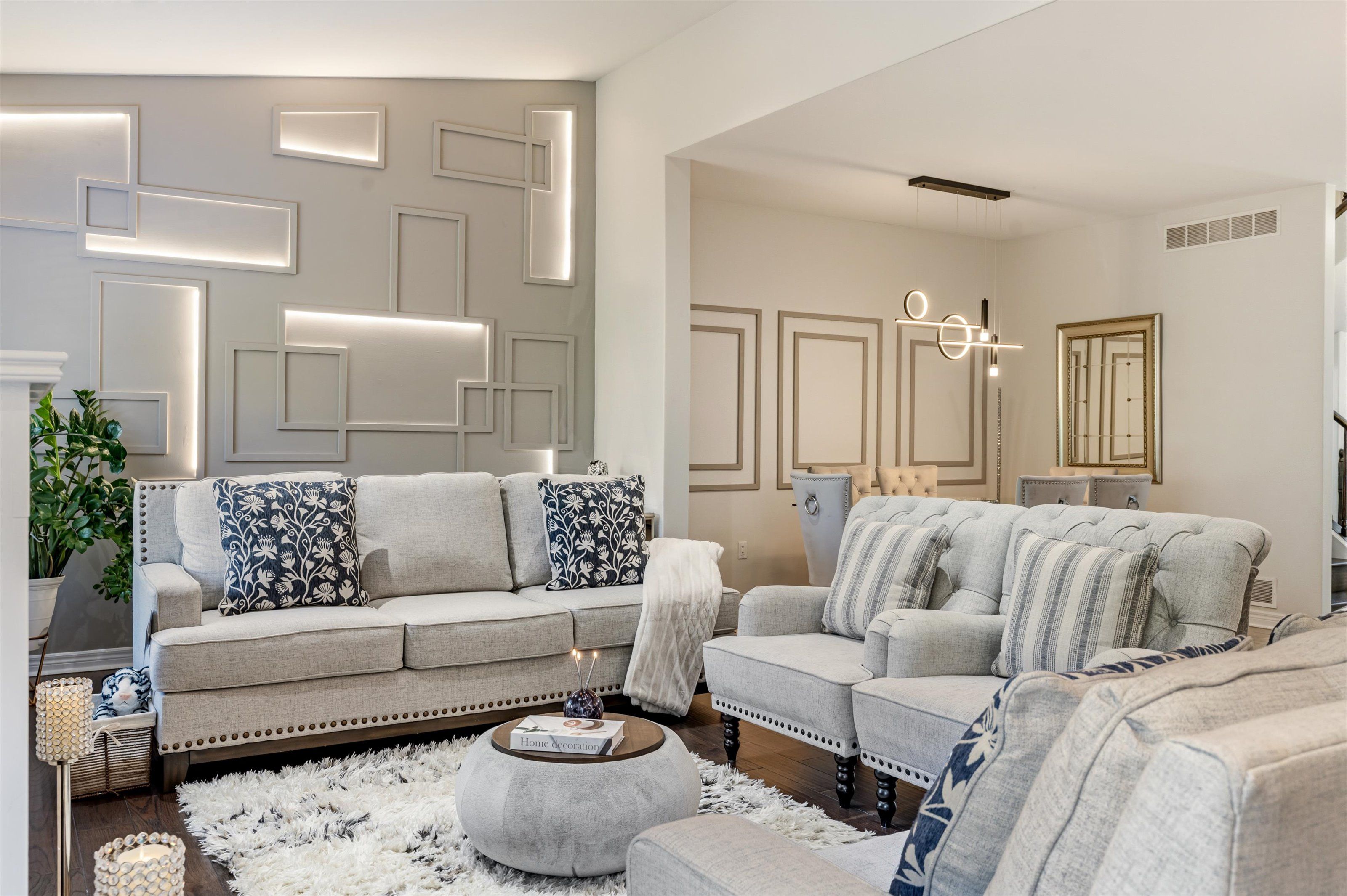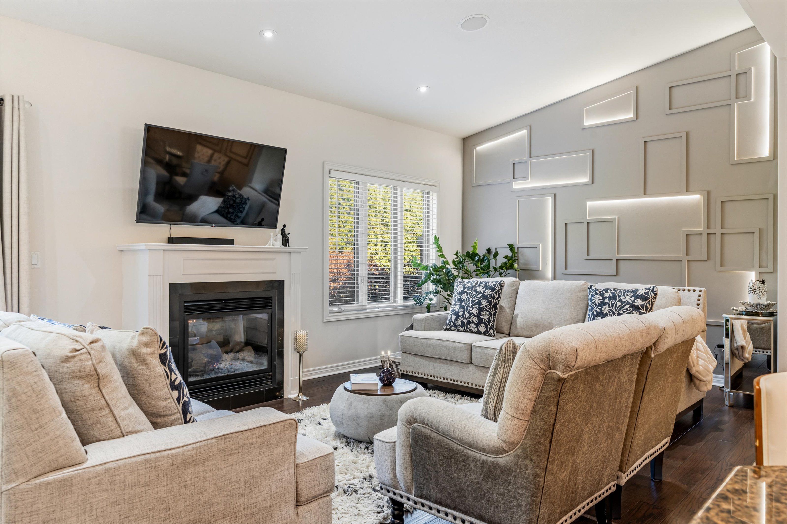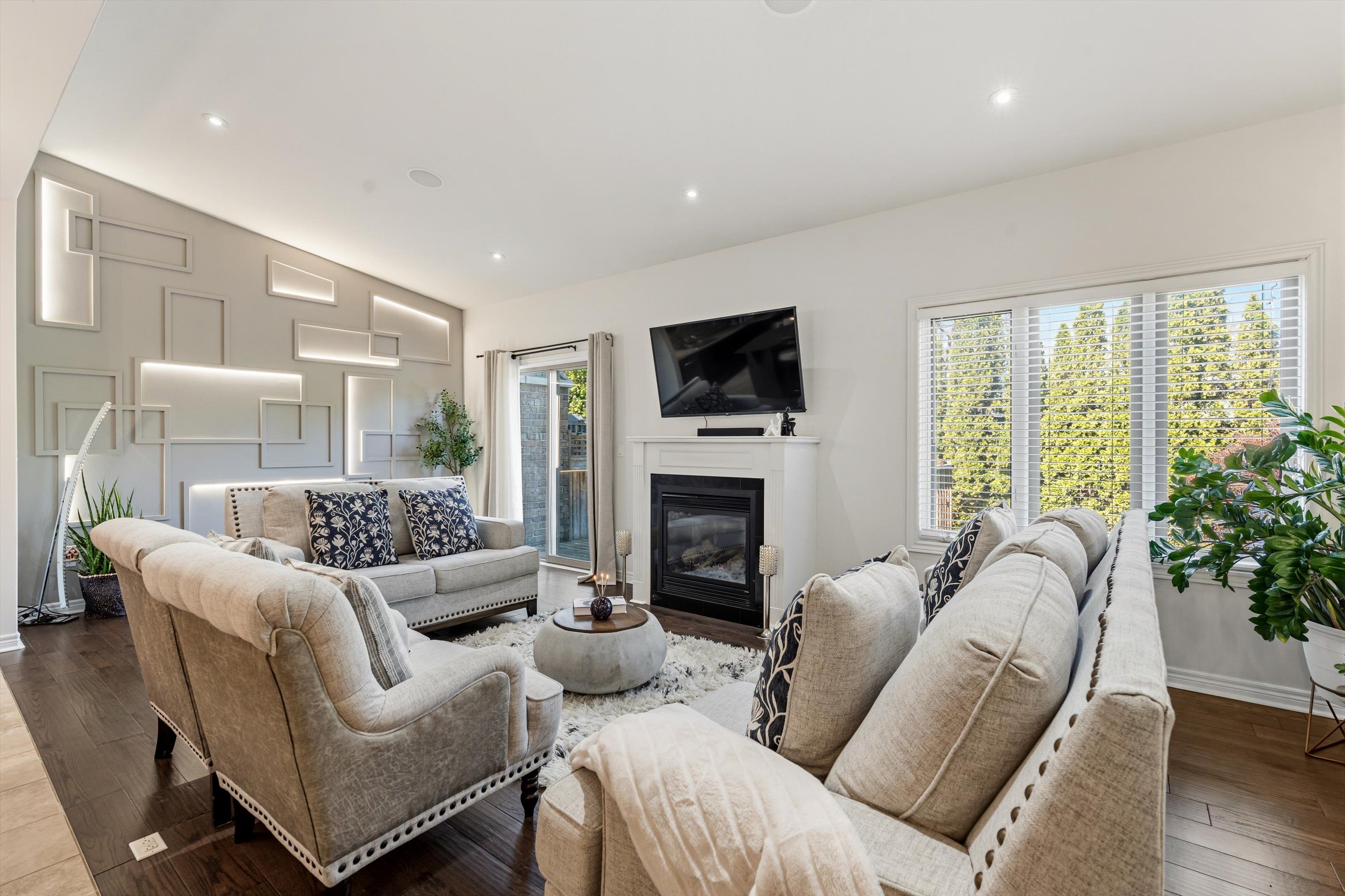 • Great room features pot lights, built-in speakers, and a cozy gas fireplace.