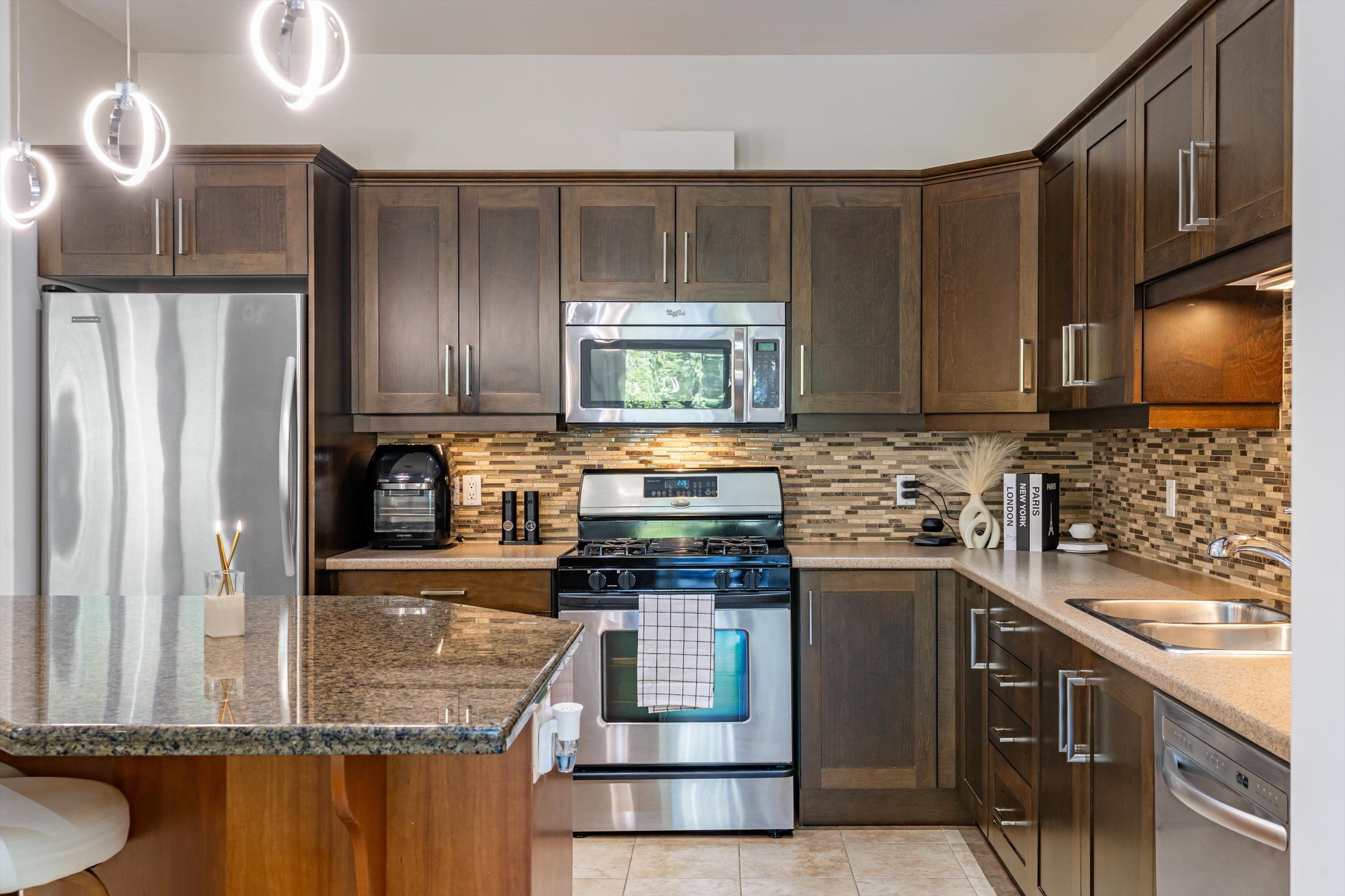 • Open kitchen with ample storage, stylish design, and a large island.