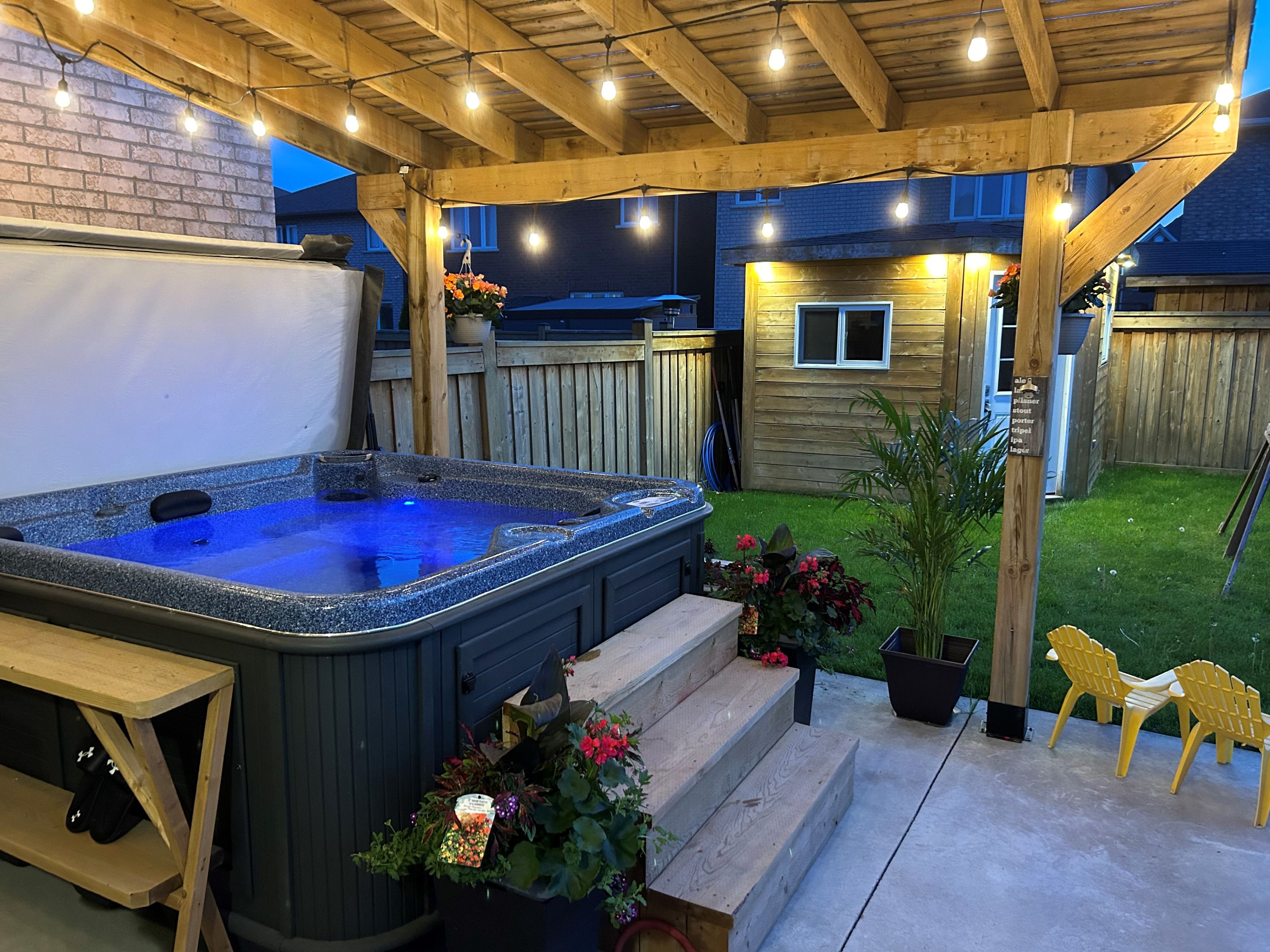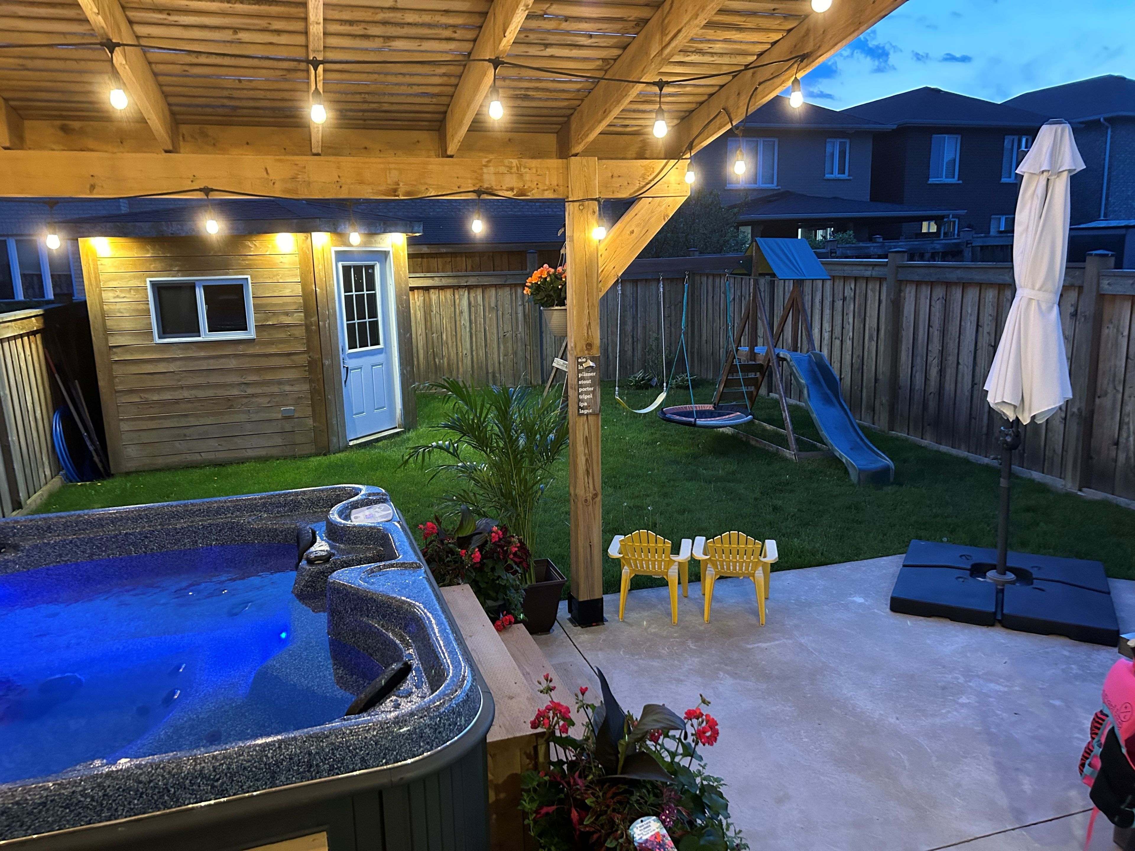 • Backyard features a shed and hot tub for outdoor entertaining.