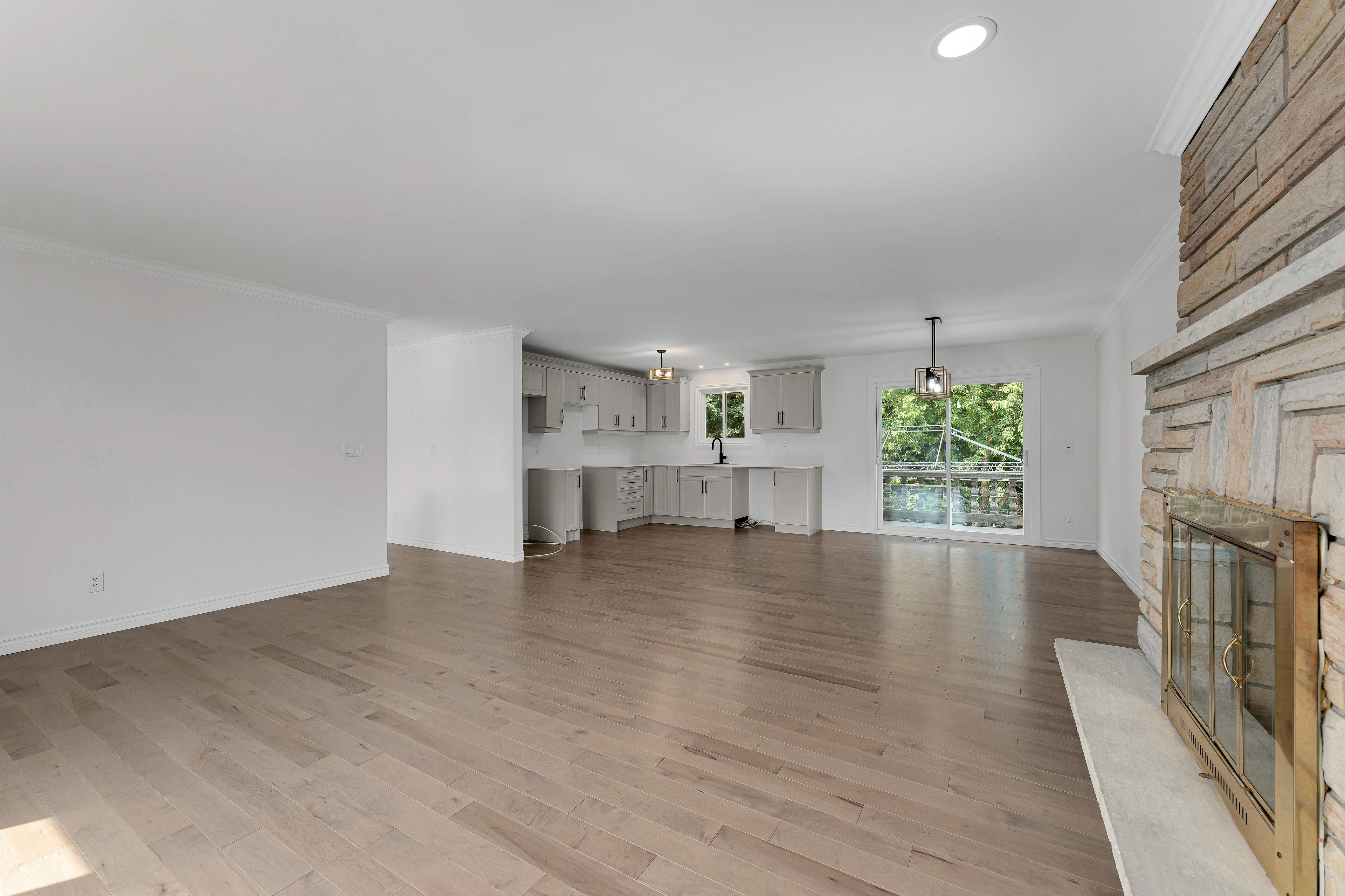 • Updated open concept layout with custom kitchen, hardwood floors, and stone fireplace.