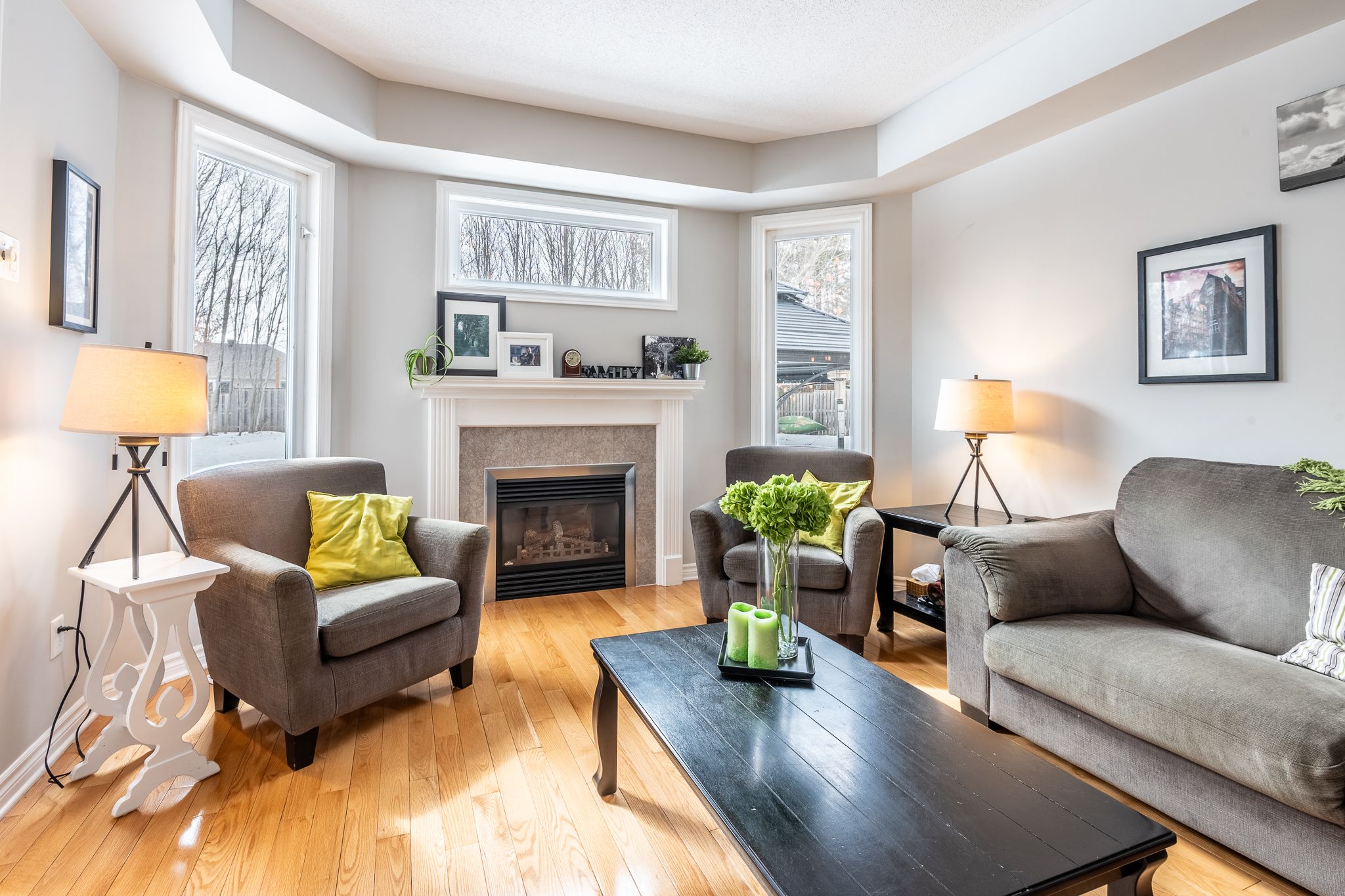 • Bright living area with a gas fireplace and patio doors to the outdoors.