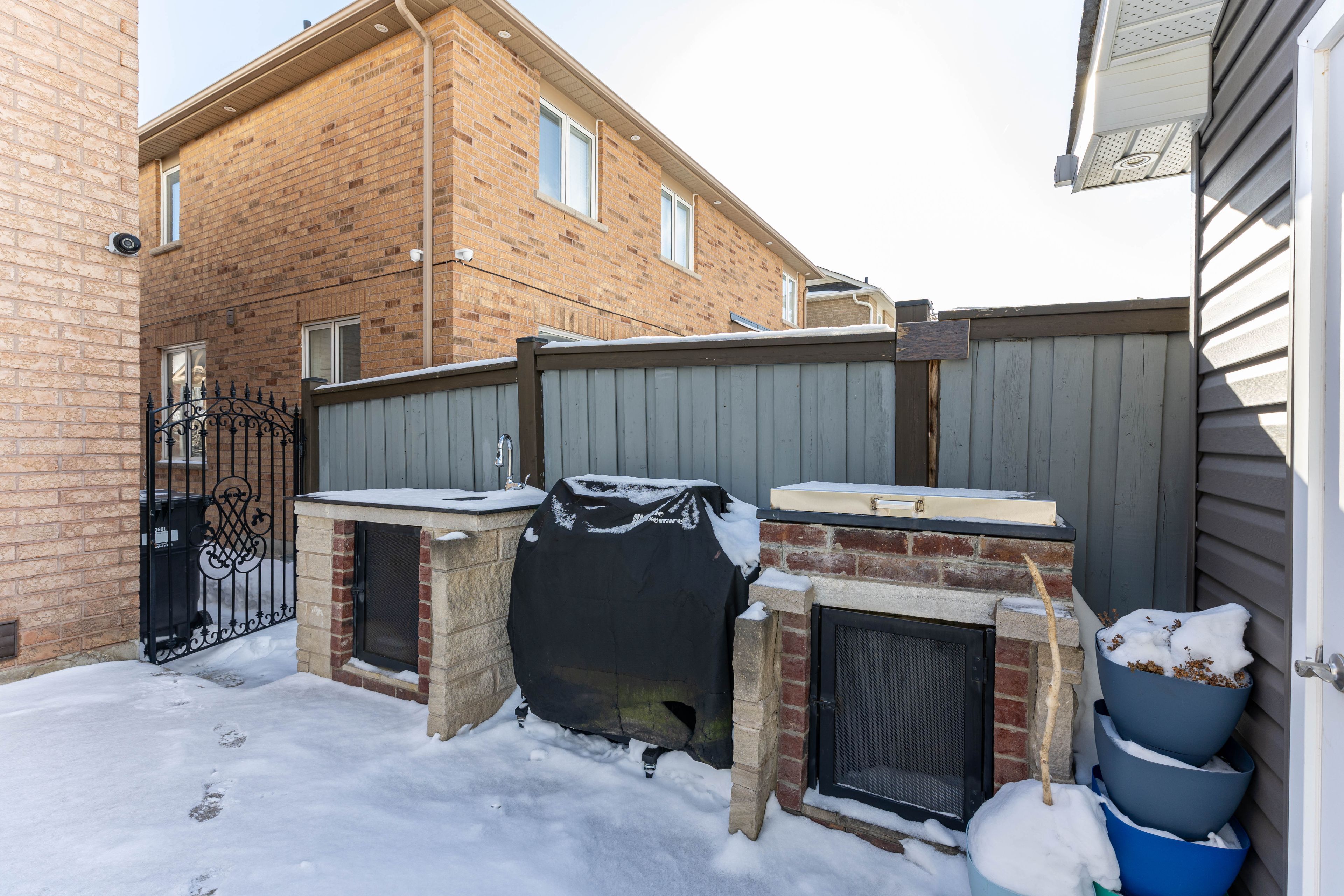 • Professionally landscaped yard with security cameras and custom fireplace.