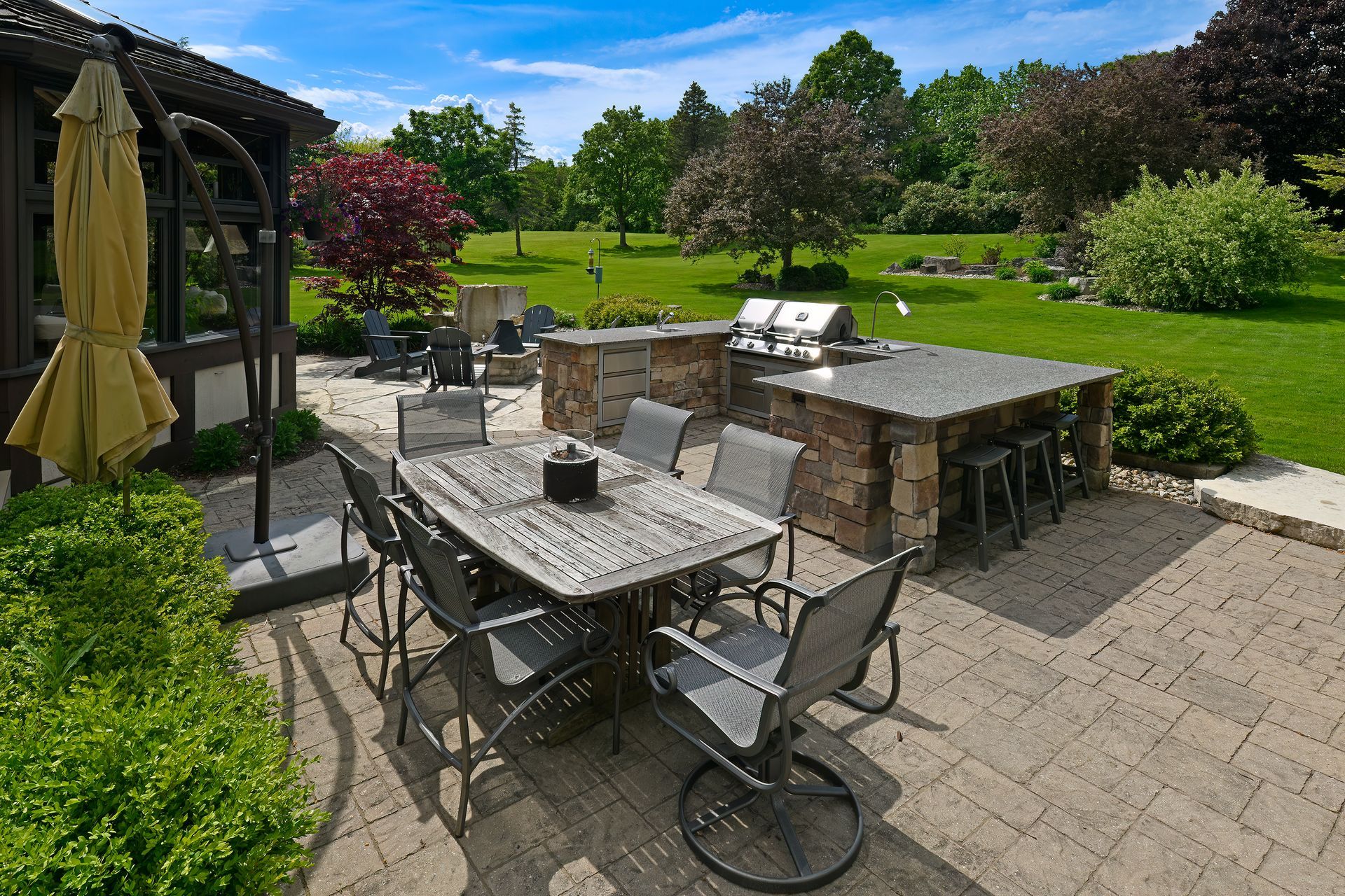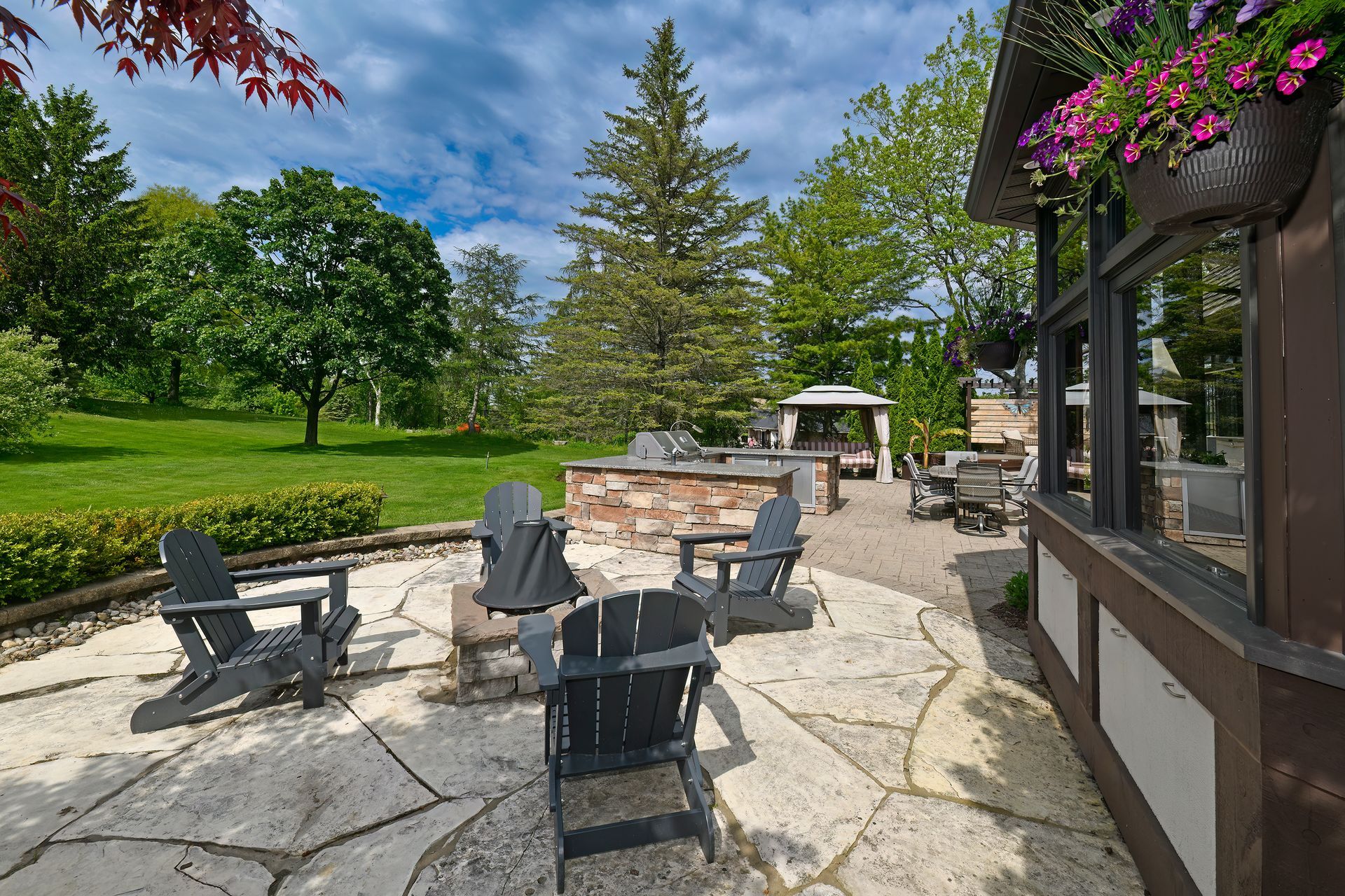 • Backyard oasis features outdoor kitchen, hot tub, and fire pit.
