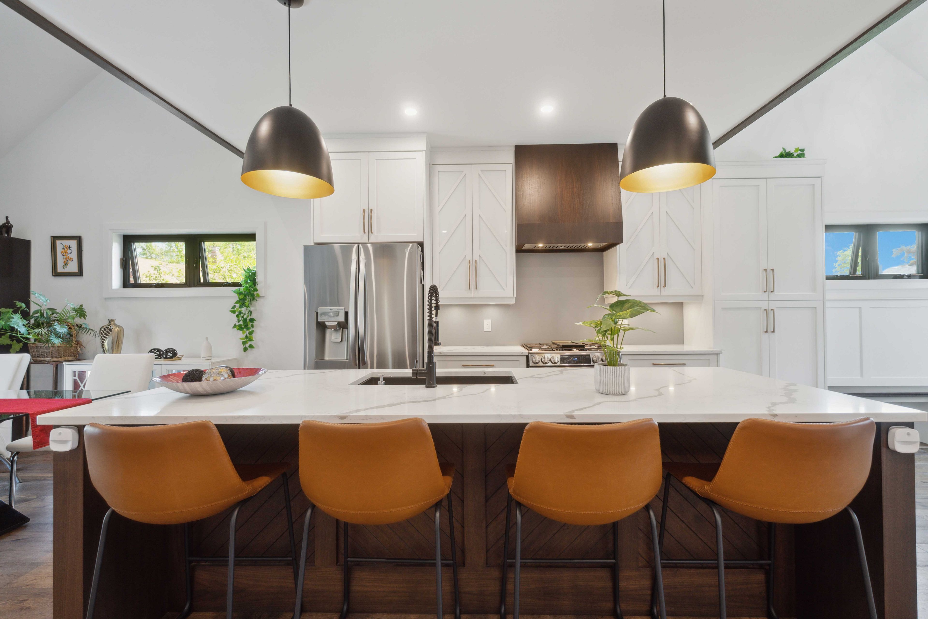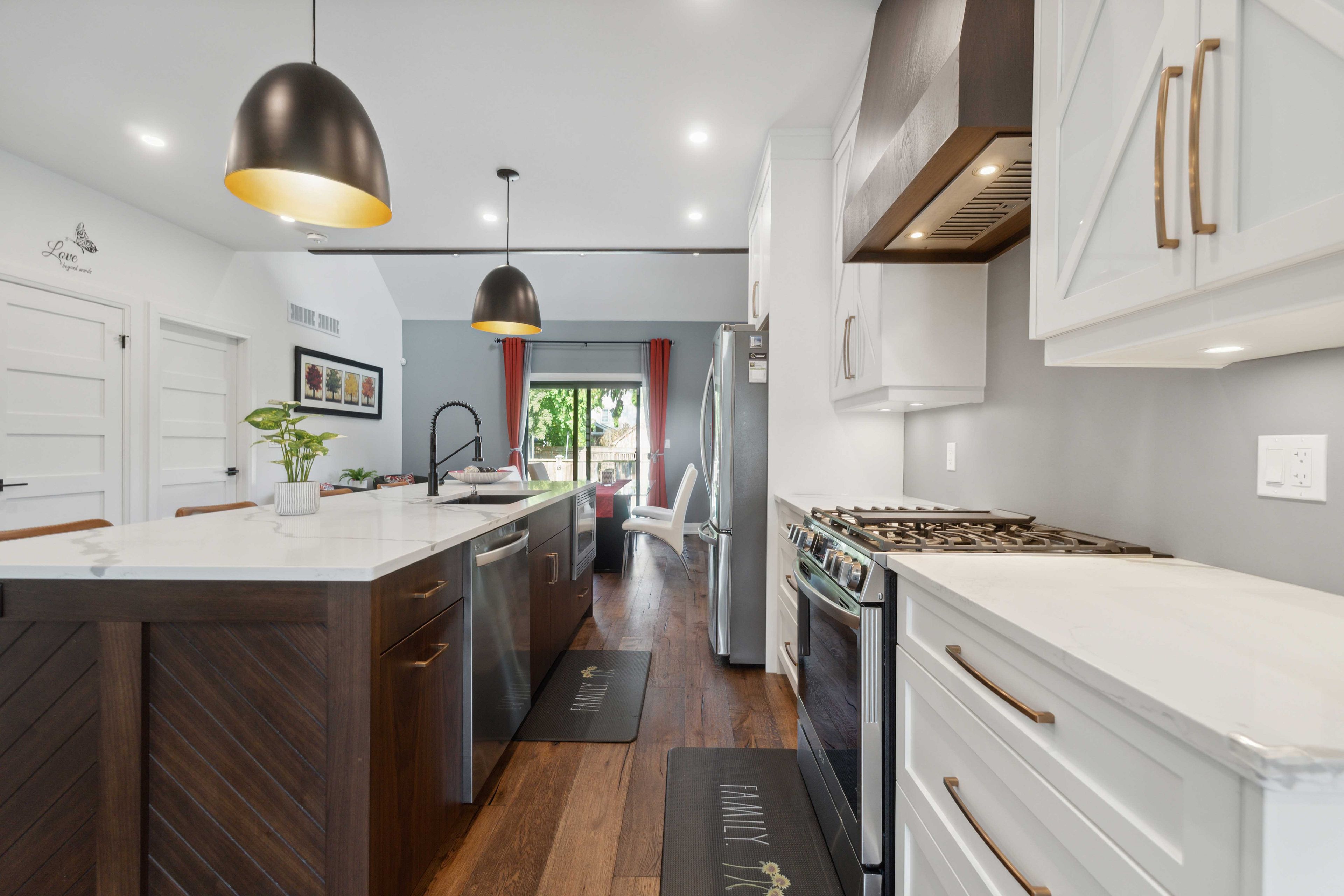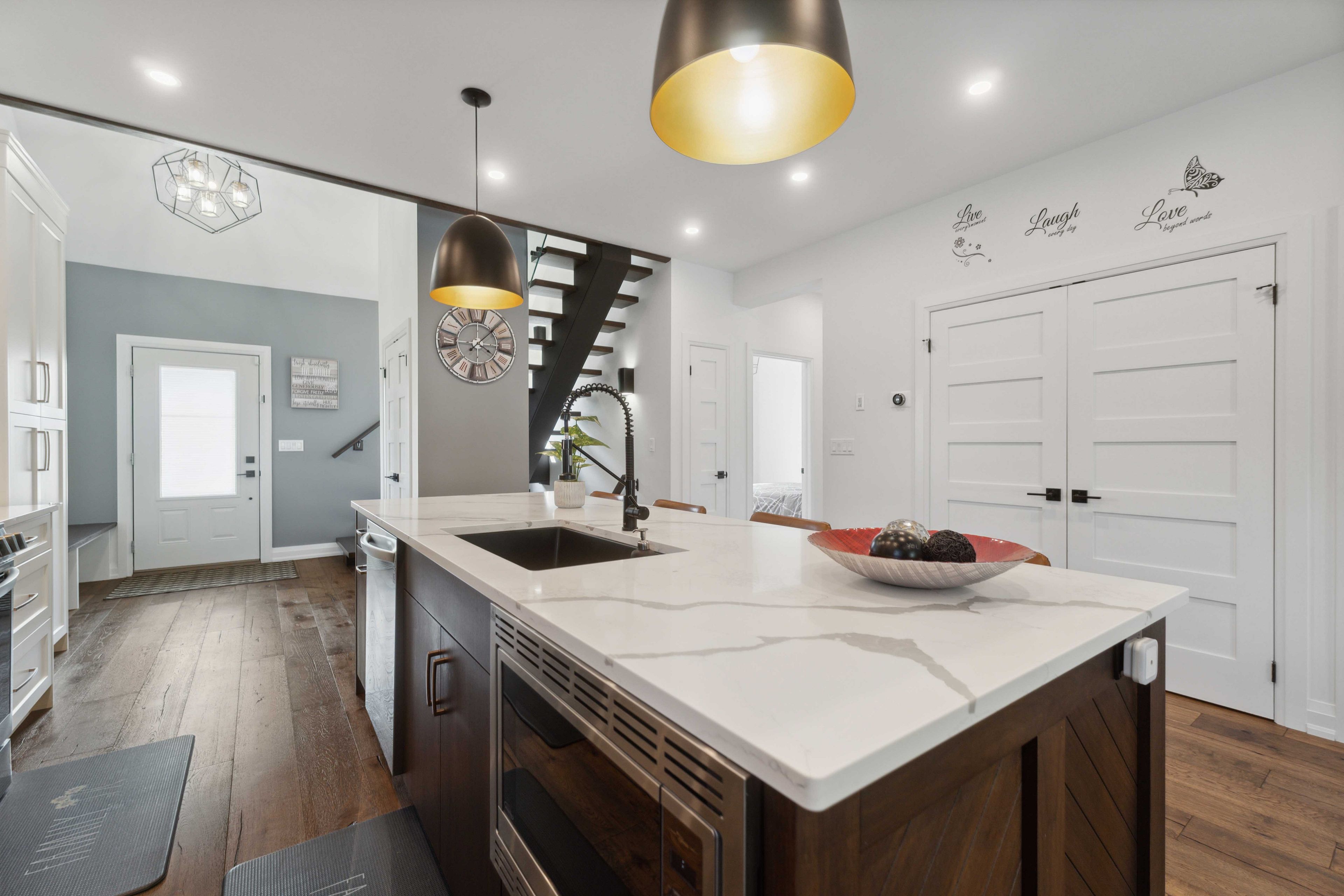 • Stylish two-tone kitchen with a large island and quartz countertops.