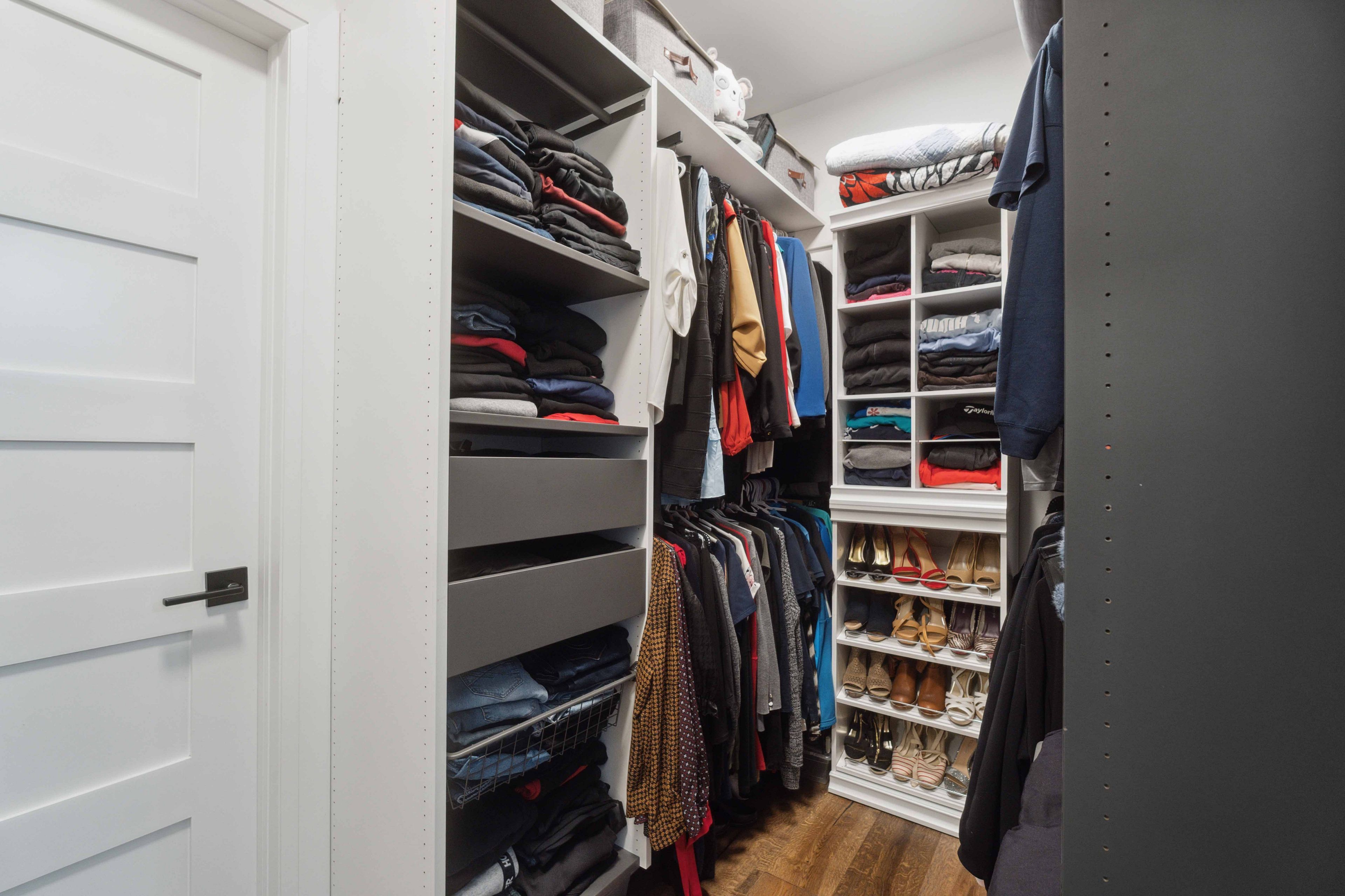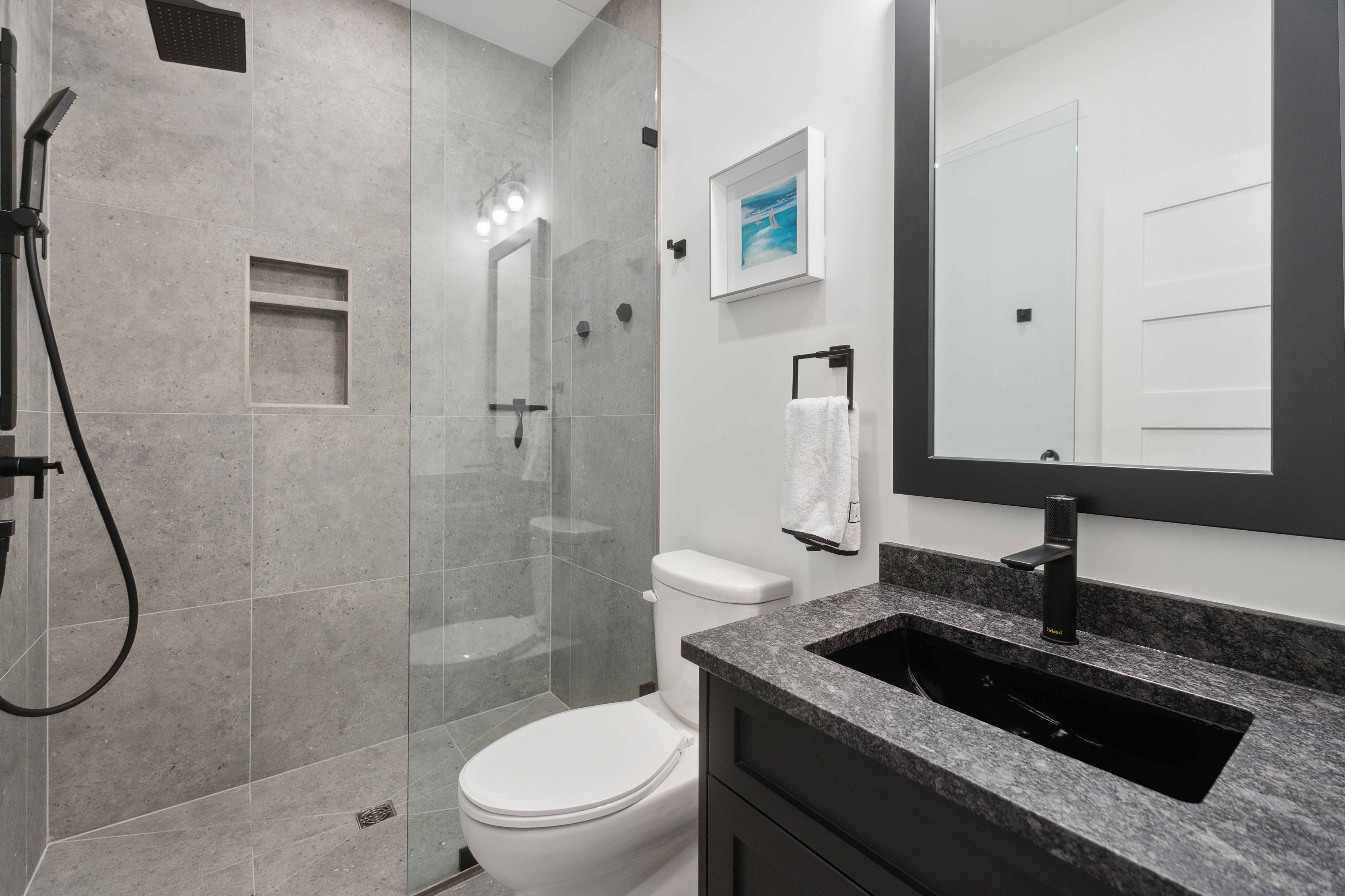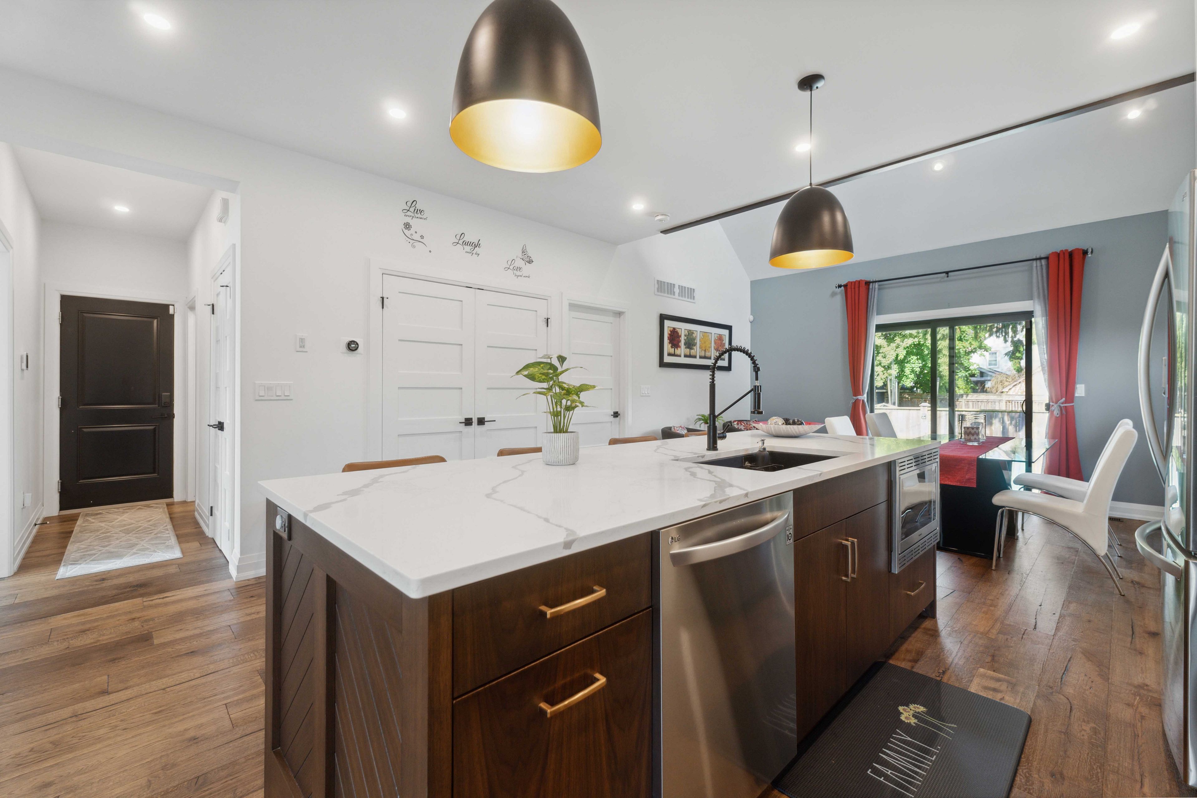 • Stylish two-tone kitchen with a large island and quartz countertops.