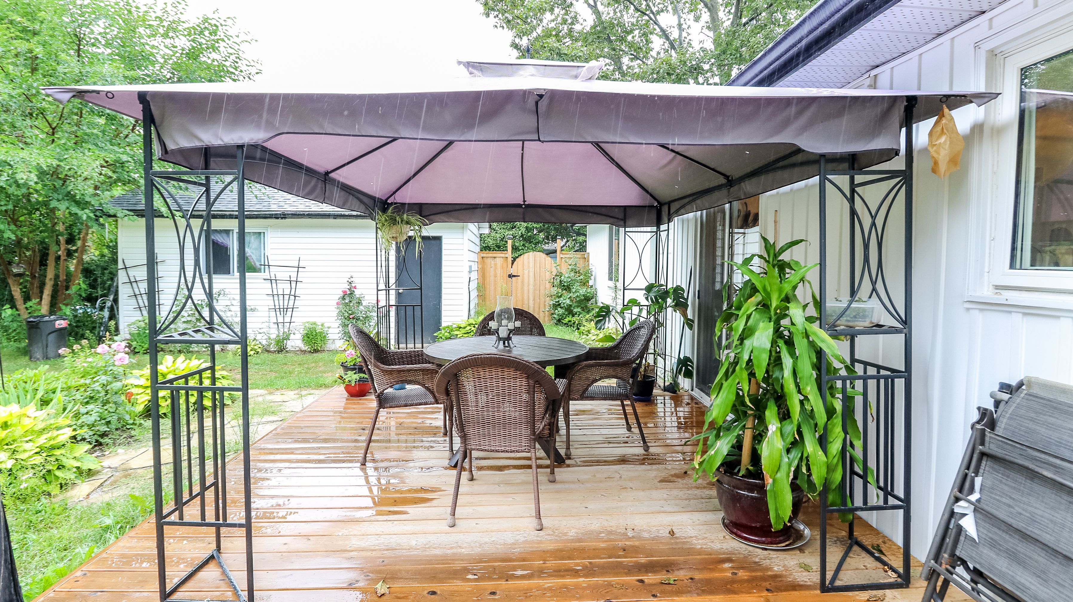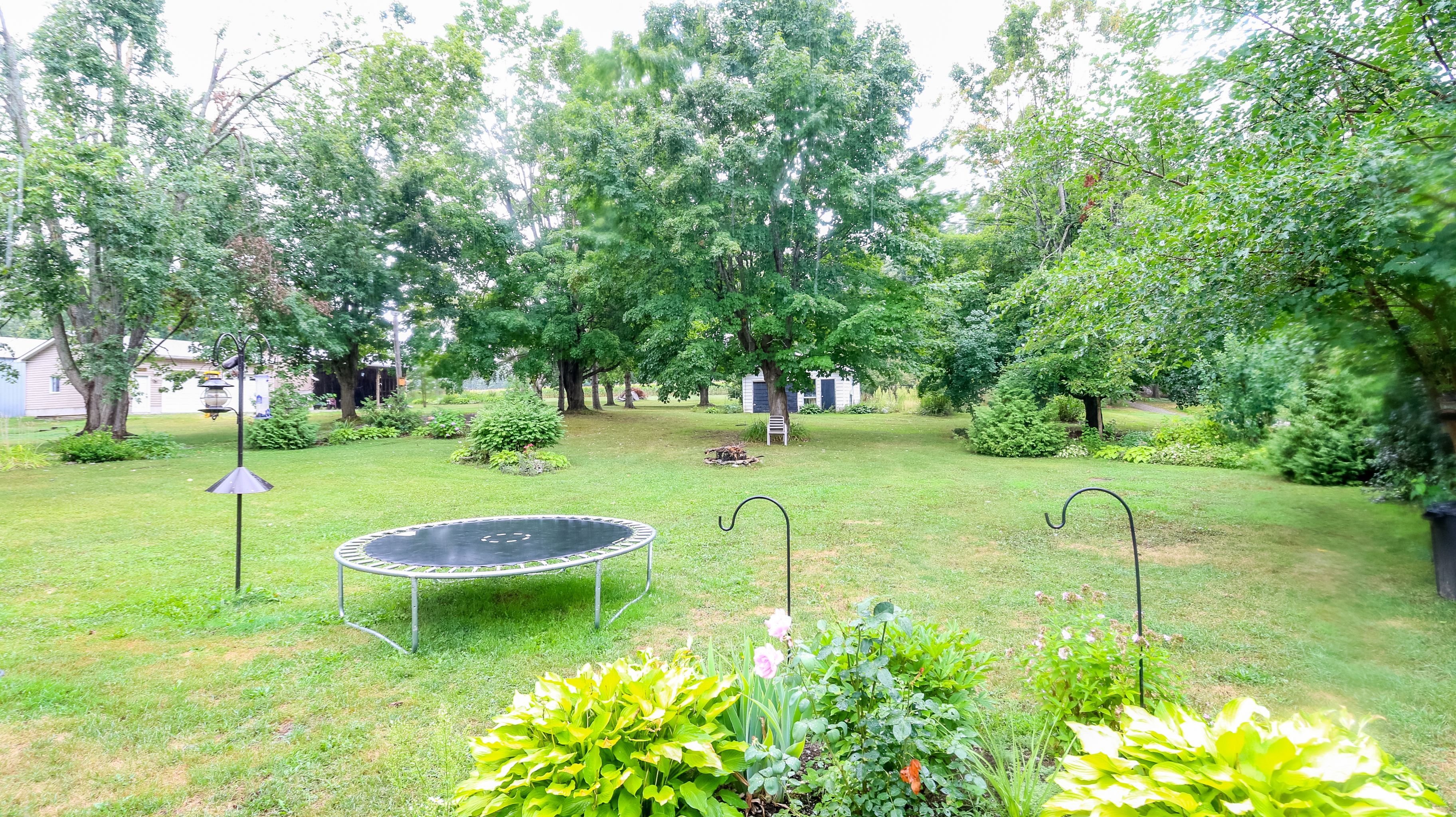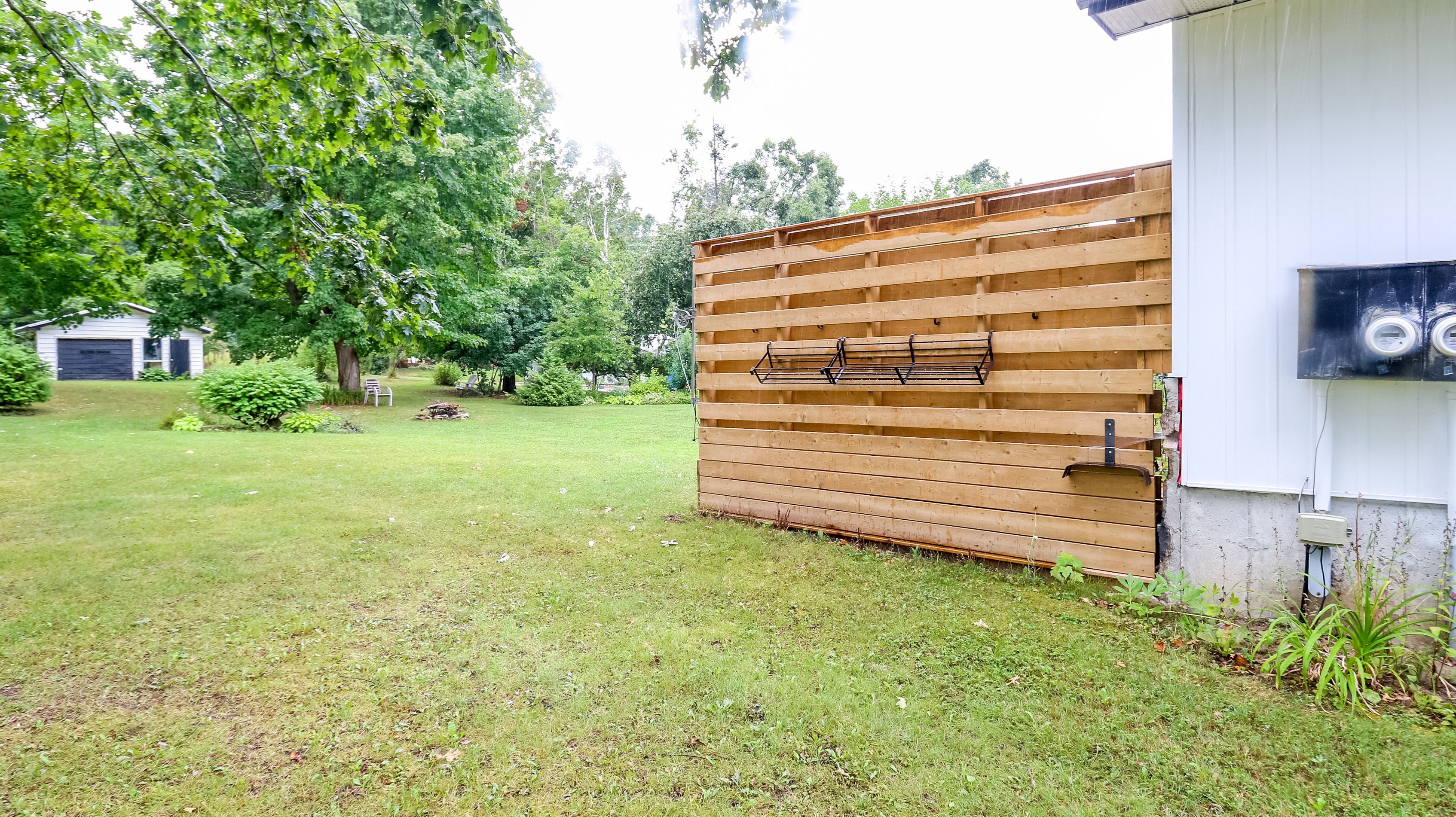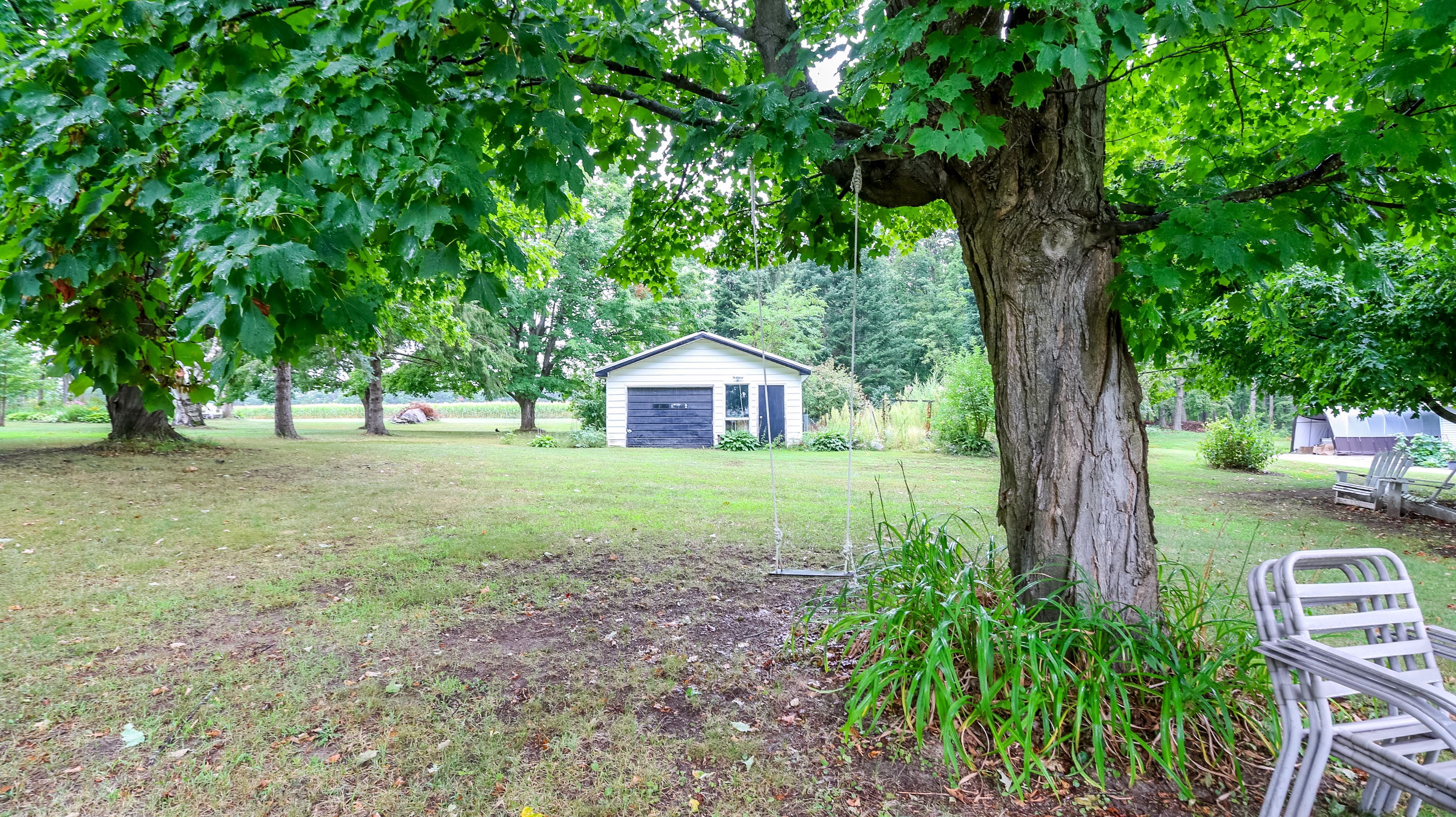 • Large backyard includes a two-tiered deck, shed, and garage.