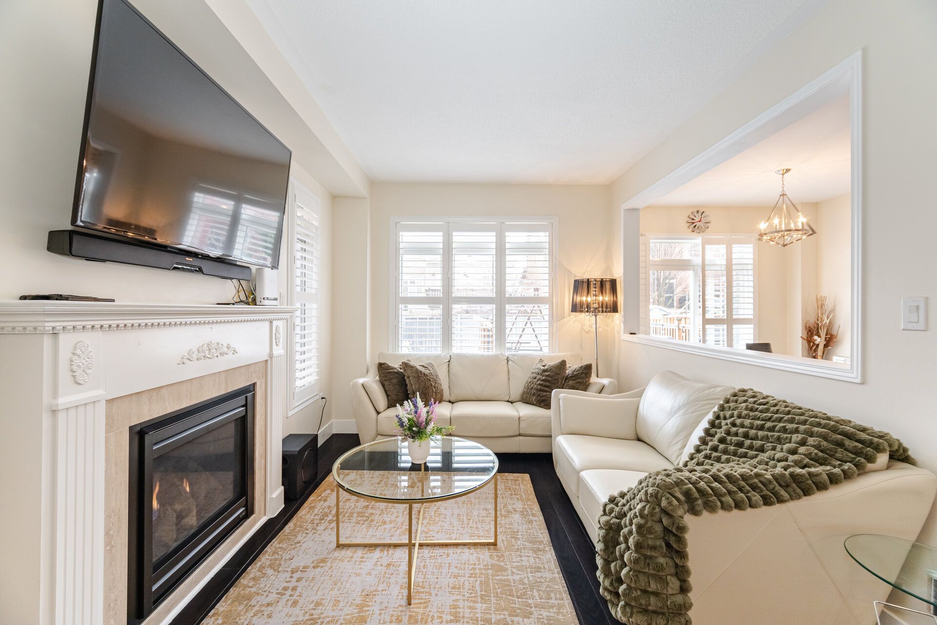 • Cozy living room with fireplace and hardwood flooring throughout.