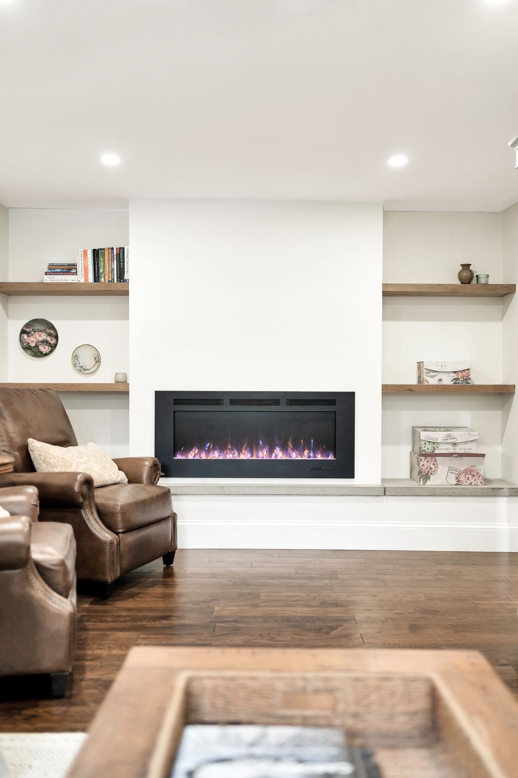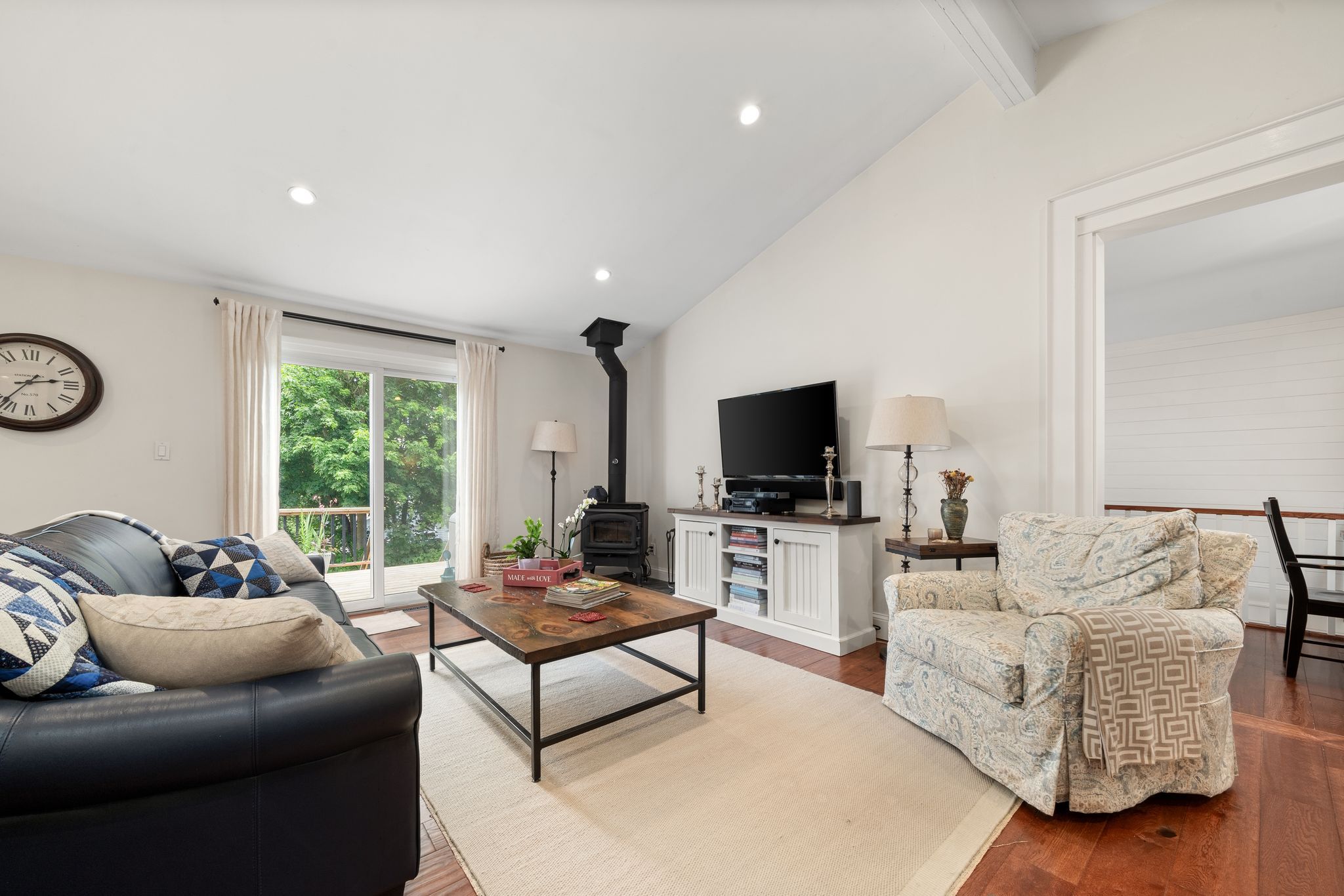 • Cozy living room featuring a WETT-certified wood stove and deck access.