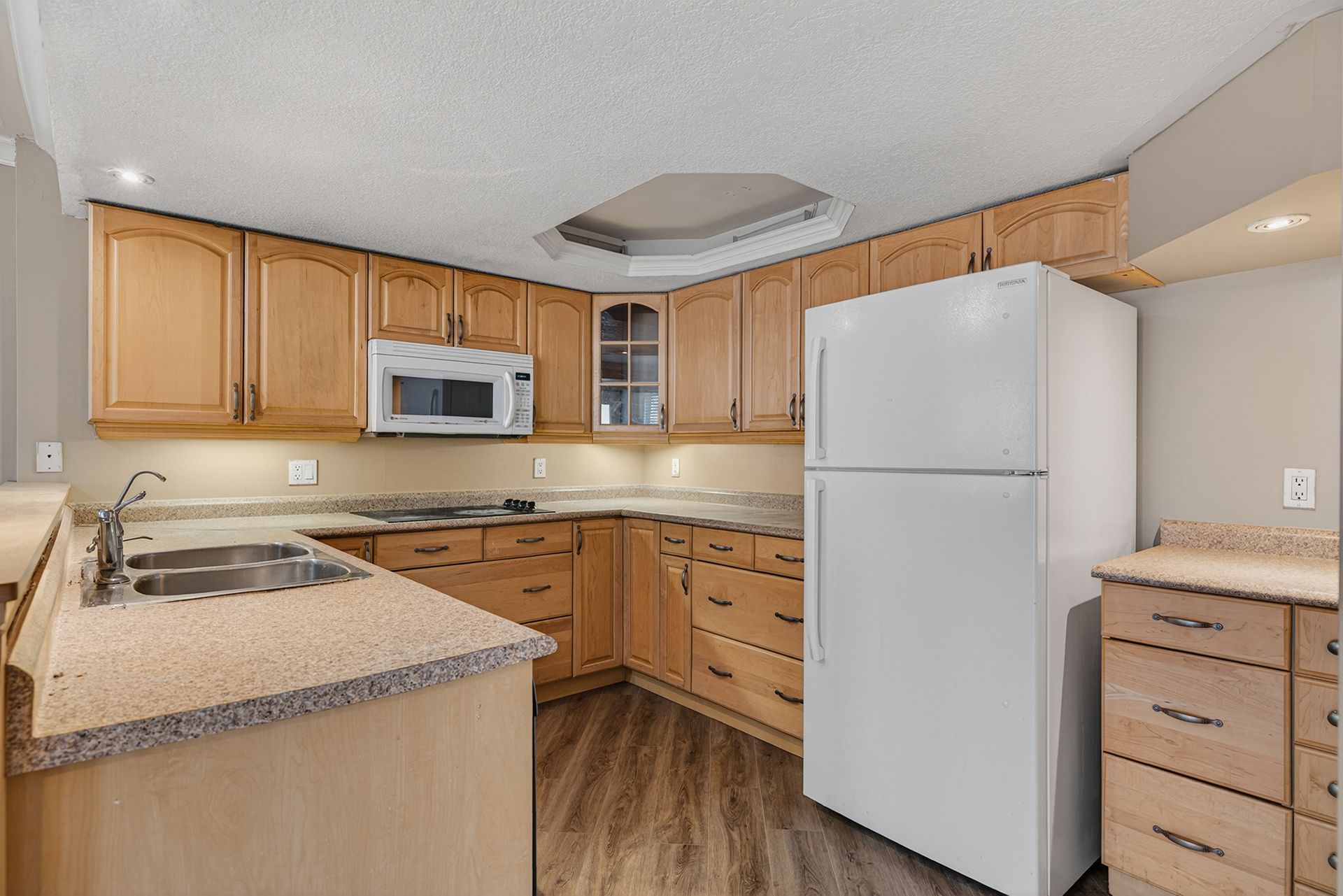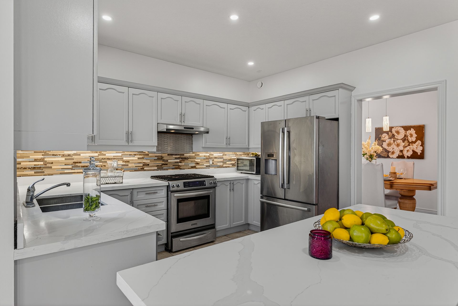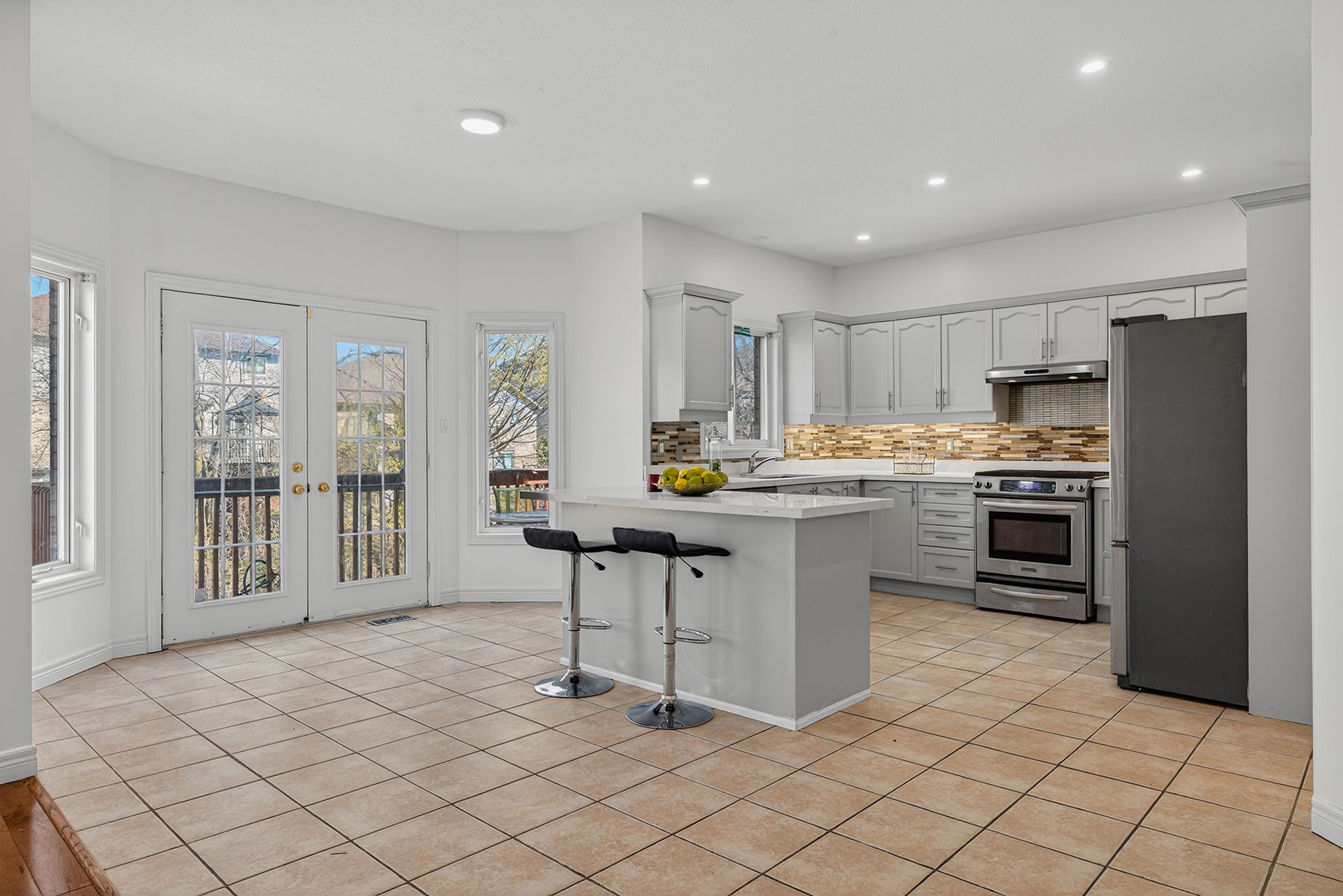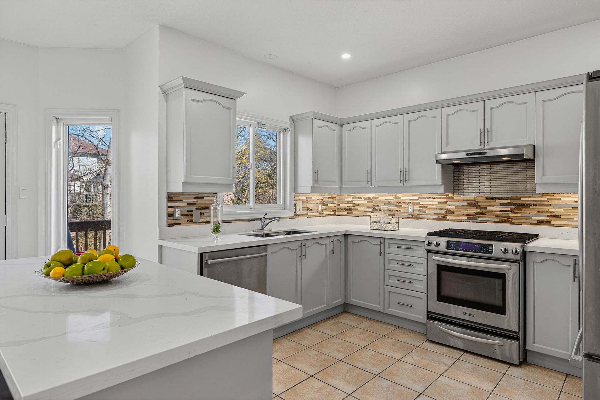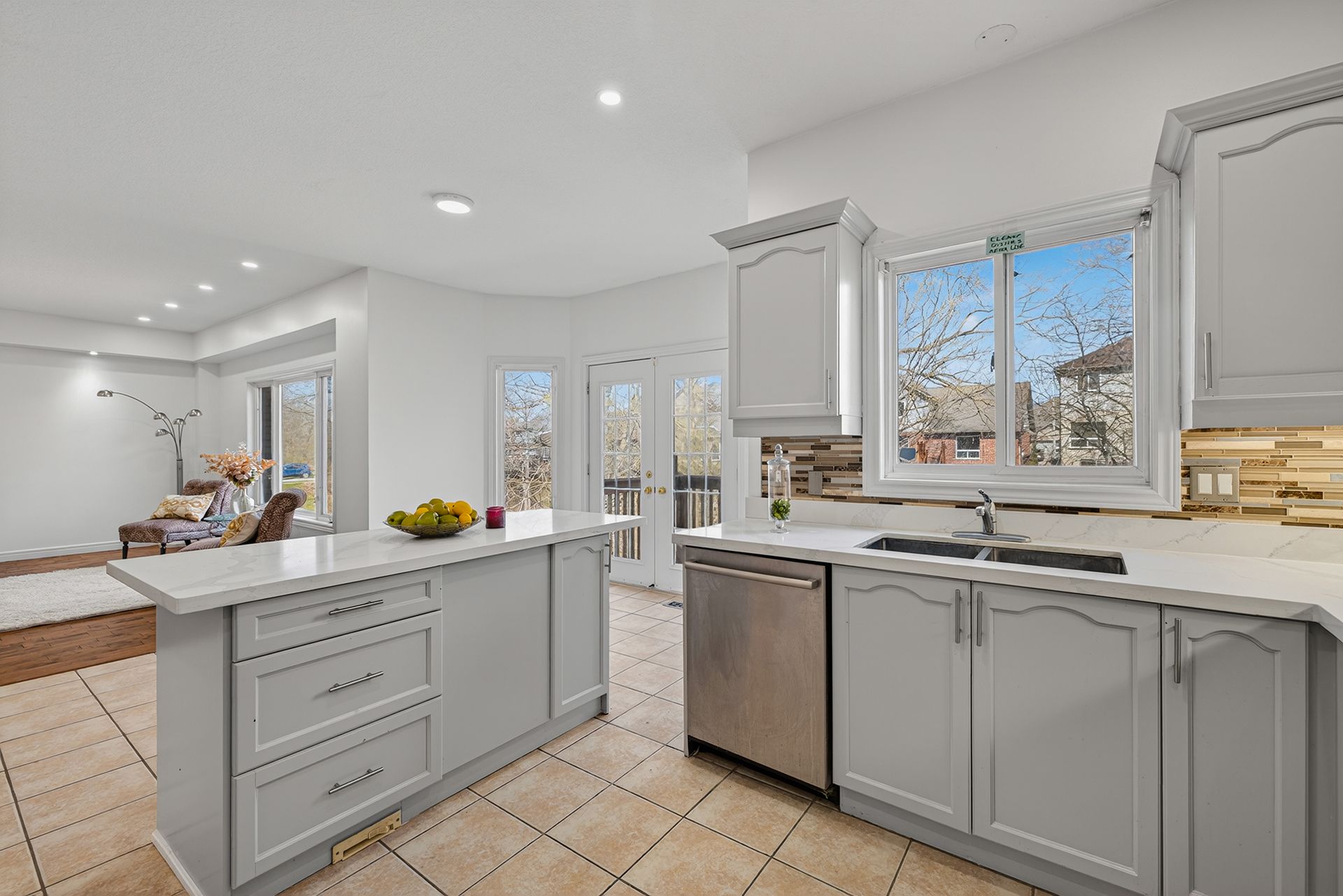 • Modern kitchen with quartz countertops and access to a serene deck.