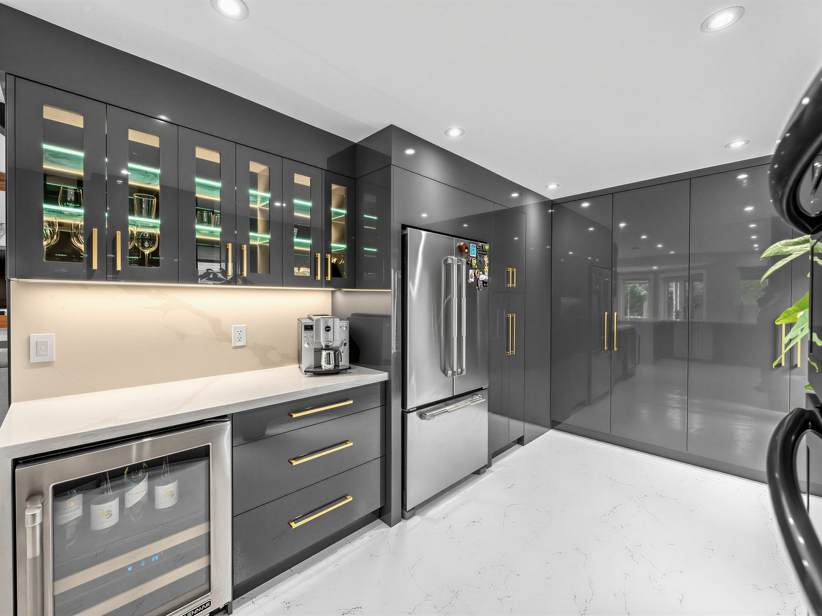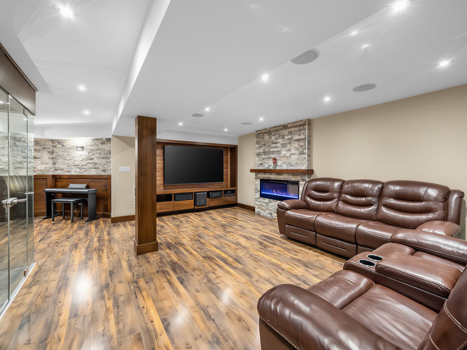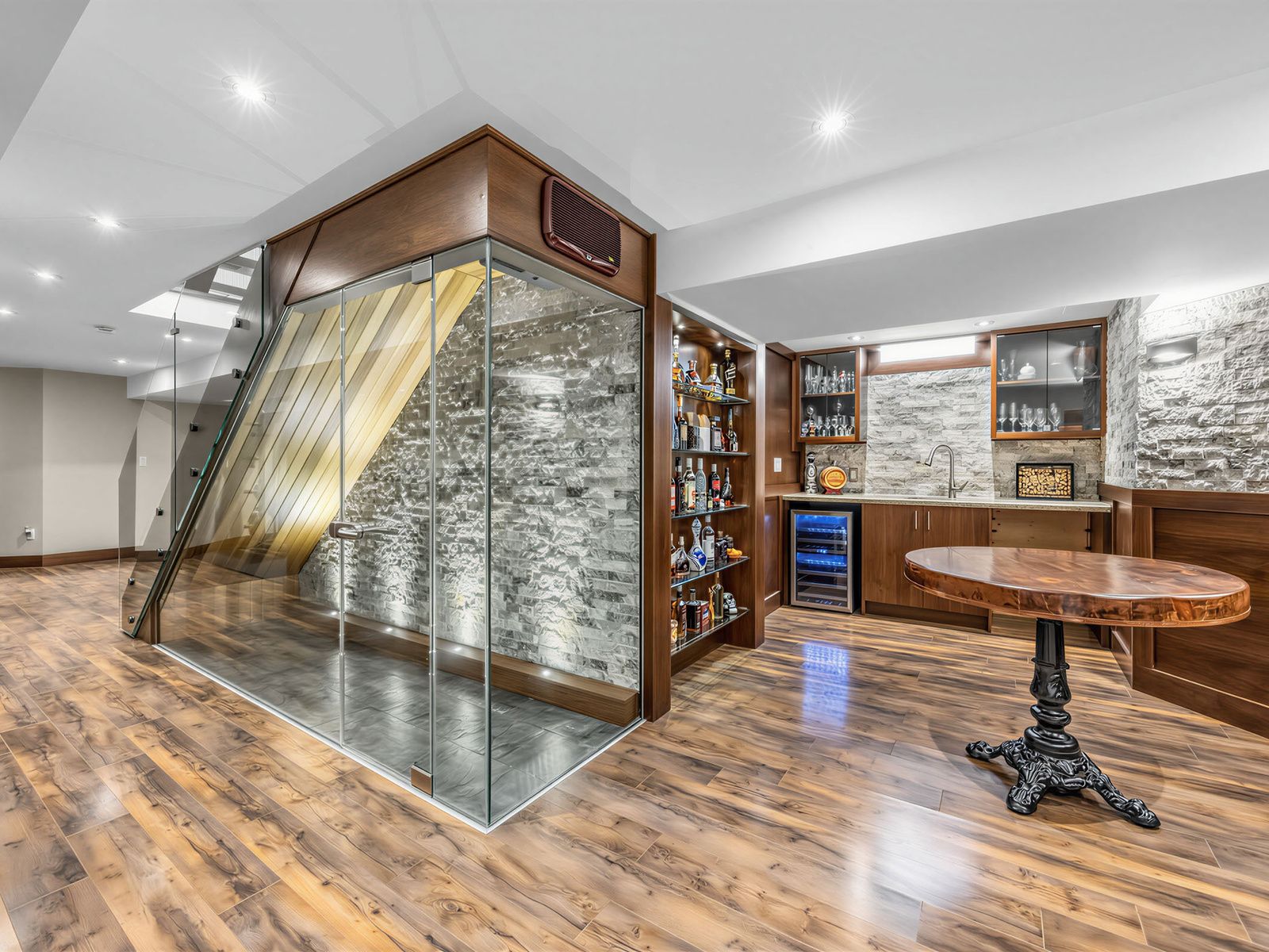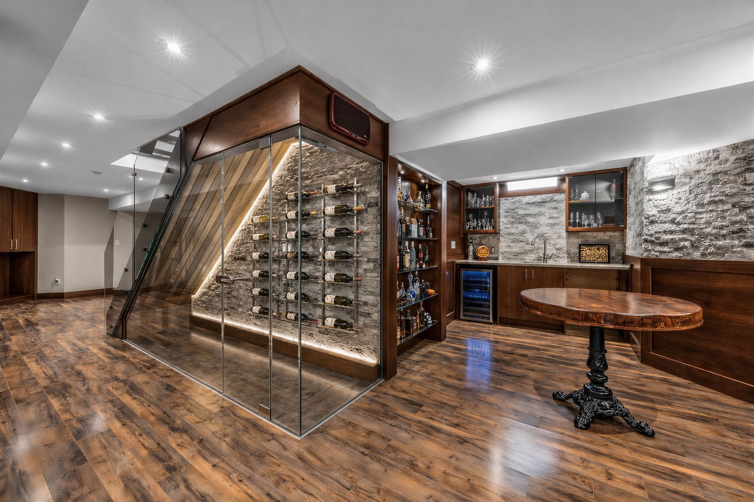 • Finished basement with a wine room, bar, and audio-visual entertainment wall.
