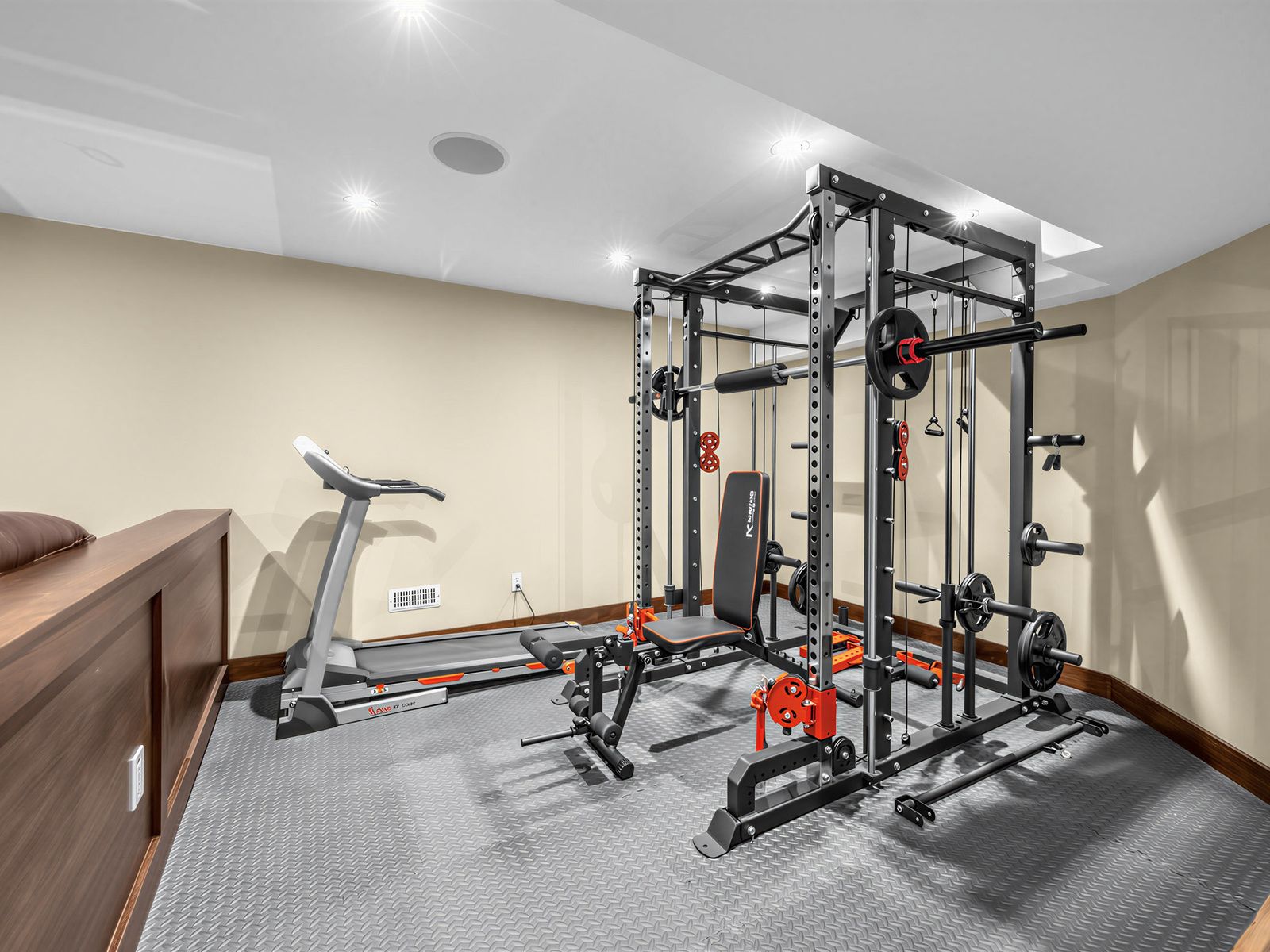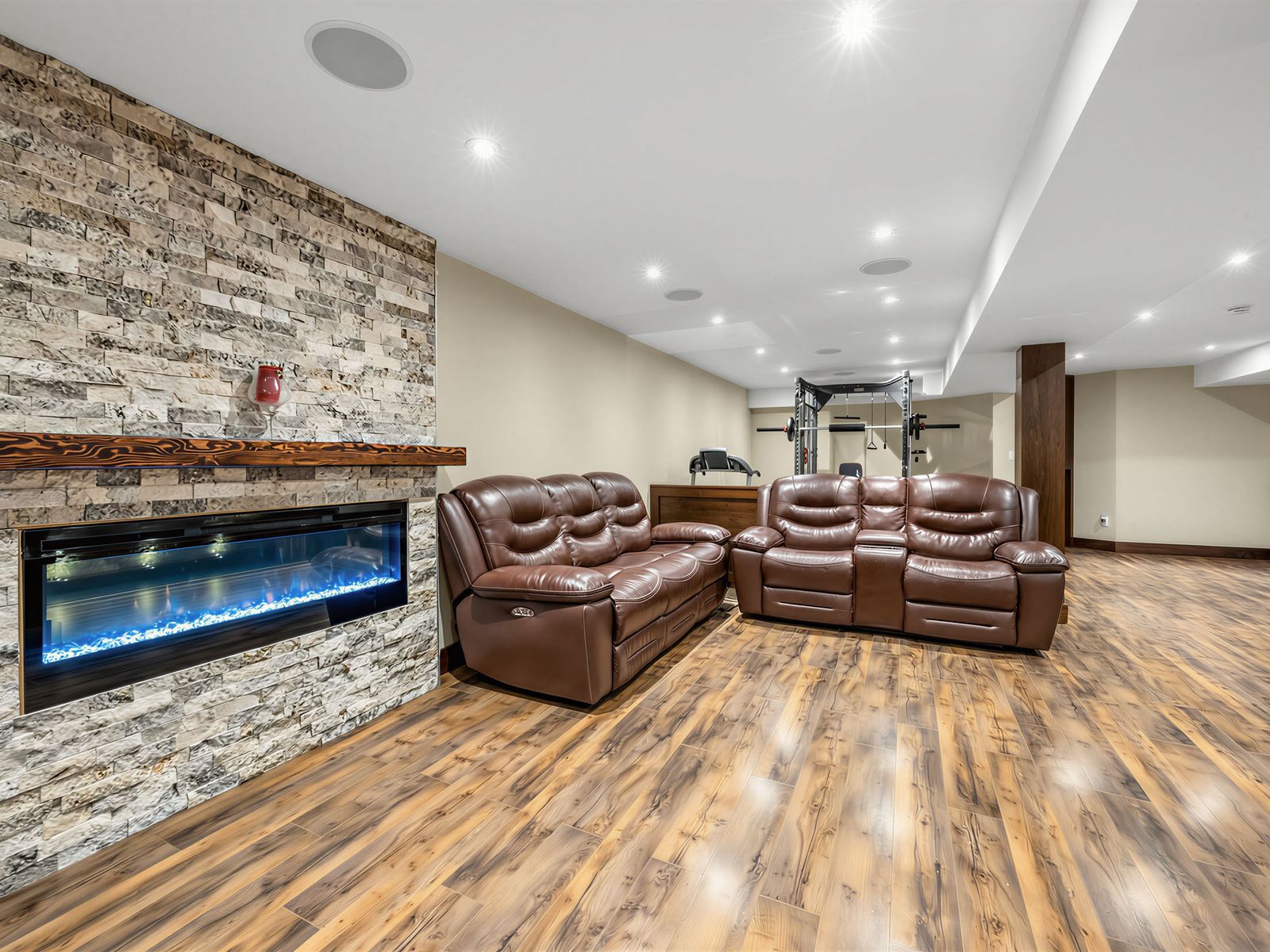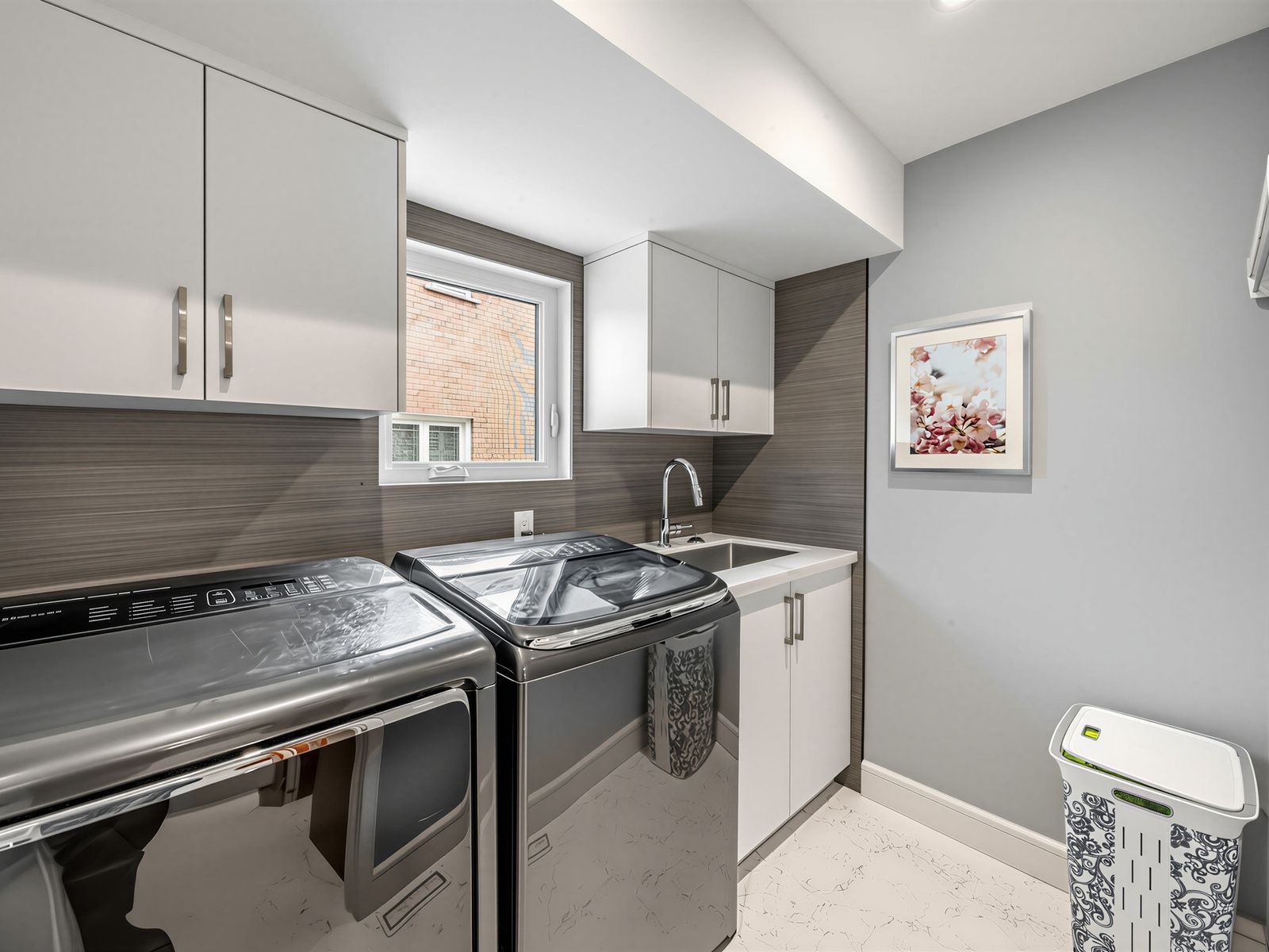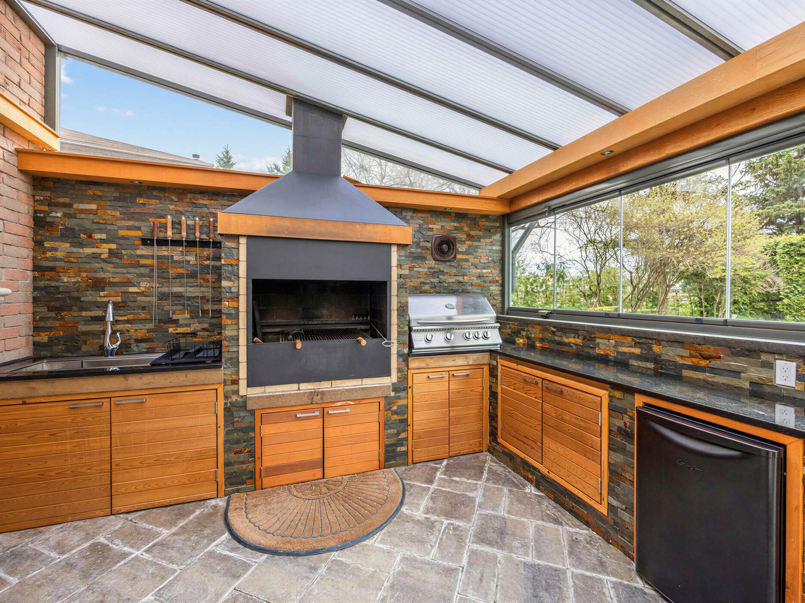• Finished basement with a wine room, bar, and audio-visual entertainment wall.