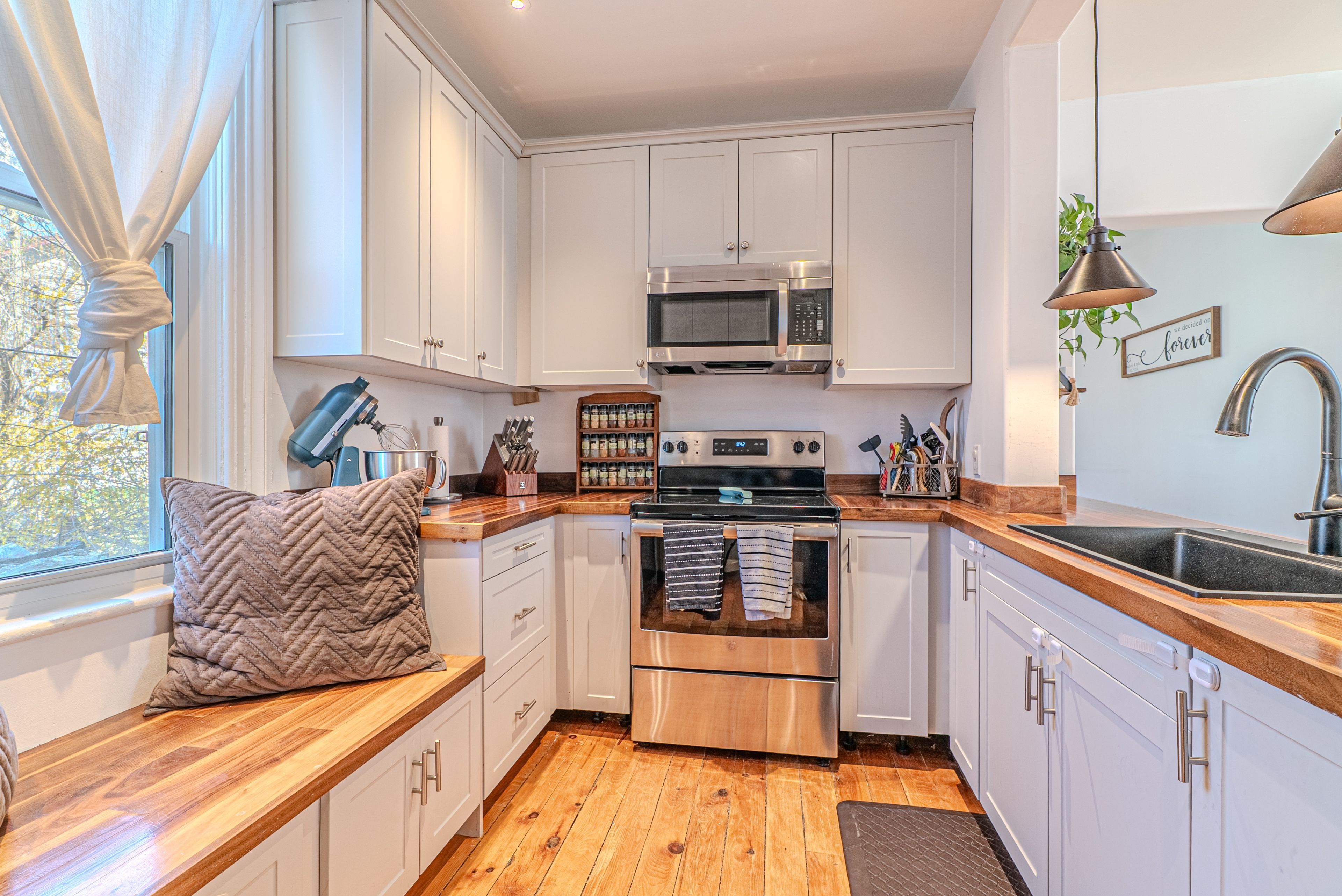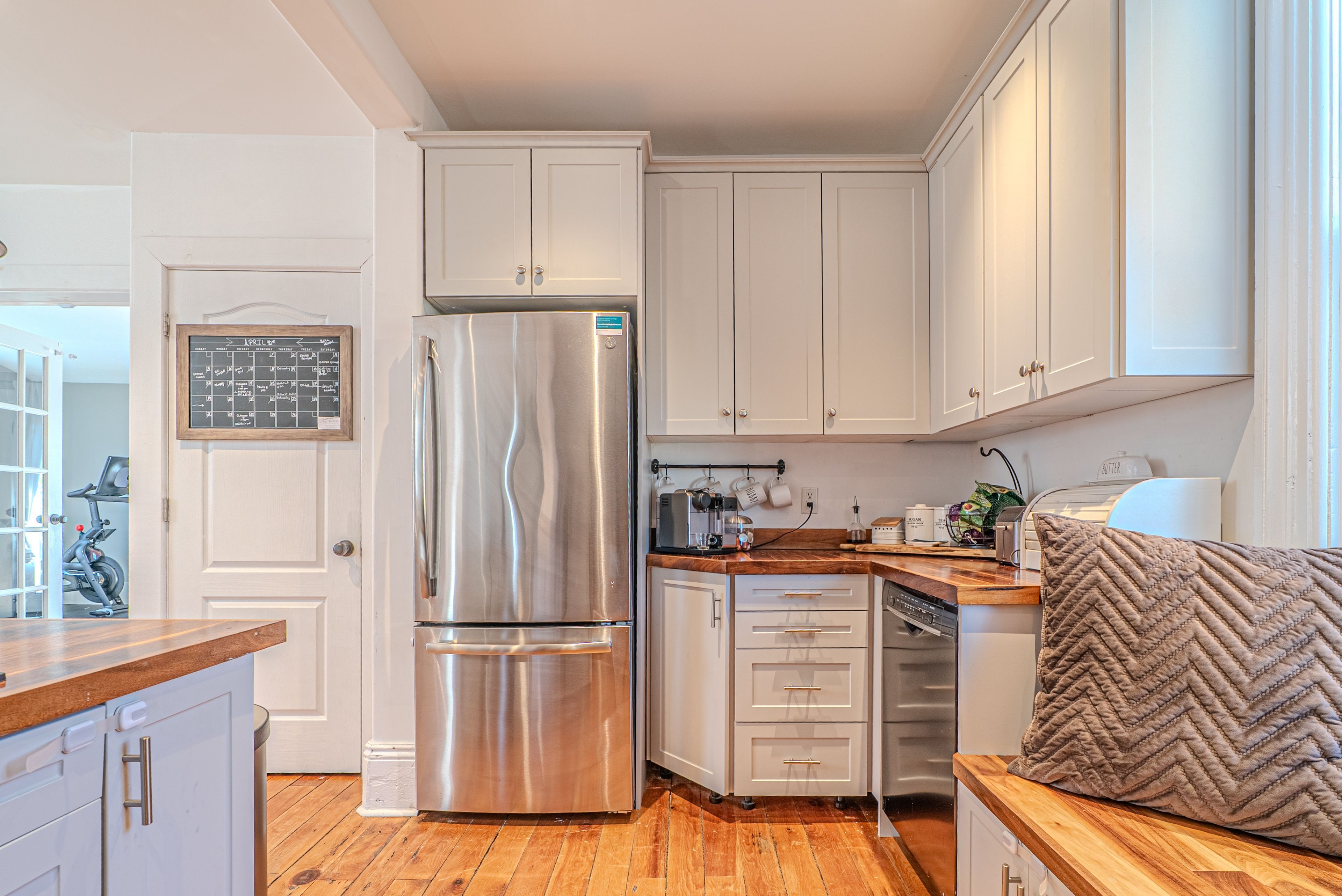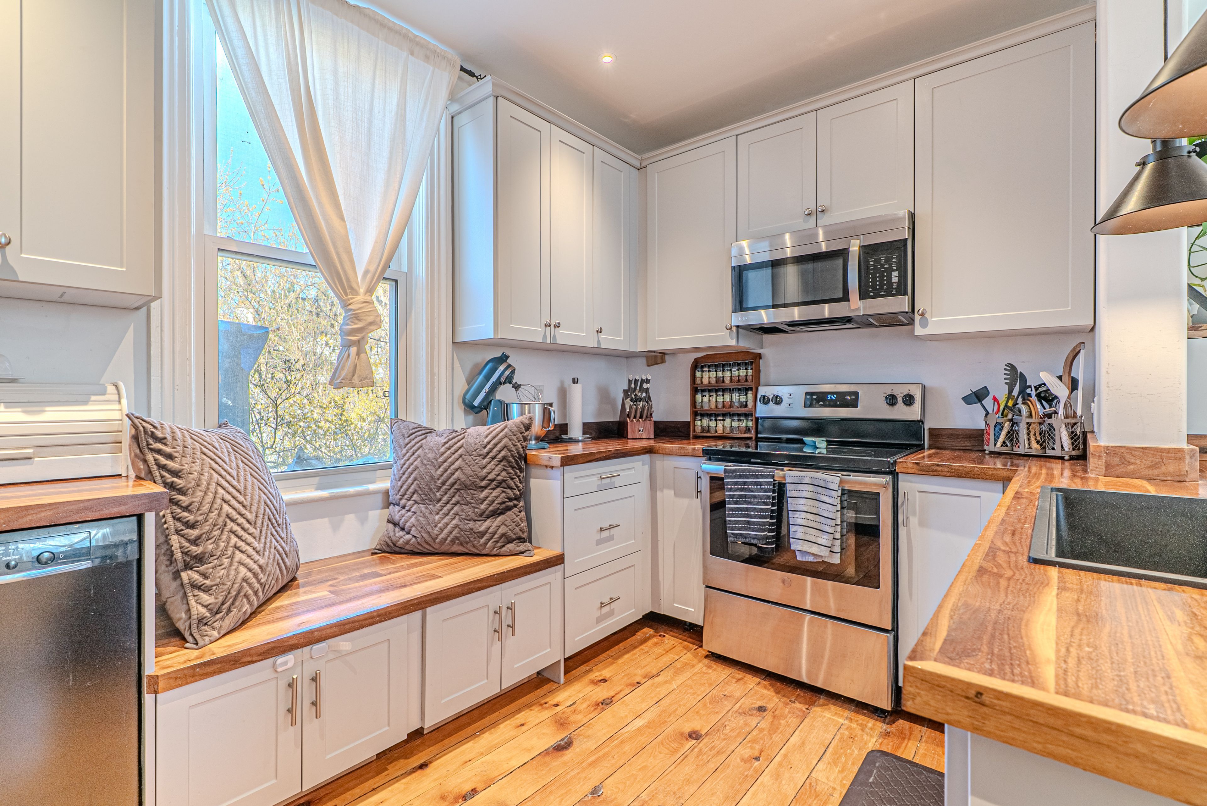 • New eat-in kitchen features custom walnut countertops and ample cabinetry.