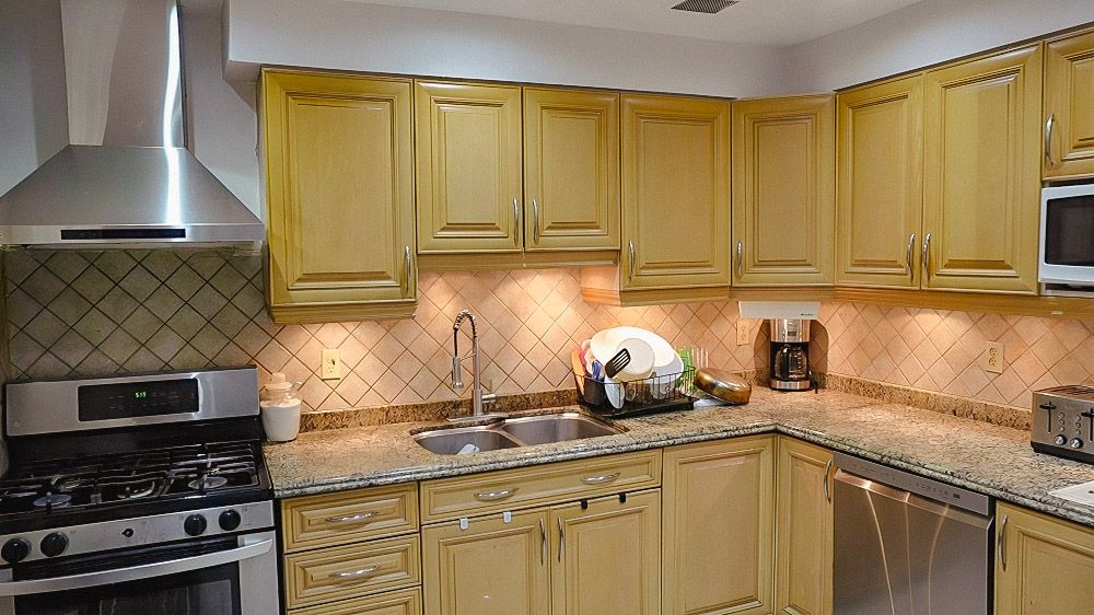 • Modern kitchen with granite countertops and direct access to a large backyard.