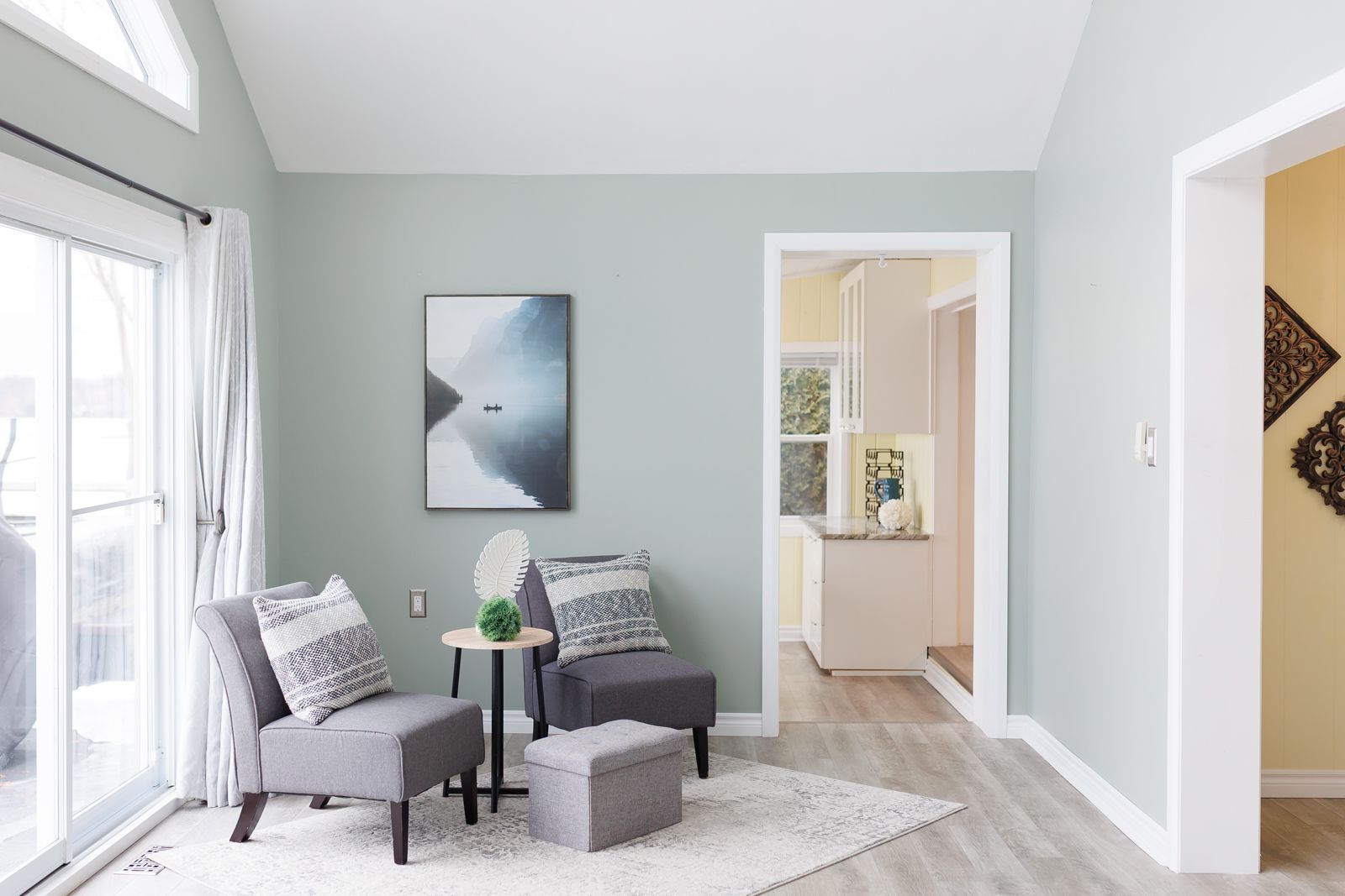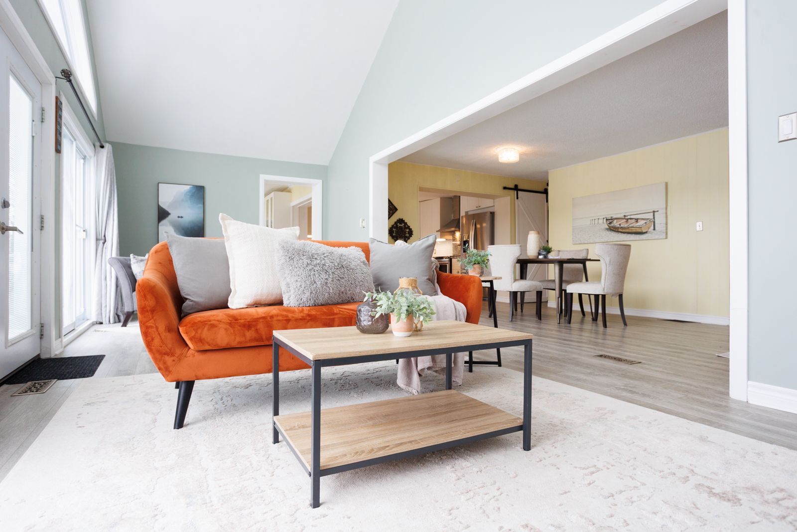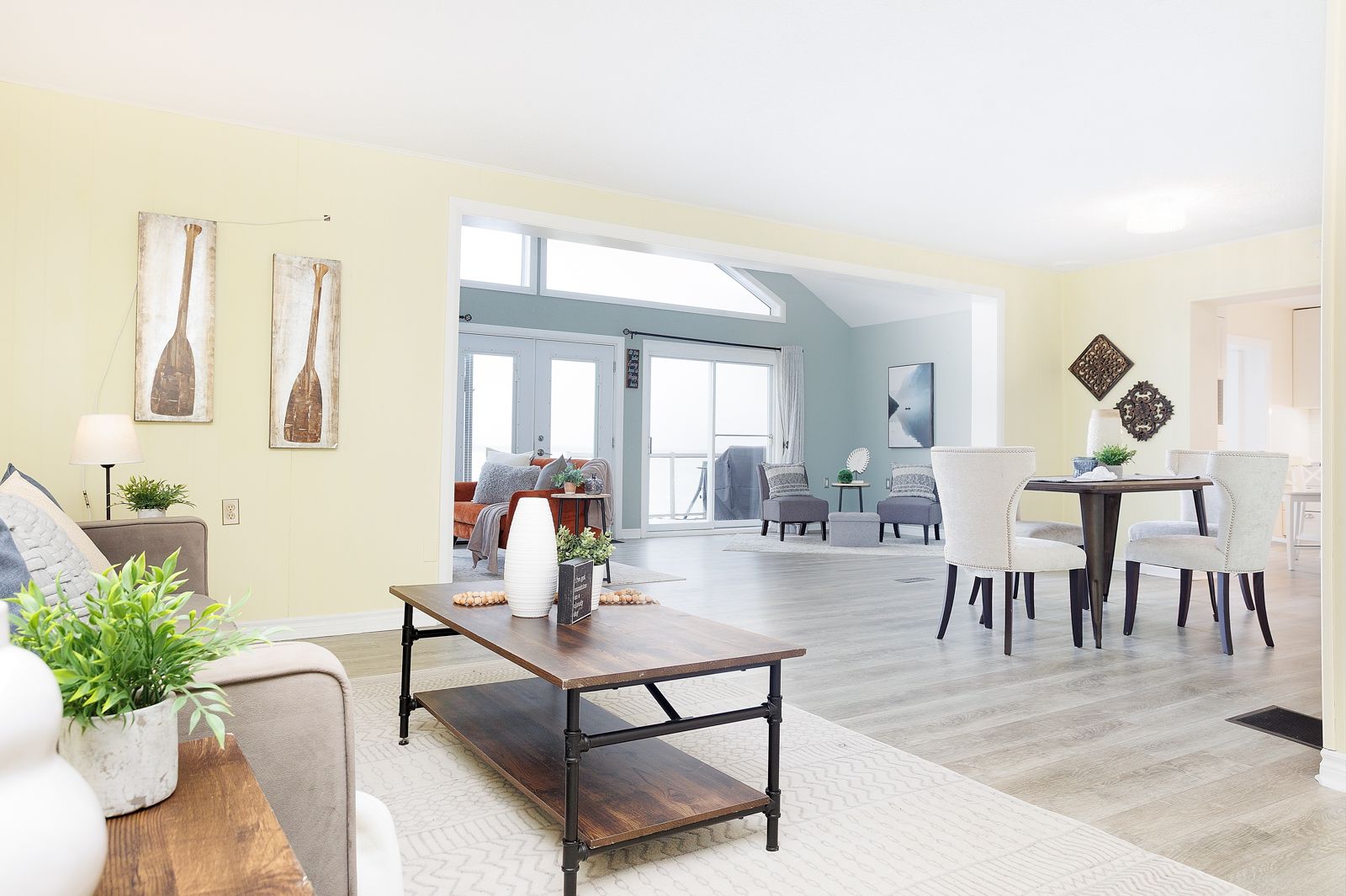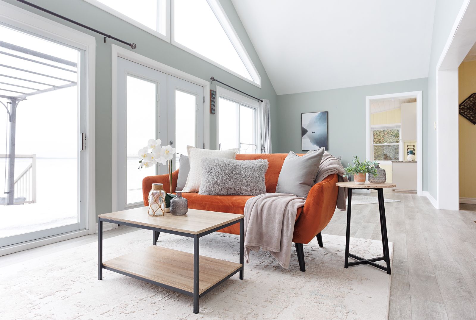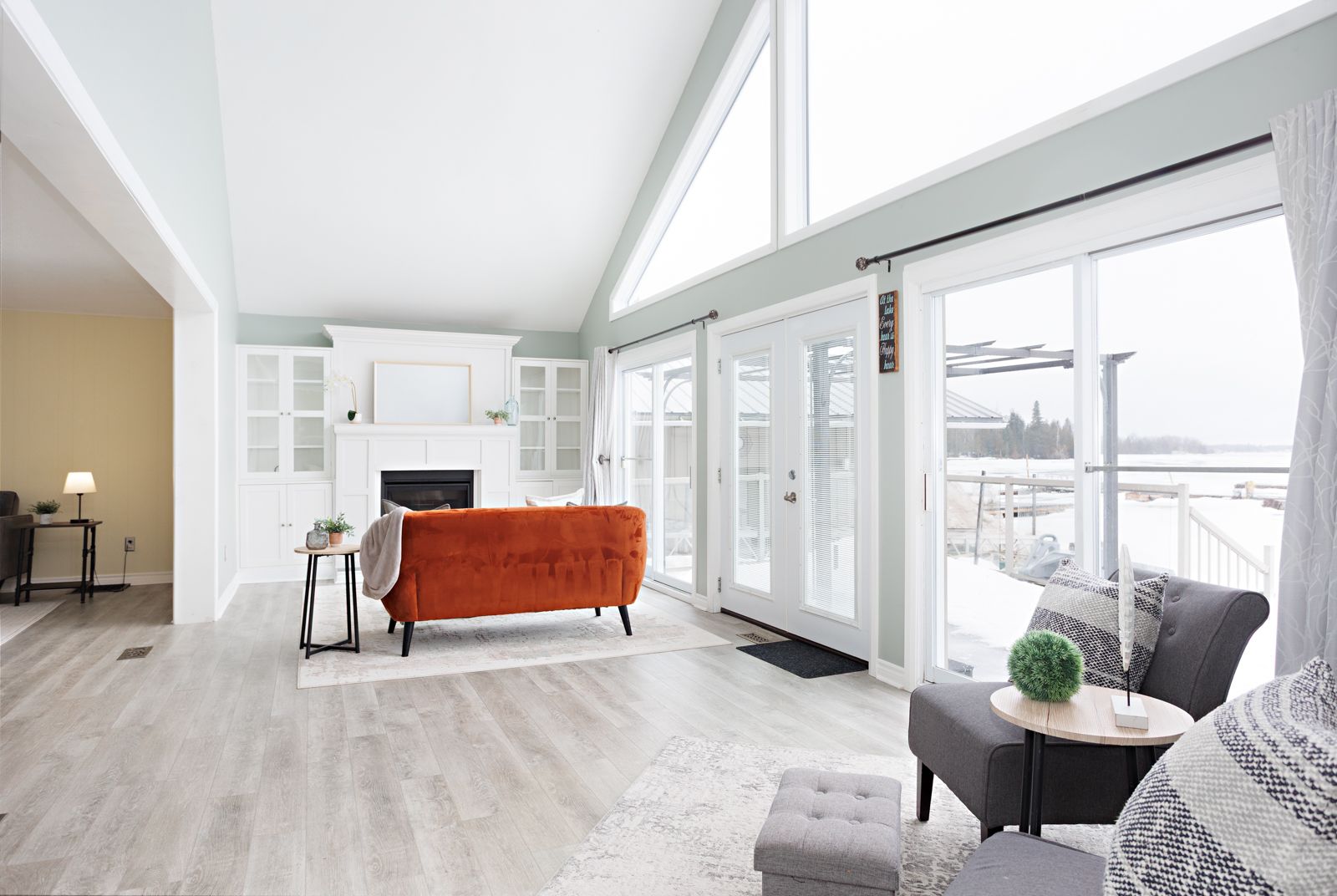 • Bright, open living space with large gable windows for natural light.